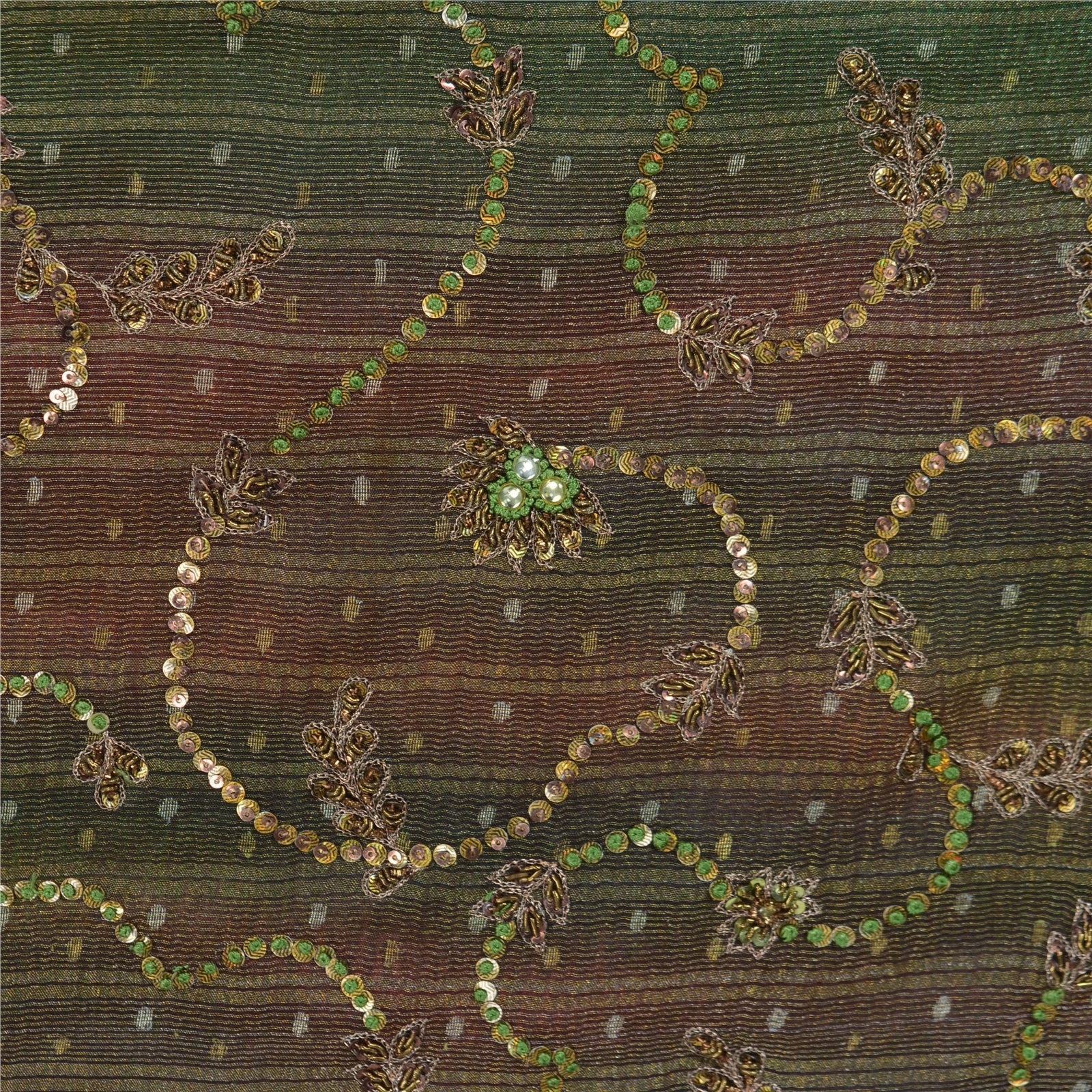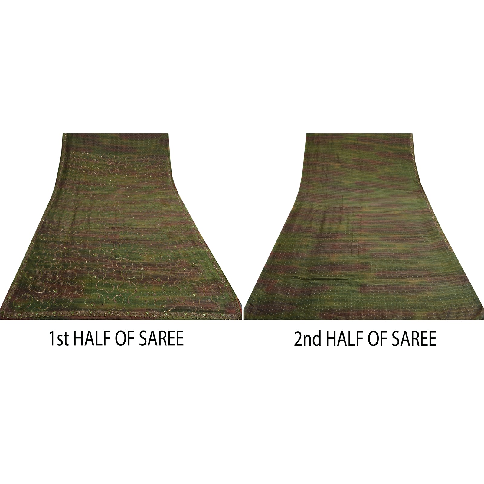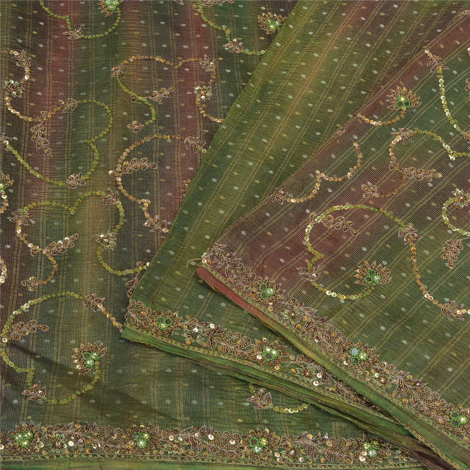 An Awesome Special Sari In Pure Silk Green Colored Hand Embroidered Woven Tie-DYe Sustainable Fabric. Pallu & Border Features floral design embellished with metallic golden zari/zardoz work, golden/green designing sequins, kundan stones work. You Can See Center Portion Of Sari Fully Covered similar Tie-dye & golde woven & sequins work with floral design. This unique vintage saree can be used for various crafting ideas for example design a dress, use it as a throw, as window dressing, upholstery, table linen and much more. Let your creative juices flow and use this decorated Sustainable Fabric in multiple fashion. International buyers please note: Import duties, taxes, and charges are not included in the item price or postage cost. These charges are the buyer's responsibility. Please check with your country's customs office to determine what these additional costs will be prior to bidding or buying. Buyer will pay custom duty/tax. It is calculated and charged differently by every country. As a seller I do not have any control over it.VAT or sales tax is calculated by the platform at the time of checkout. Customs charge is payable at the time of delivery.