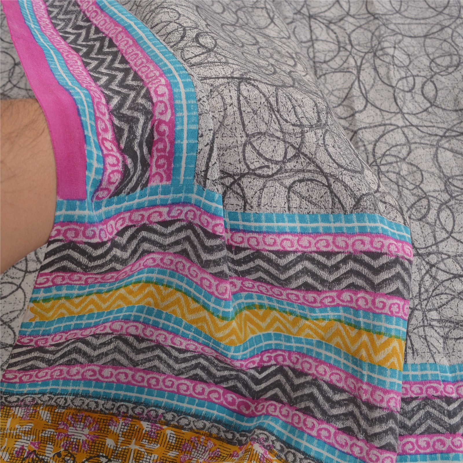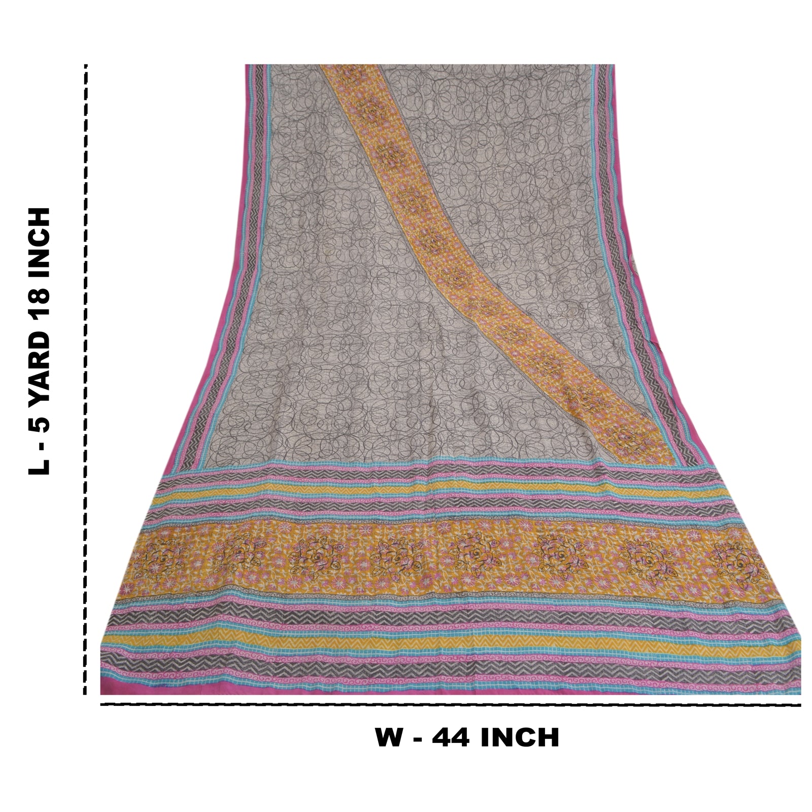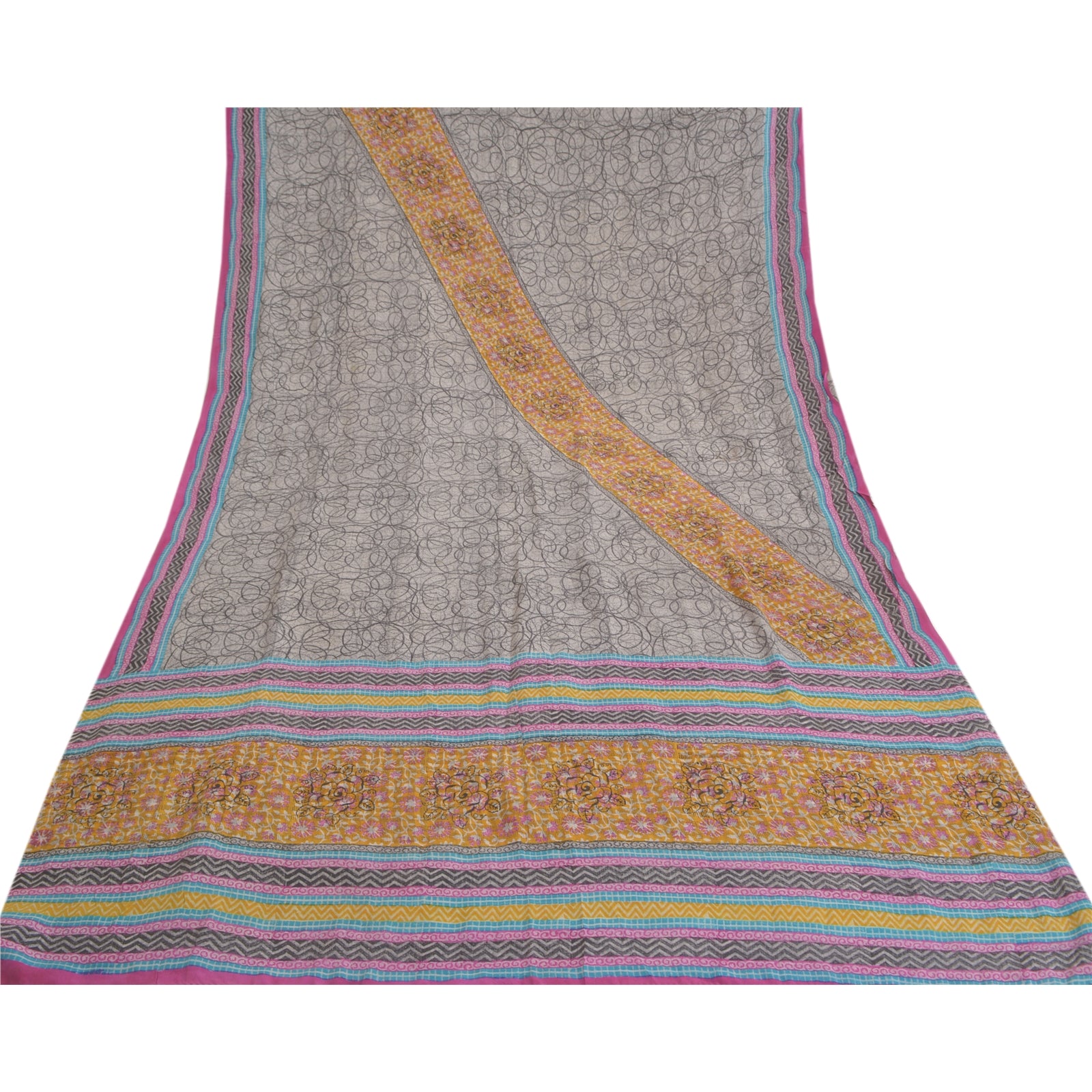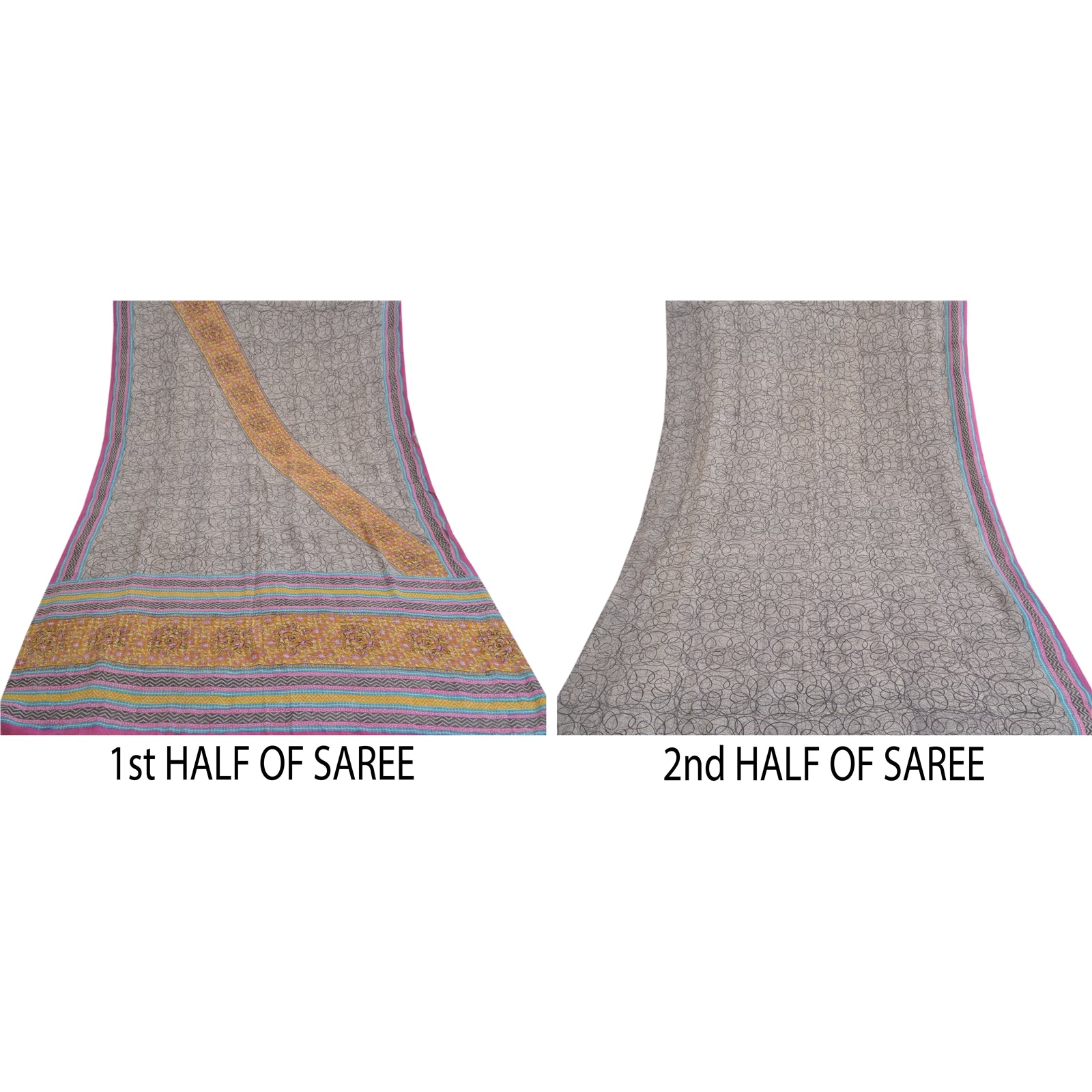 Sanskriti Vintage Grey Sarees 100% Pure Crepe Silk Printed Sari Craft Sustainable Fabric