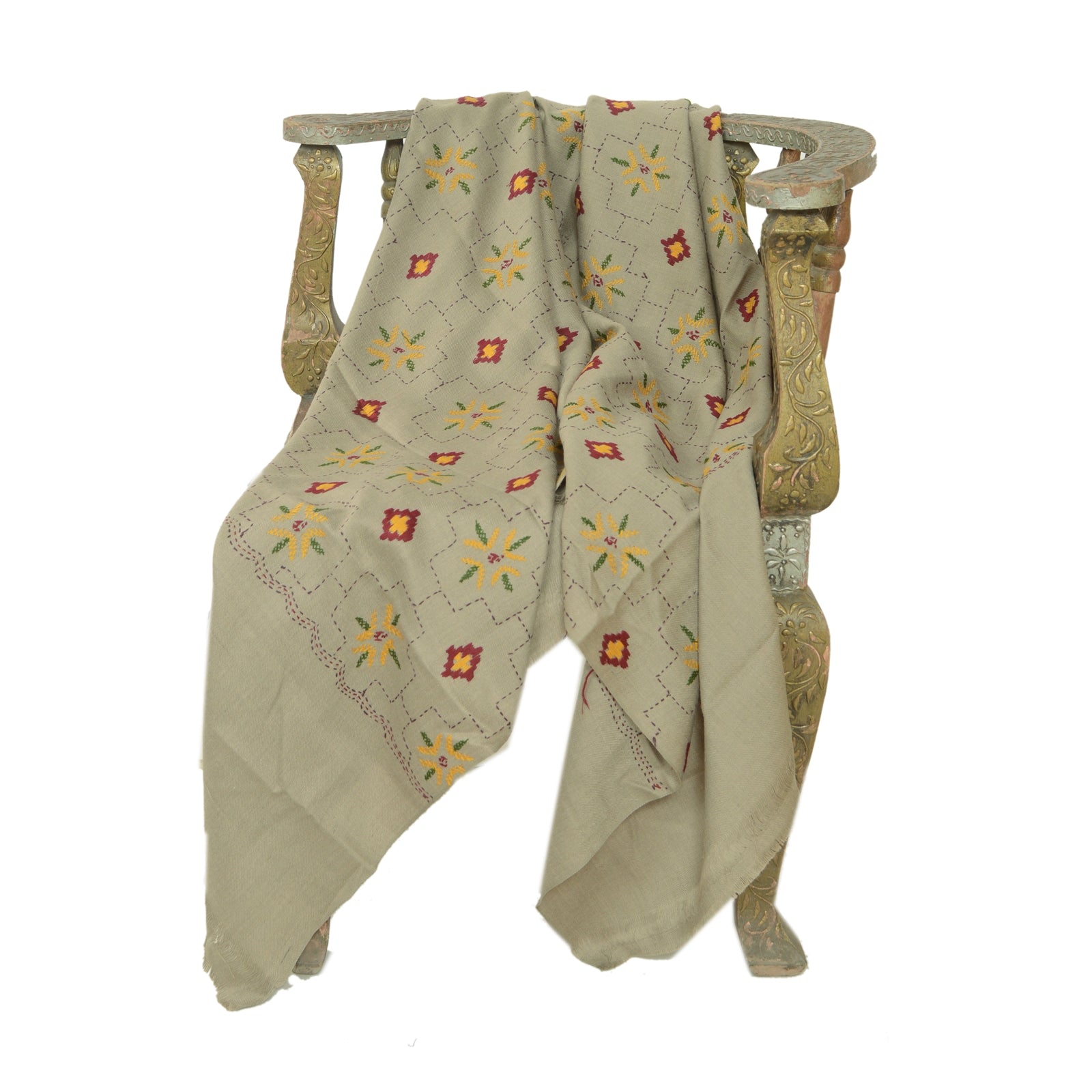 Sanskriti Vintage Grey Woollen Long Shawl Hand Embroidered Throw Stole Floral