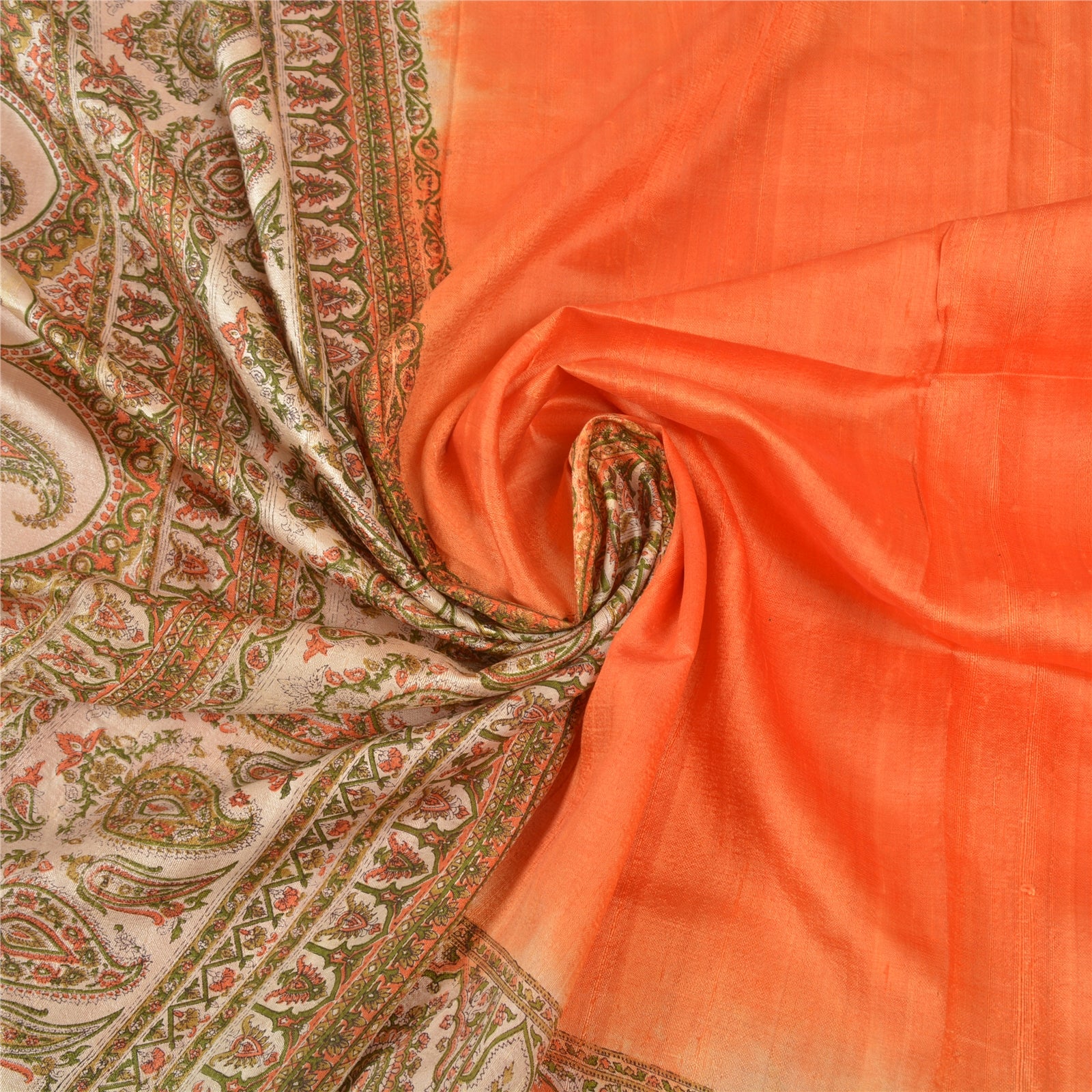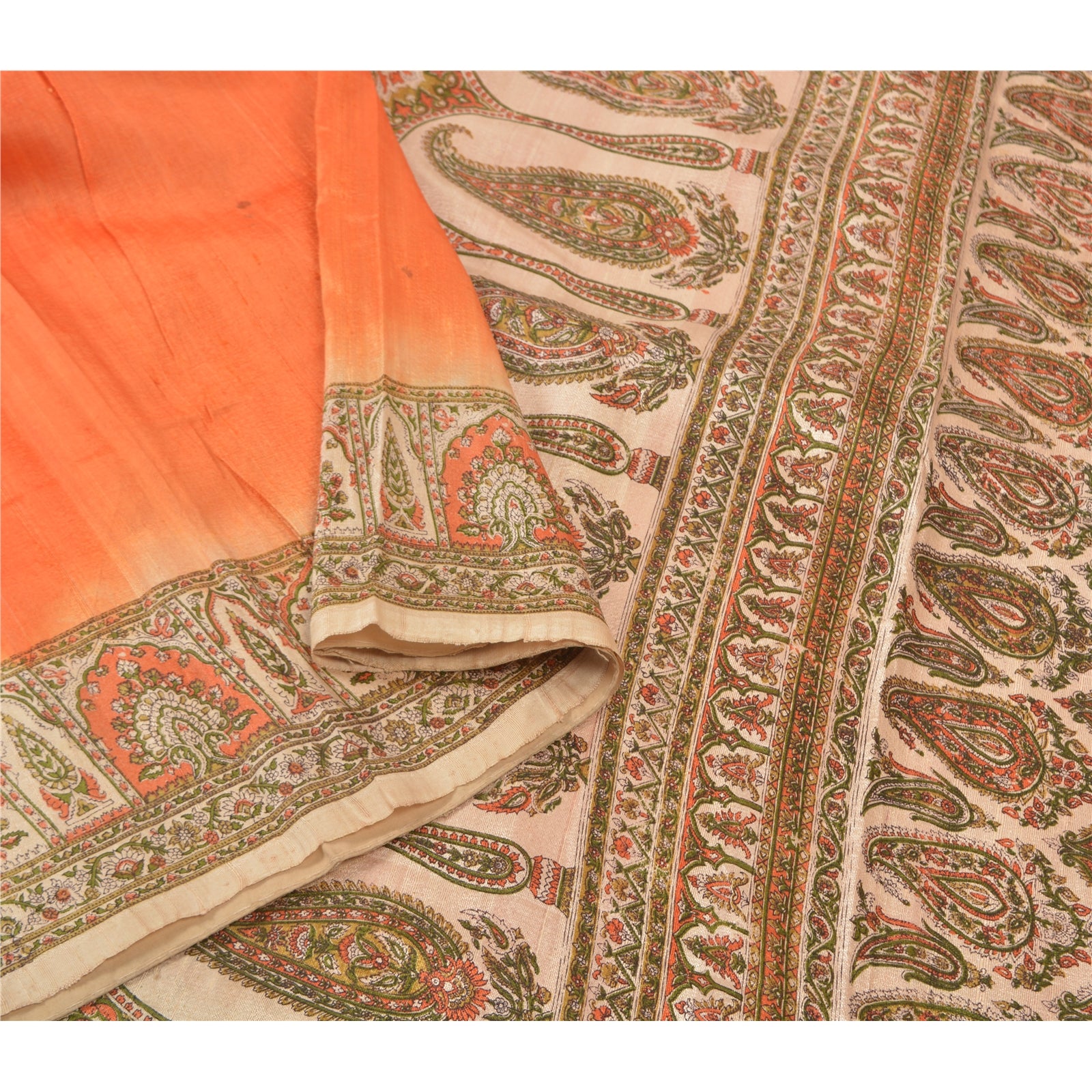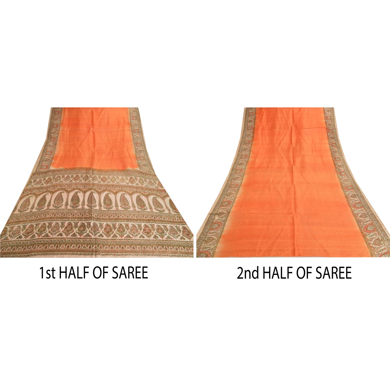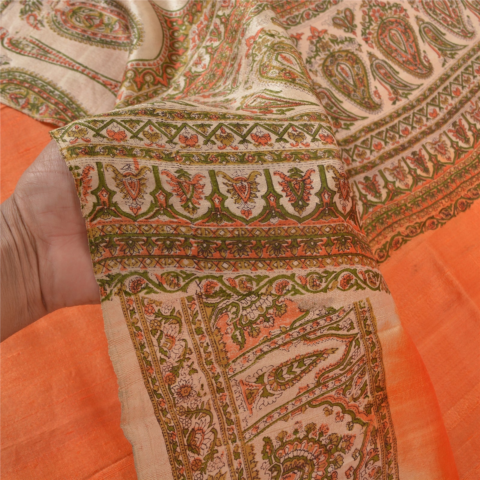 Sanskriti Offers This Vintage Orange & Cream Color Handloom Printed Heavy Saree Which Is Crafted With 100% Pure Silk Base Sustainable Fabric The pallu & border sari features multi color print with floral & paisley design. The center part of sari has plain orange color. This heavy saree can be used for various crafting ideas too. Use it for dress designing, as a throw, as window dressing, upholstery, table linen and much more. Let your creative juices flow! As the item is Vintage, some minor stains and defects are expected.