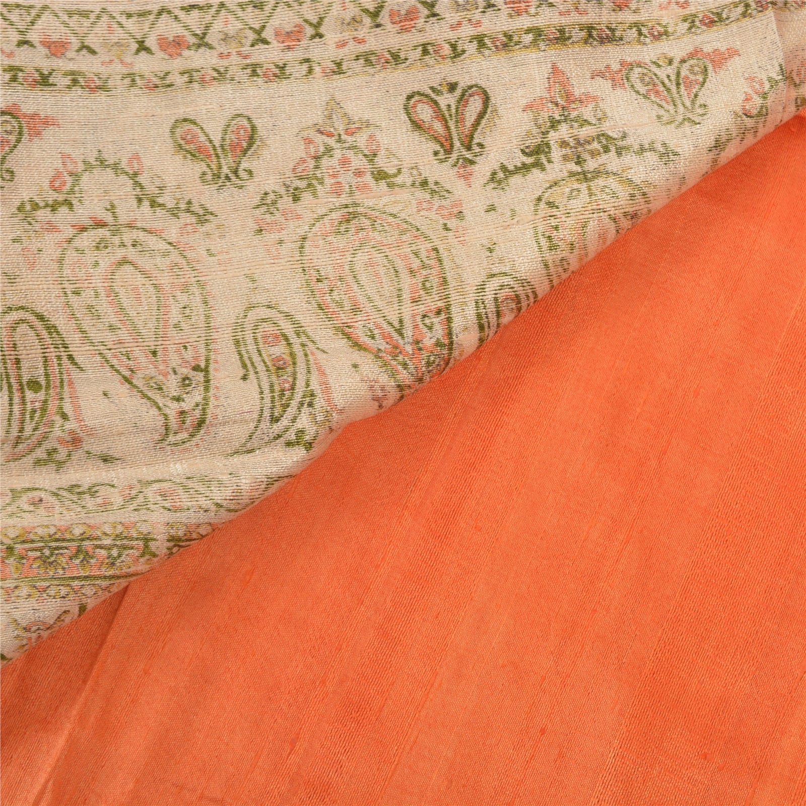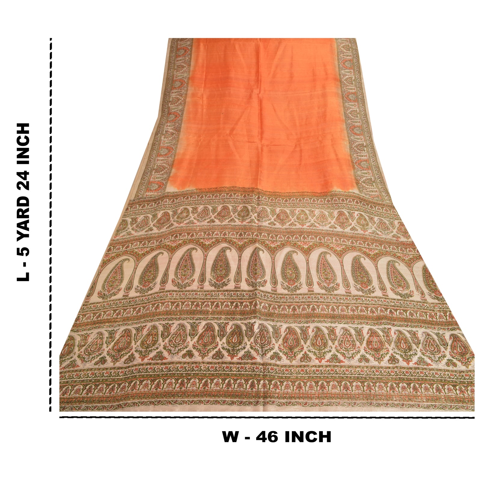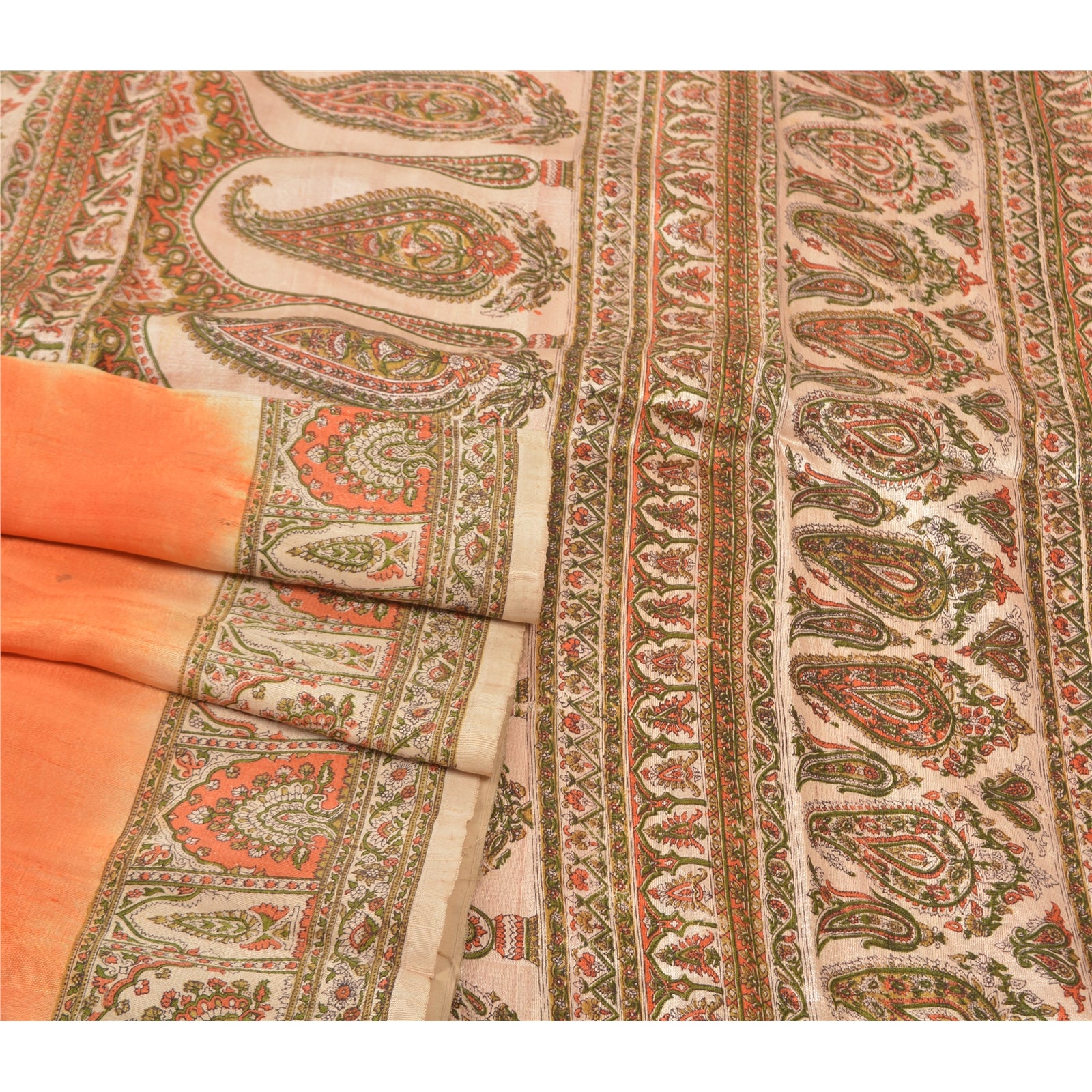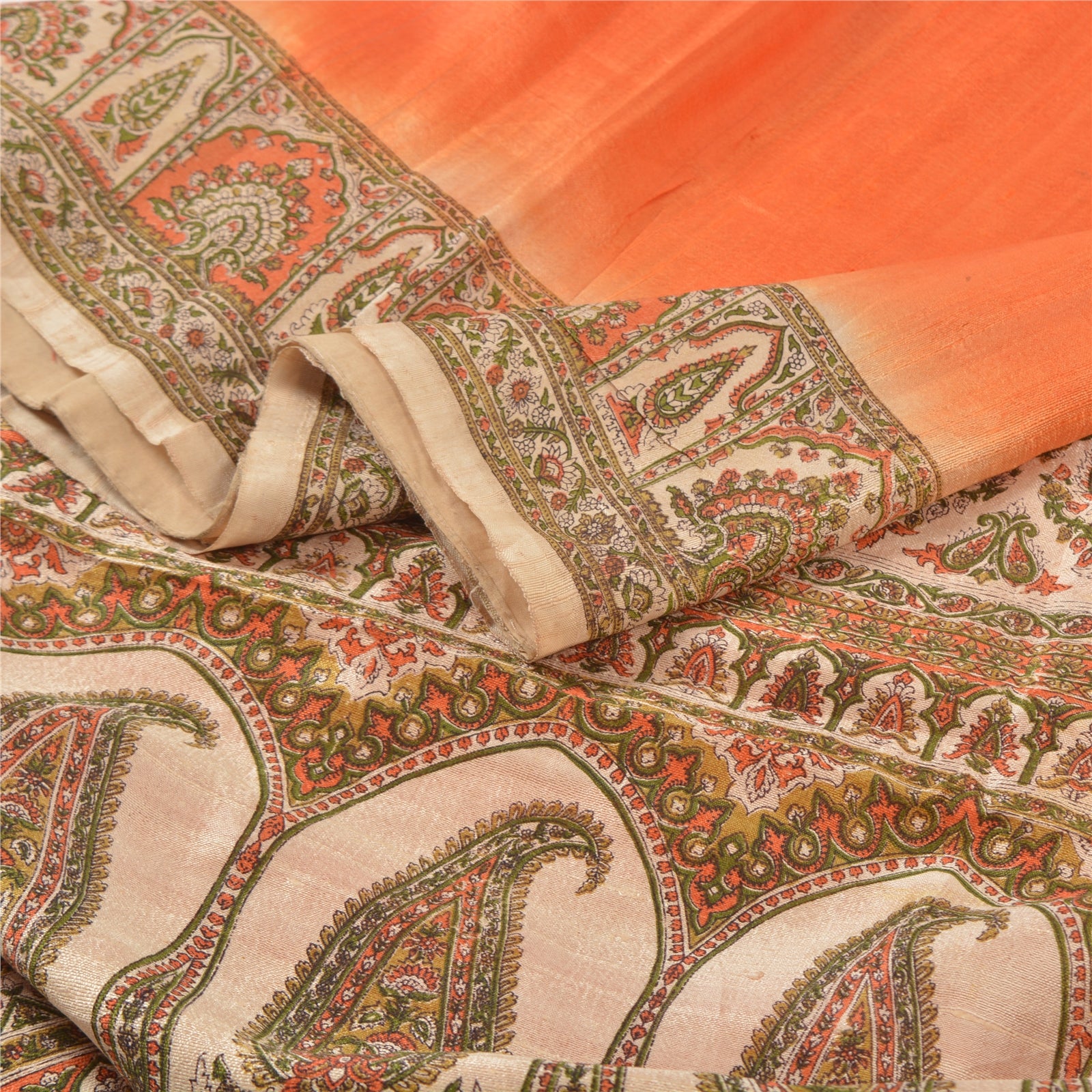 Sanskriti Offers This Vintage Orange & Cream Color Handloom Printed Heavy Saree Which Is Crafted With 100% Pure Silk Base Sustainable Fabric The pallu & border sari features multi color print with floral & paisley design. The center part of sari has plain orange color. This heavy saree can be used for various crafting ideas too. Use it for dress designing, as a throw, as window dressing, upholstery, table linen and much more. Let your creative juices flow! As the item is Vintage, some minor stains and defects are expected.