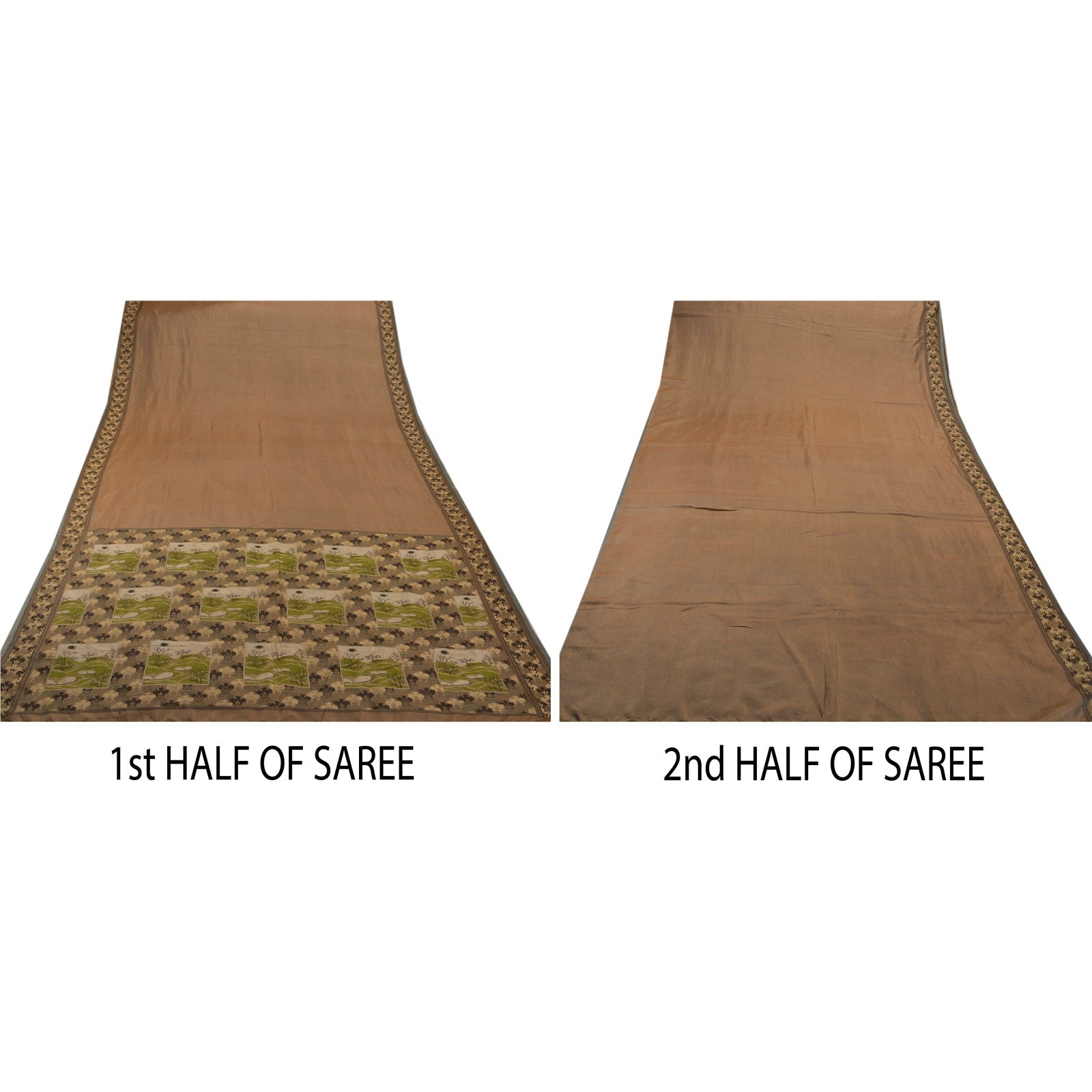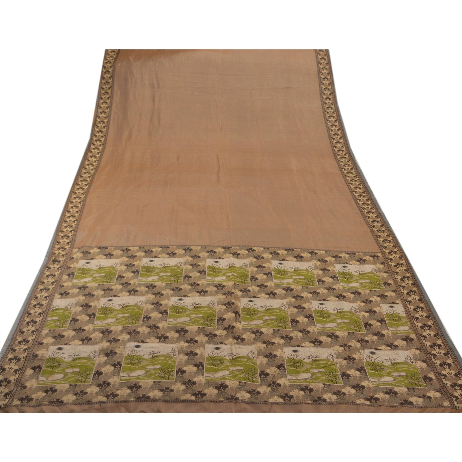 ? Beautiful brown colored woven pure silk sari ? Pallu & Border features floral &b tree design embellished with cream/green/black weaving work makes the sari look ravishing. What is special about this saree? Alluring woven work with floral design on brown color base Sustainable Fabric is really enhancing the beauty of the saree. This unique vintage saree can be used for various crafting ideas even if you don't want to use it as a sari. Design a dress, use it as a throw, as window dressing, upholstery, sarongs, table linen and much more. Let your creative juices flow and use this decorated Sustainable Fabric in multiple fashion.