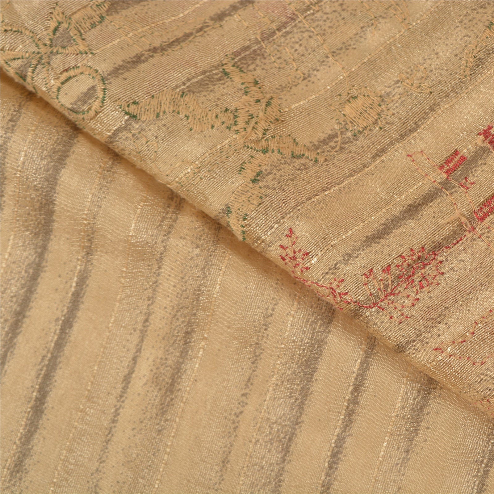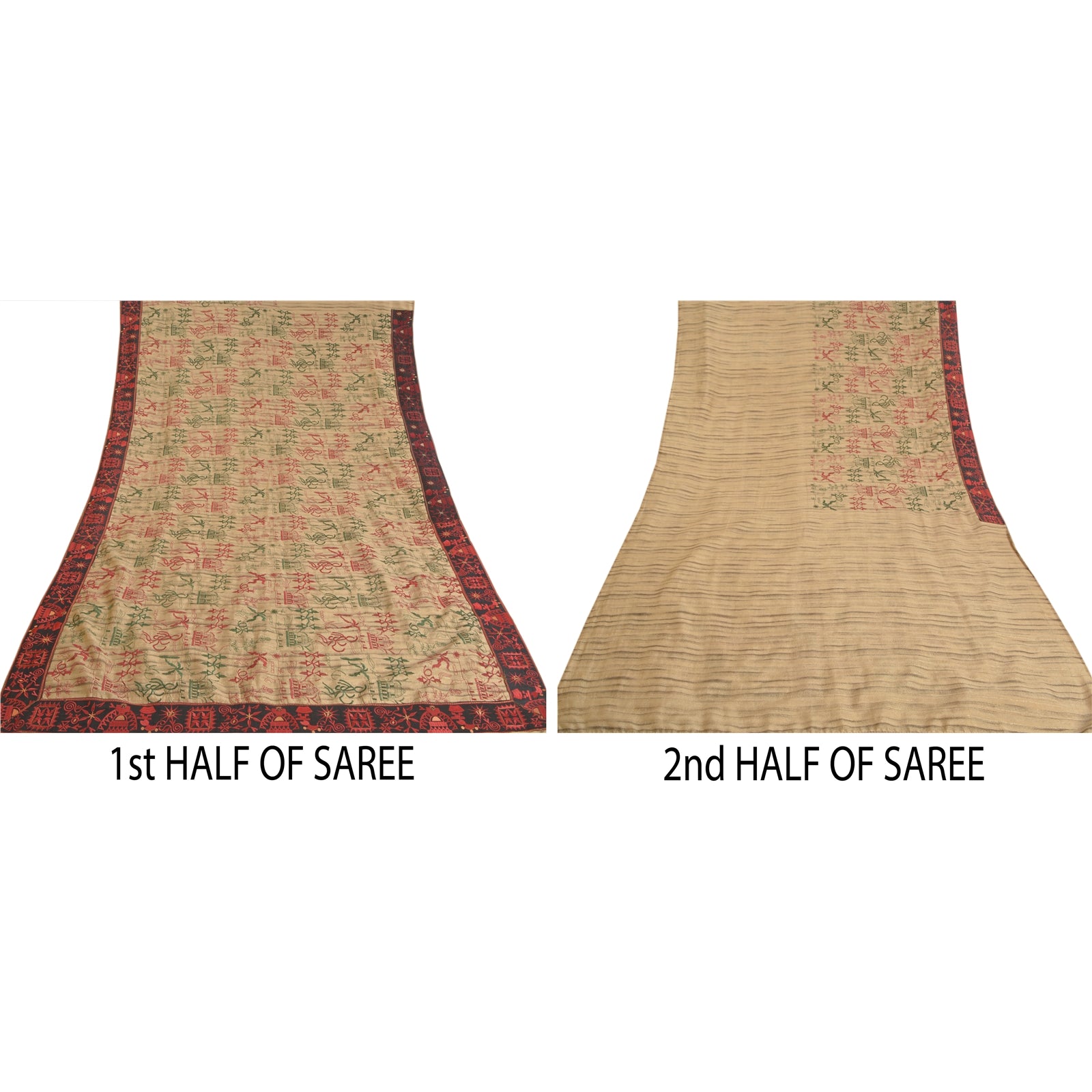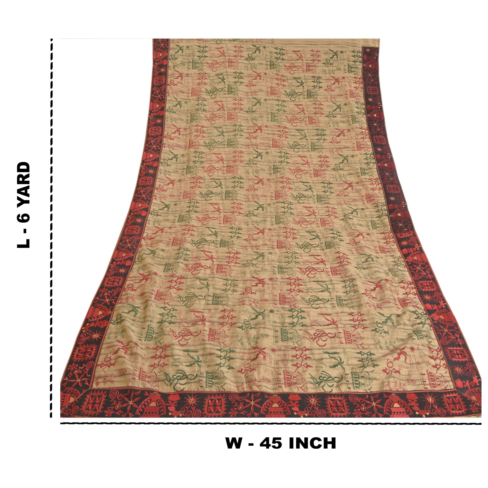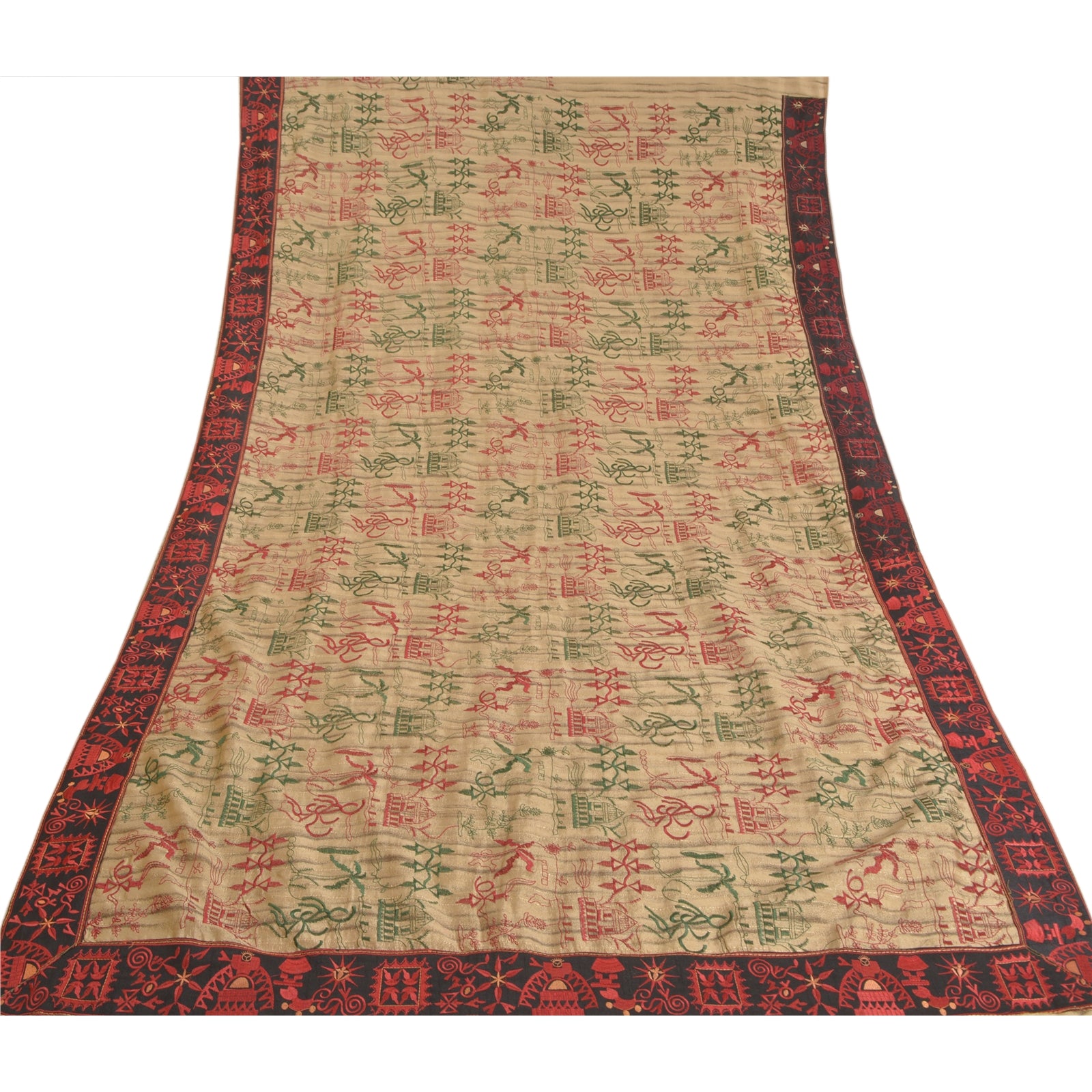 Beautiful shade of ivory colored art silk embroidered warli art sari. Border has embroidered black Sustainable Fabric patch work with thread floral pattern. The center of the saree has embroidered human & floral design. This saree can be used for various crafting ideas too. Use it for dress designing, as a throw, as window dressing, upholstery, table linen and much more. Let your creative juices flow.