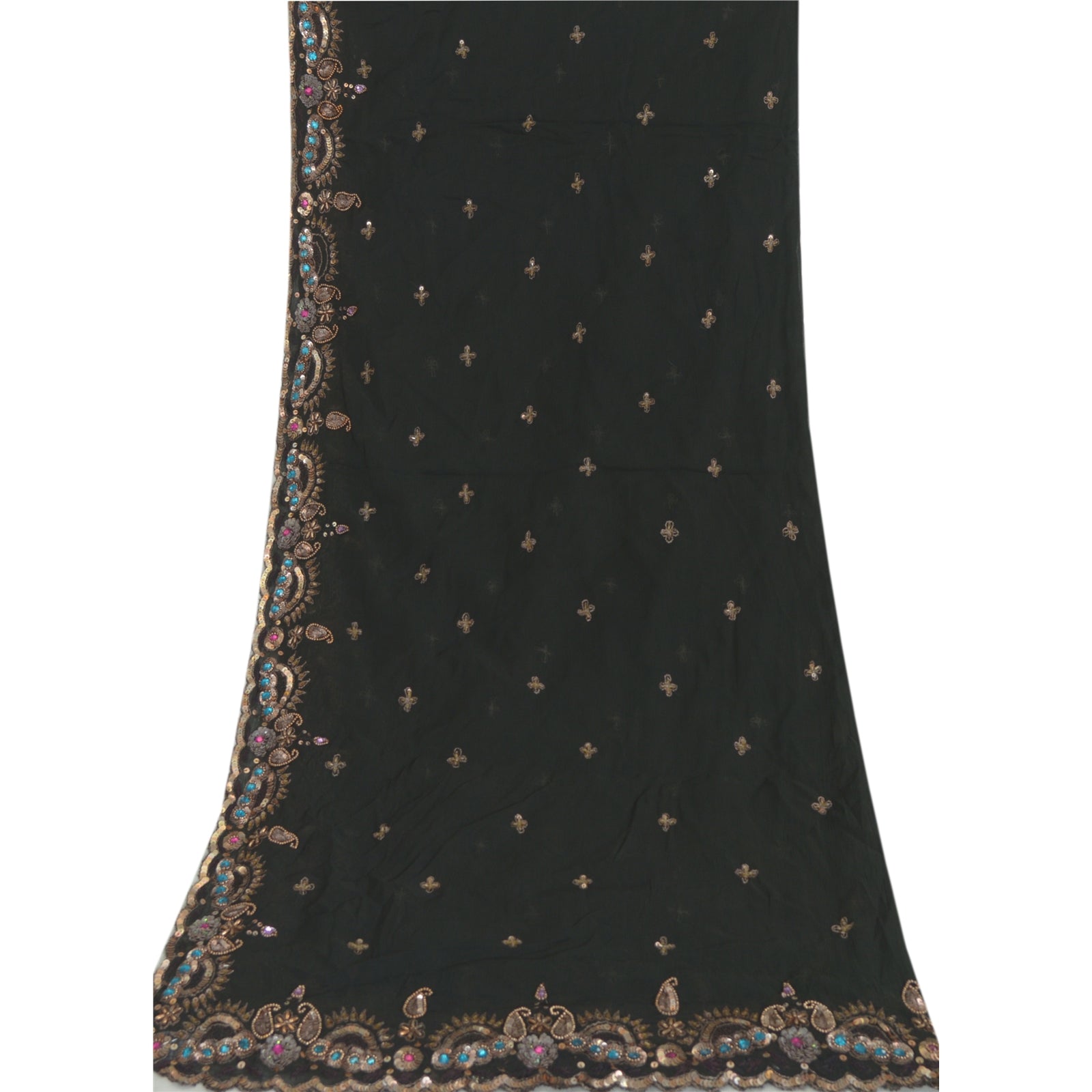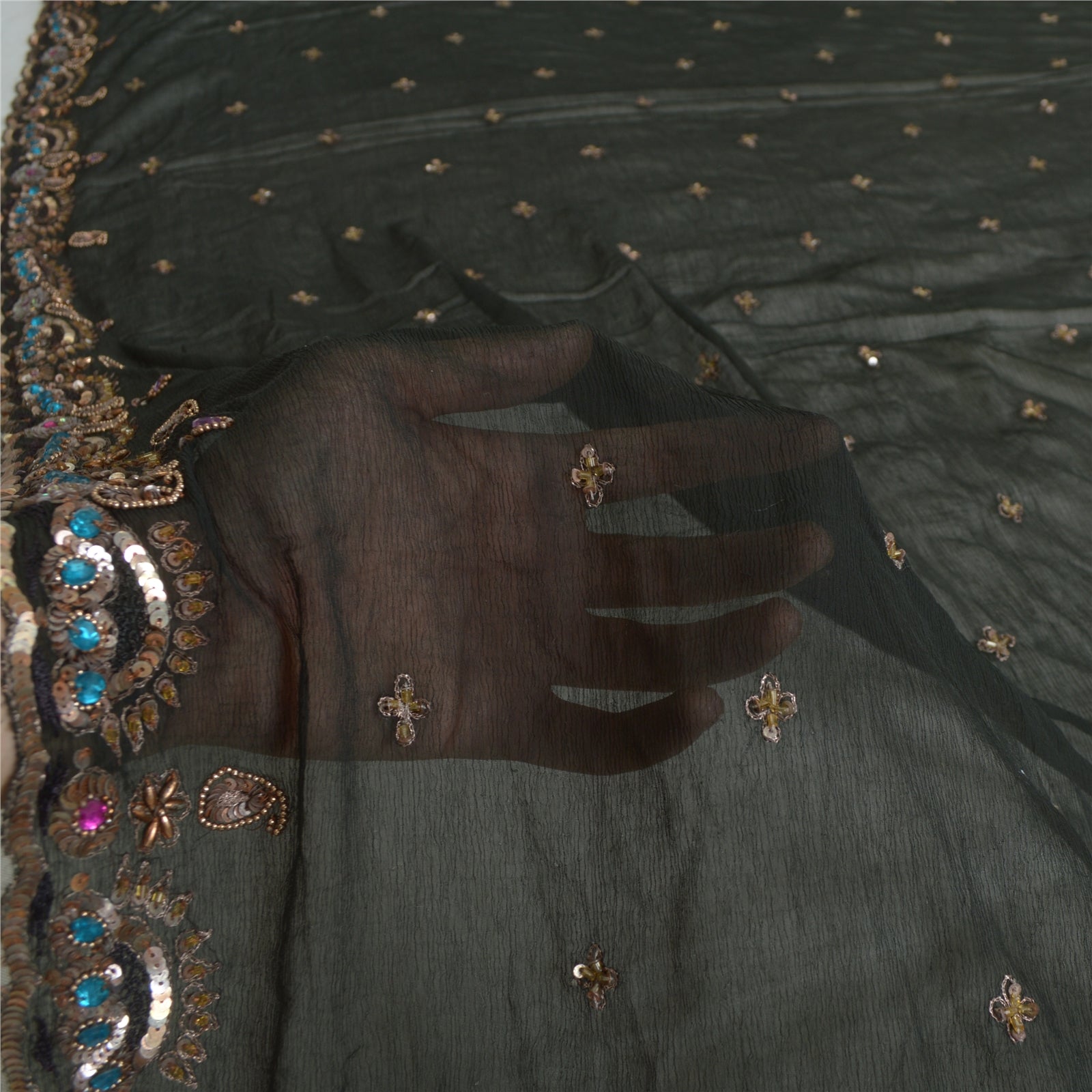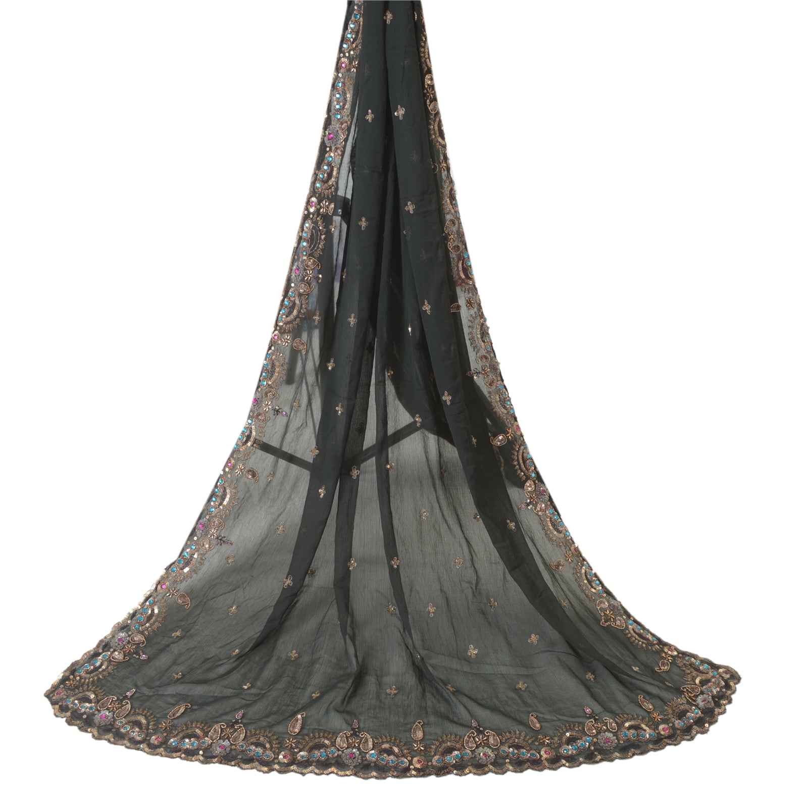 Sanskriti Vintage Long Indian Black Dupatta Chiffon Hand Beaded Zari Stole Veil