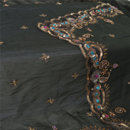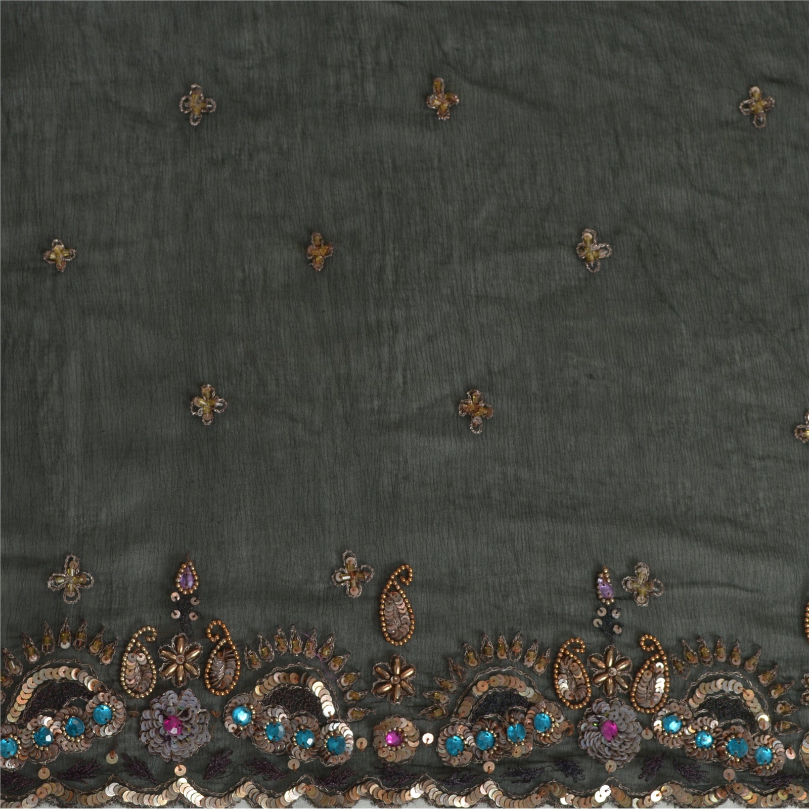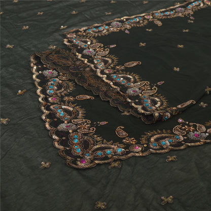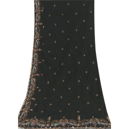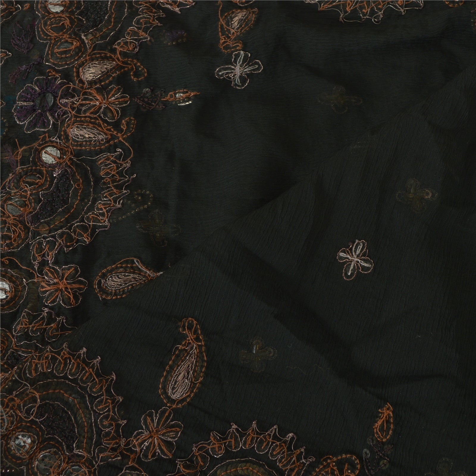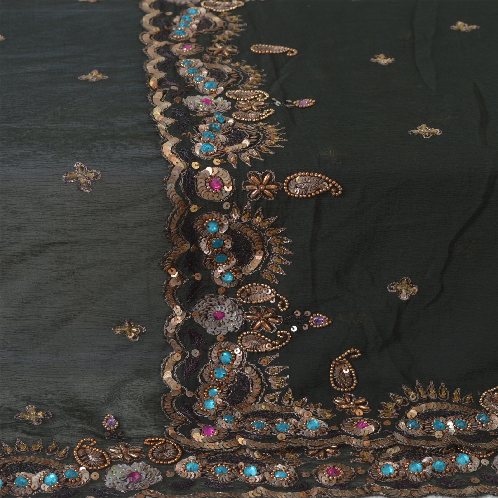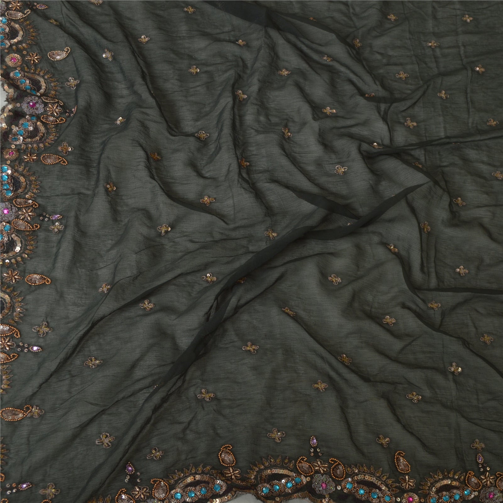 THE ITEM COLOR OR SHADE MAY BE DARKER OR LIGHTER THAN THE PICTURE .Beautiful black colored chiffon hand embrodered long scarf/dupatta. Border of dupatta has floral design with golden zari, sequins, glass bead & rhinestone work. Similar work in center part of dupatta. This dupatta/stole can be used for various crafting ideas too. Use it for dress designing, as a throw, as window dressing, upholstery, table linen and much more. Let your creative juices flow. These Items are pre-owned and well preserved.