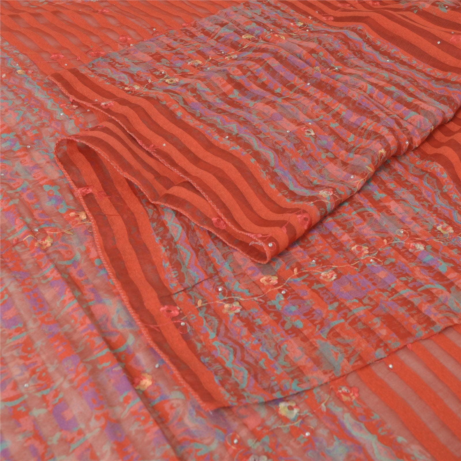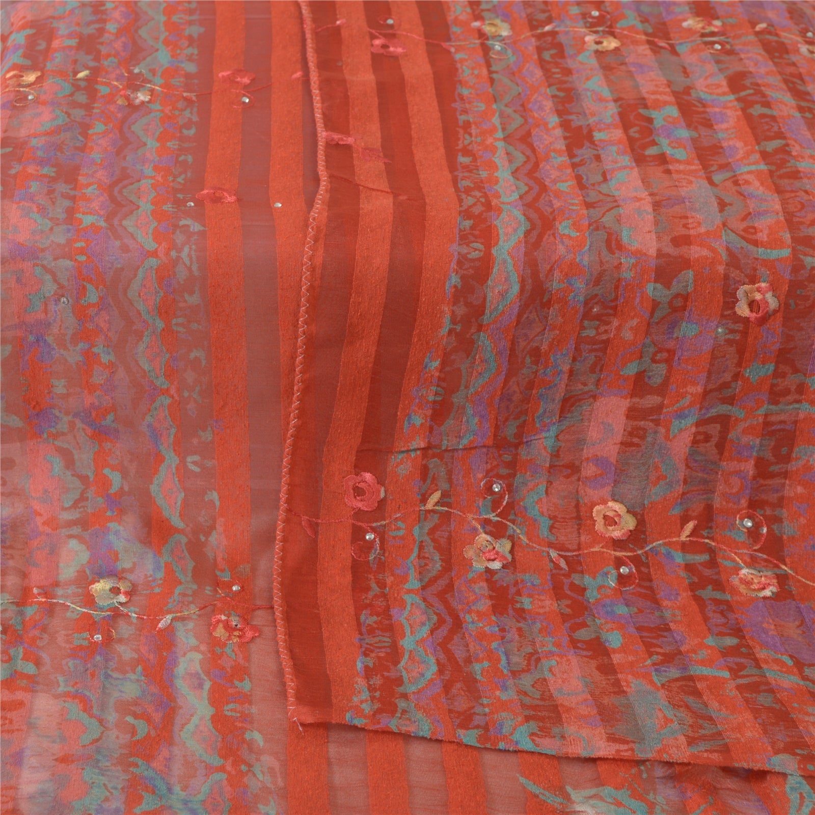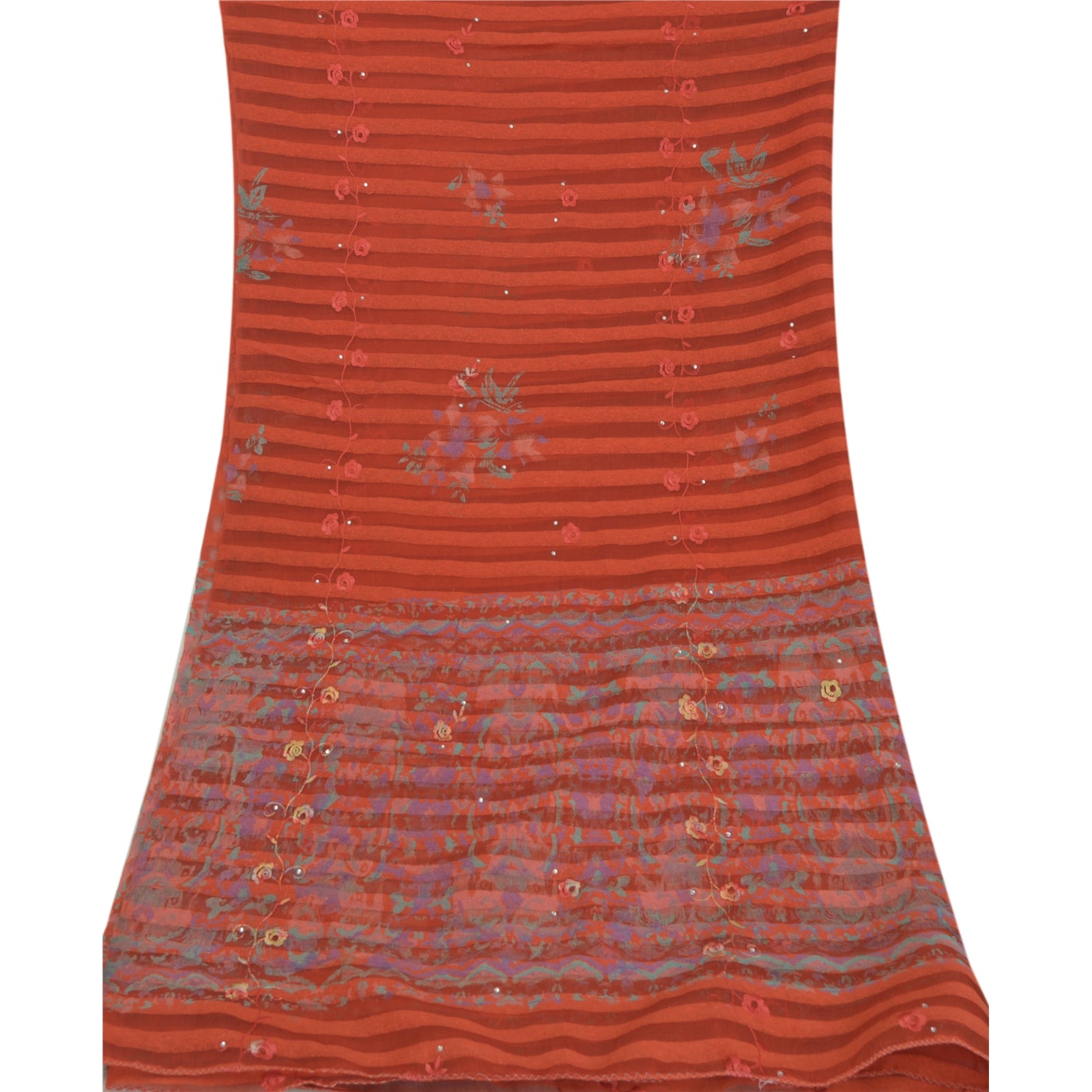 THE ITEM COLOR OR SHADE MAY BE DARKER OR LIGHTER THAN THE PICTURE.Beautiful saffron colored pure silk hand embroidered & printed, woven long scarf/dupatta. Border of dupatta has printed floral design & thread, sequins work. Similar work & woven work in center part of dupatta. This dupatta/stole can be used for various crafting ideas too. Use it for dress designing, as a throw, as window dressing, upholstery, table linen and much more. Let your creative juices flow. These Items are pre-owned and well preserved. They are thoroughly checked before sending but there could be minor wear or tear in the Sustainable Fabric. While these are pre-washed, in case you are buying this for personal wear, we advise getting an additional dry-cleaning done. Dry-clean is $3 extra and will take 3-4 days additionally to ship. If you are using this as a Sustainable Fabric for a project, no additional care needed.