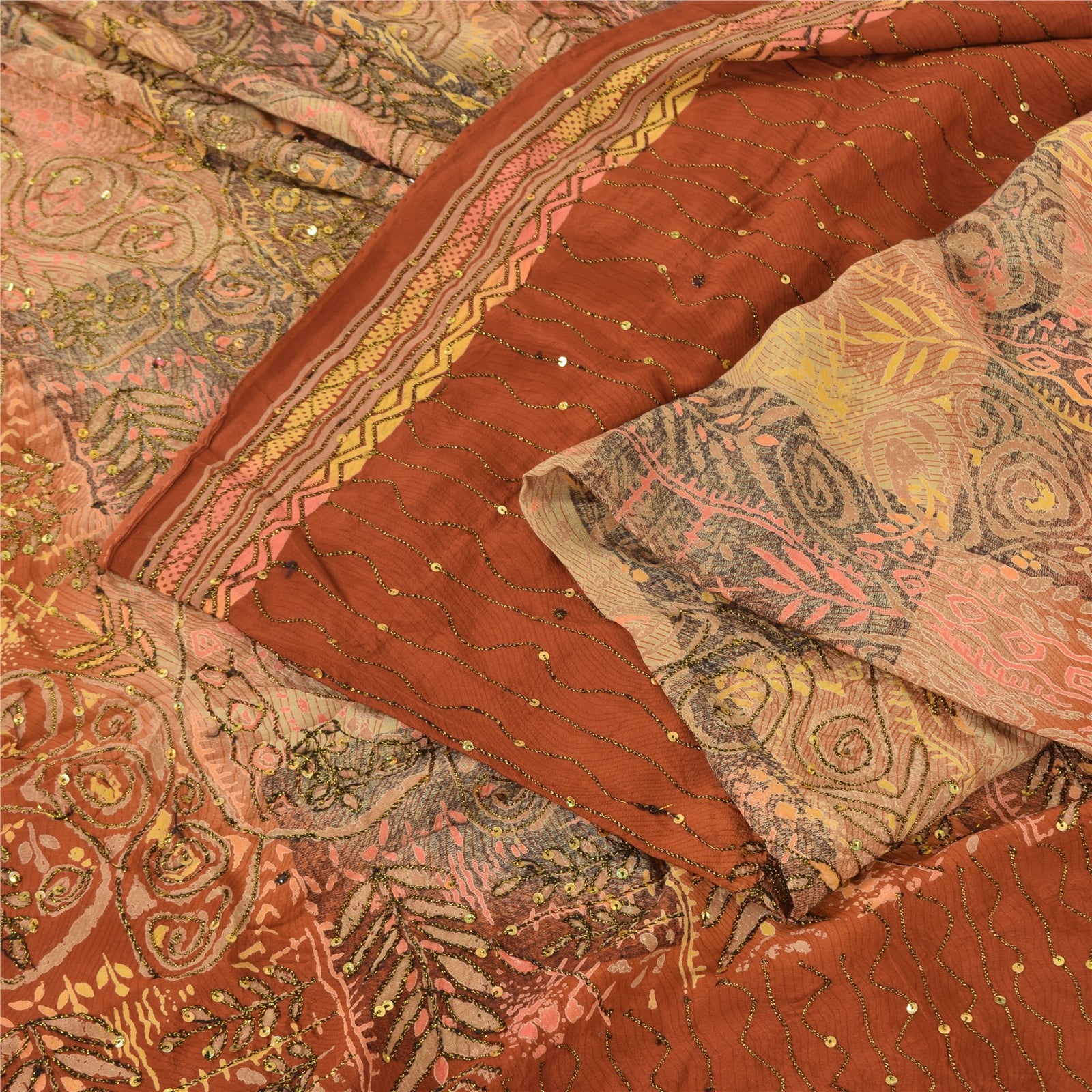'THE ITEM COLOR OR SHADE MAY BE DARKER OR LIGHTER THAN THE PICTURE.' • Beautiful orange colored hand embroidered printed 100% pure crepe silk sari. • Pallu & border feature printed floral designs embellished with golden and black color thread work & golden sequins work. The center part of the sari has printed pattern with sequins work. As the product is vintage, some mild stains are expected This unique vintage saree can be used for various crafting ideas even if you don't want to use it as a sari. Design a dress, use it as a throw, as window dressing, upholstery, sarongs, table linen and much more. Let your creative juices flow and use this decorated Sustainable Fabric in multiple fashion. Shipping note: International buyers please note: Import duties, taxes, and charges are not included in the item price or postage cost. These charges are the buyer's responsibility. Please check with your country's customs office to determine what these additional costs will be prior to bidding or buying. Buyer will pay custom duty/tax. It is calculated and charged differently by every country. As a seller I do not have any control over it. VAT or sales tax is calculated by the platform at the time of checkout. Customs charge is payable at the time of delivery. SKU : PS-35586