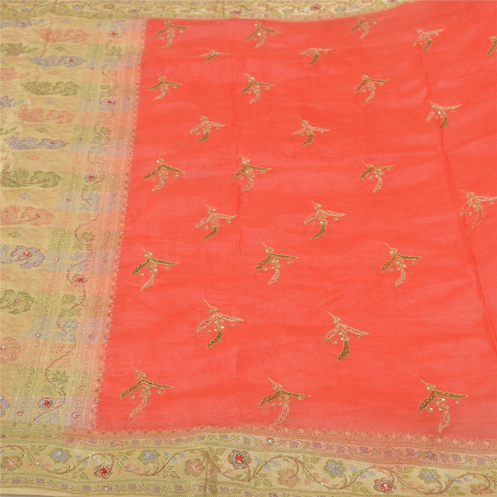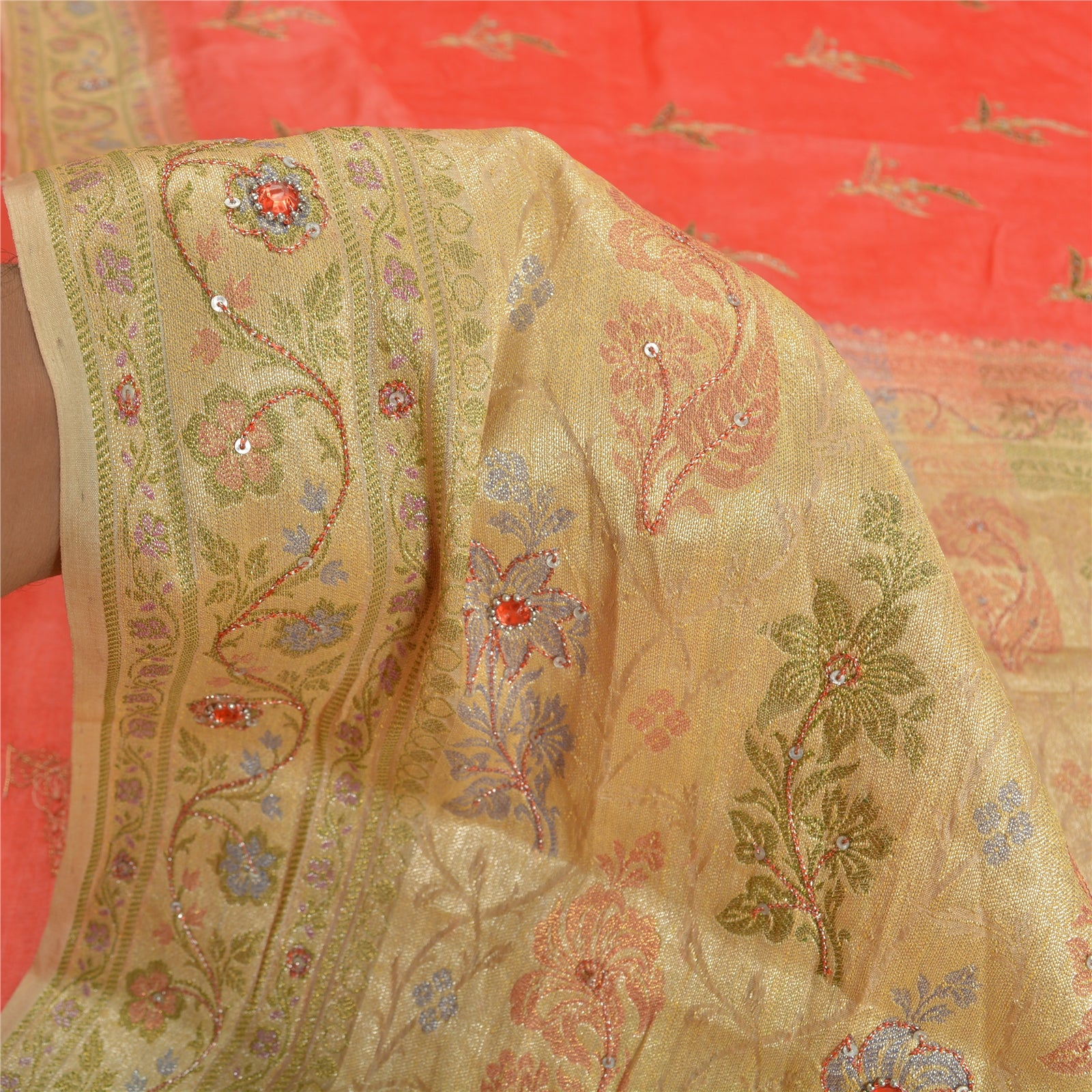 'THE ITEM COLOR OR SHADE MAY BE DARKER OR LIGHTER THAN THE PICTURE.' Beautiful peach & cream colored pure silk hand embroidered woven sari/Sustainable Fabric. Pallu & border has multi color woven thread work with thread, sequins & rhinestones work. The center of the saree has floral design with similar work. This saree can be used for various crafting ideas too. Use it for dress designing, as a throw, as window dressing, upholstery, table linen and much more. Let your creative juices flow. 'International buyers please note: Import duties, taxes, and charges are not included in the item price or postage cost. These charges are the buyer's responsibility. Please check with your country's customs office to determine what these additional costs will be prior to bidding or buying. Buyer will pay custom duty/tax. It is calculated and charged differently by every country. As a seller I do not have any control over it. VAT or sales tax is calculated by the platform at the time of checkout. Customs charge is payable at the time of delivery.'