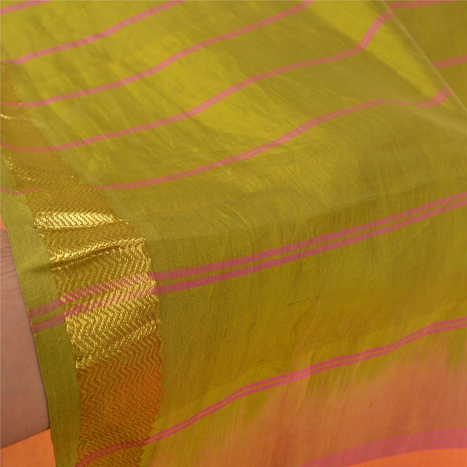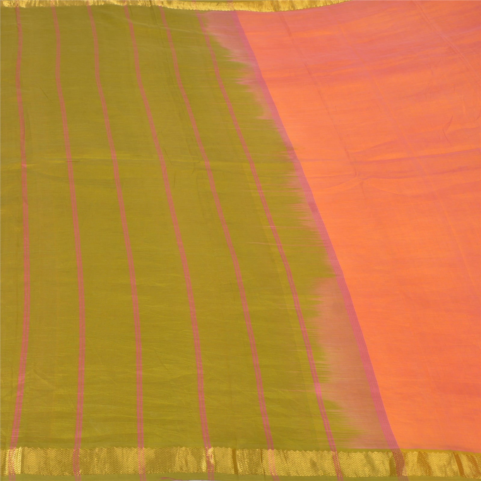 Beautiful peach & green colored cotton silk woven sari. Pallu & Border has pink woven work. You can see golden zari woven zig- zag pattern. The center of the saree has solid color. This saree can be used for various crafting ideas too. Use it for dress designing, as a throw, as window dressing, upholstery, table linen and much more. Let your creative juices flow.