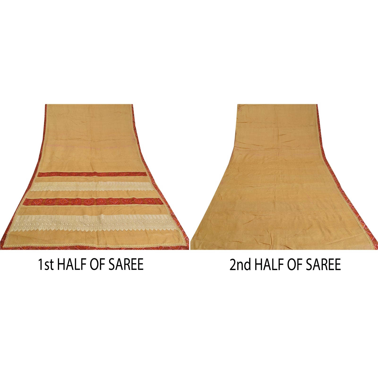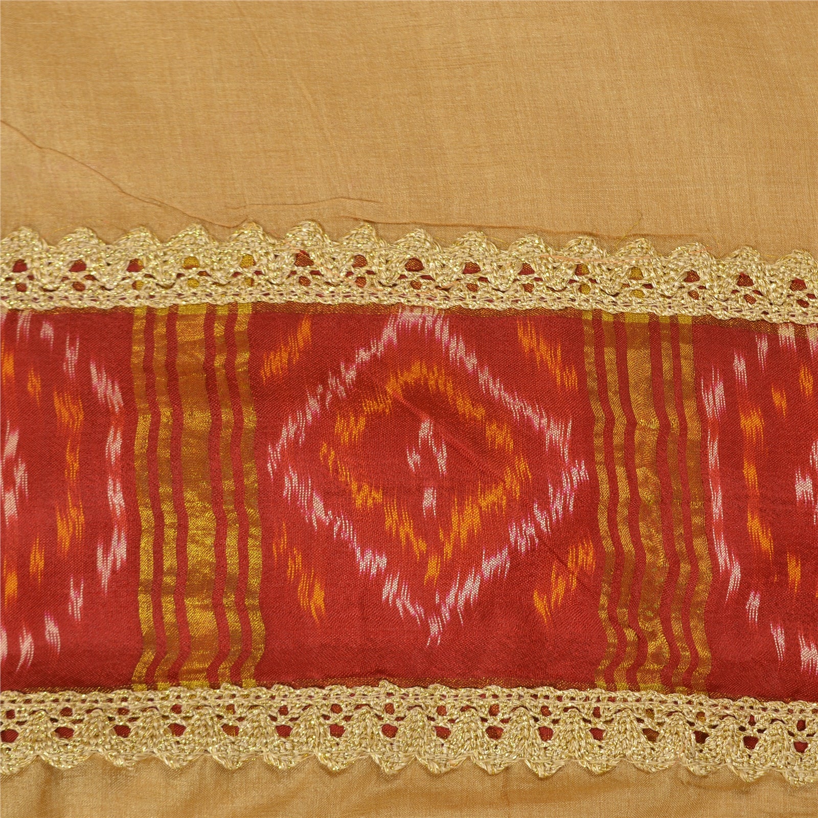 'THE ITEM COLOR OR SHADE MAY BE DARKER OR LIGHTER THAN THE PICTURE.' Beautiful shade of peach colored pure silk embroidered sari/Sustainable Fabric. Pallu & border has red ikat work Sustainable Fabric patch with golden lace work. The center of the saree has plain solid color. This saree can be used for various crafting ideas too. Use it for dress designing, as a throw, as window dressing, upholstery, table linen and much more. Let your creative juices flow. 'International buyers please note: Import duties, taxes, and charges are not included in the item price or postage cost. These charges are the buyer's responsibility. Please check with your country's customs office to determine what these additional costs will be prior to bidding or buying. Buyer will pay custom duty/tax. It is calculated and charged differently by every country. As a seller I do not have any control over it. VAT or sales tax is calculated by the platform at the time of checkout. Customs charge is payable at the time of delivery.'
