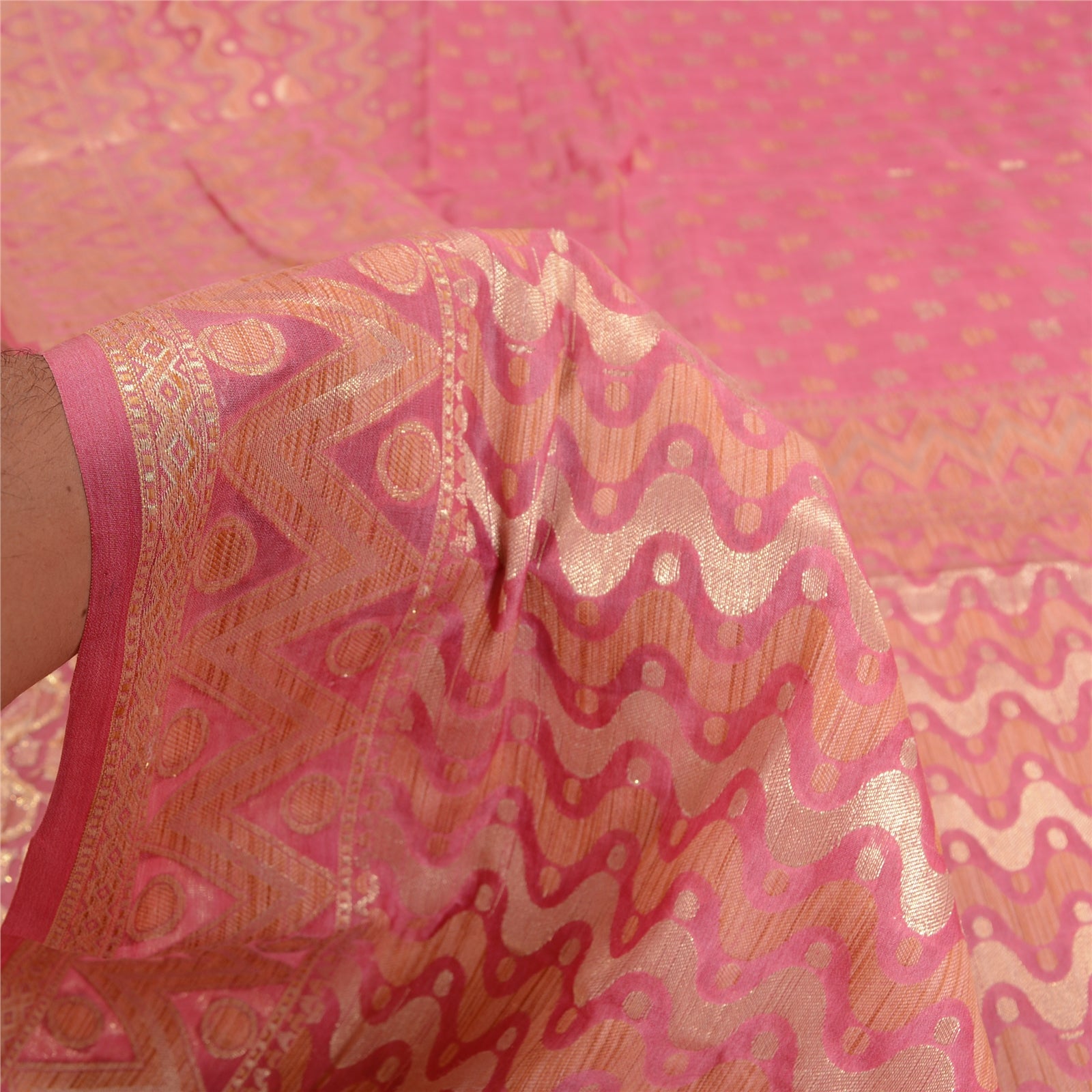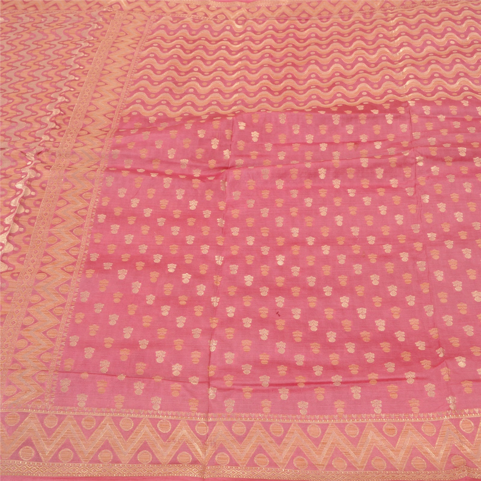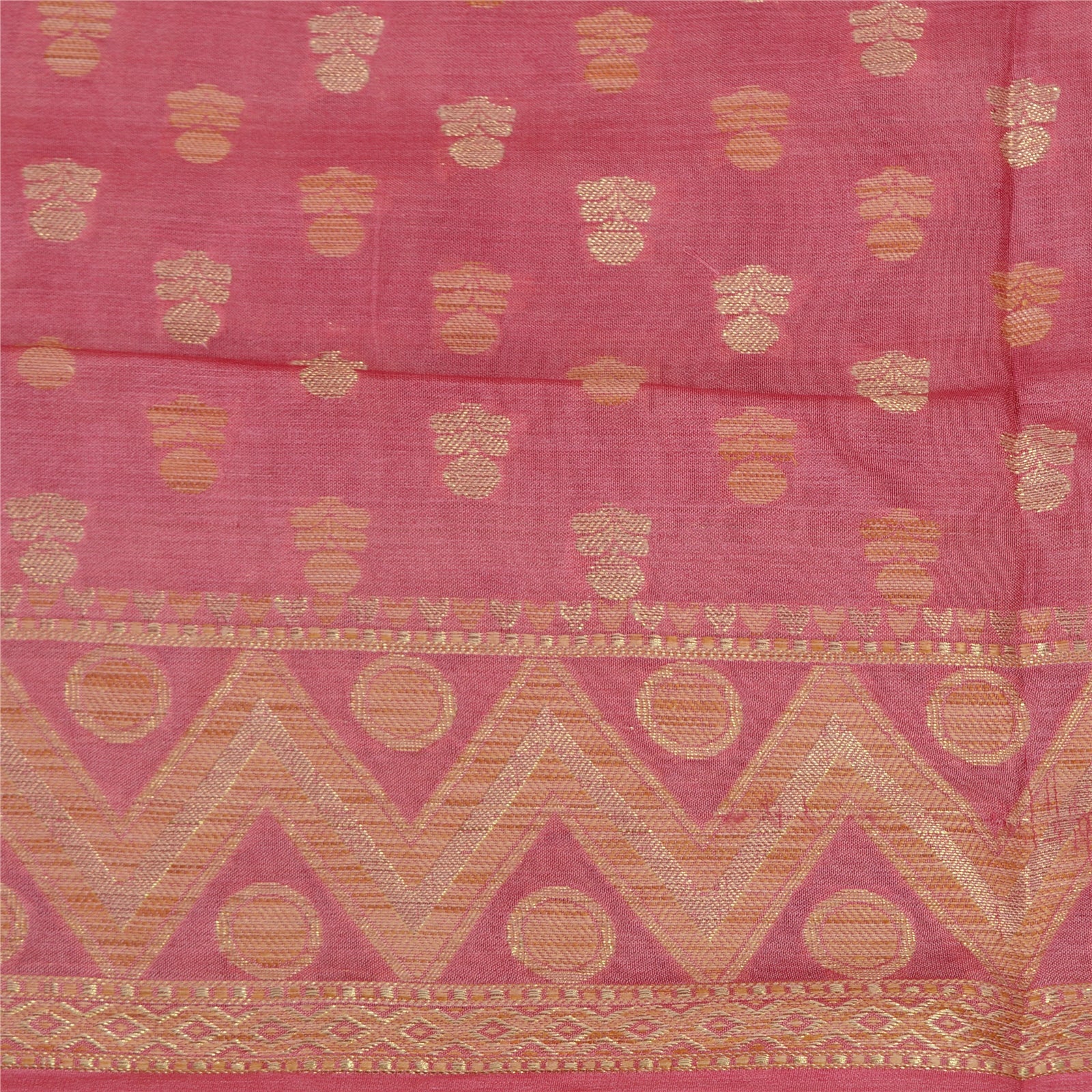 'THE ITEM COLOR OR SHADE MAY BE DARKER OR LIGHTER THAN THE PICTURE.' Beautiful pink colored 100% pure silk woven sari/Sustainable Fabric. Pallu & border features golden/cream woven thread work with zig-zag & floral design. The center of the saree has similar woven floral design. This saree can be used for various crafting ideas too. Use it for dress designing, as a throw, as window dressing, upholstery, table linen and much more. Let your creative juices flow. 'International buyers please note: Import duties, taxes, and charges are not included in the item price or postage cost. These charges are the buyer's responsibility. Please check with your country's customs office to determine what these additional costs will be prior to bidding or buying. Buyer will pay custom duty/tax. It is calculated and charged differently by every country. As a seller I do not have any control over it. VAT or sales tax is calculated by the platform at the time of checkout. Customs charge is payable at the time of delivery.'