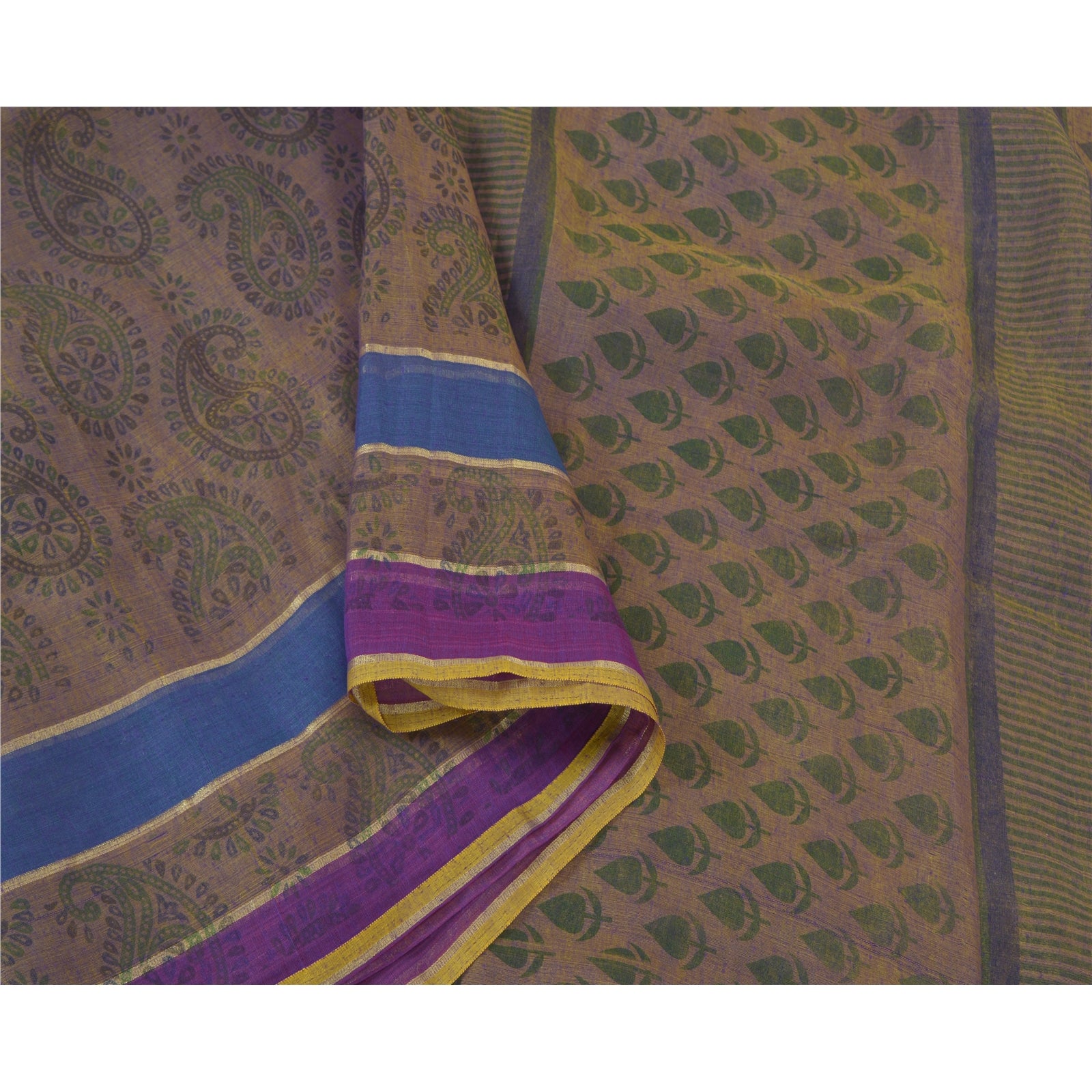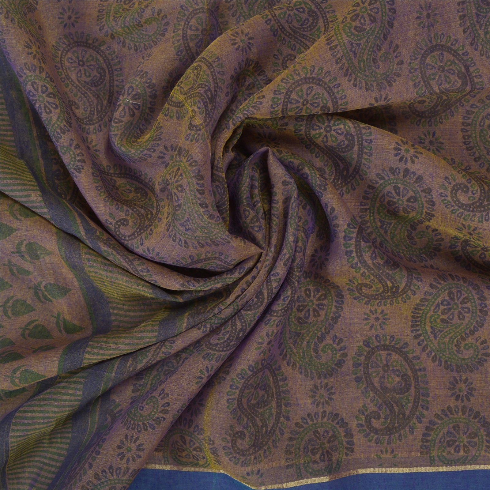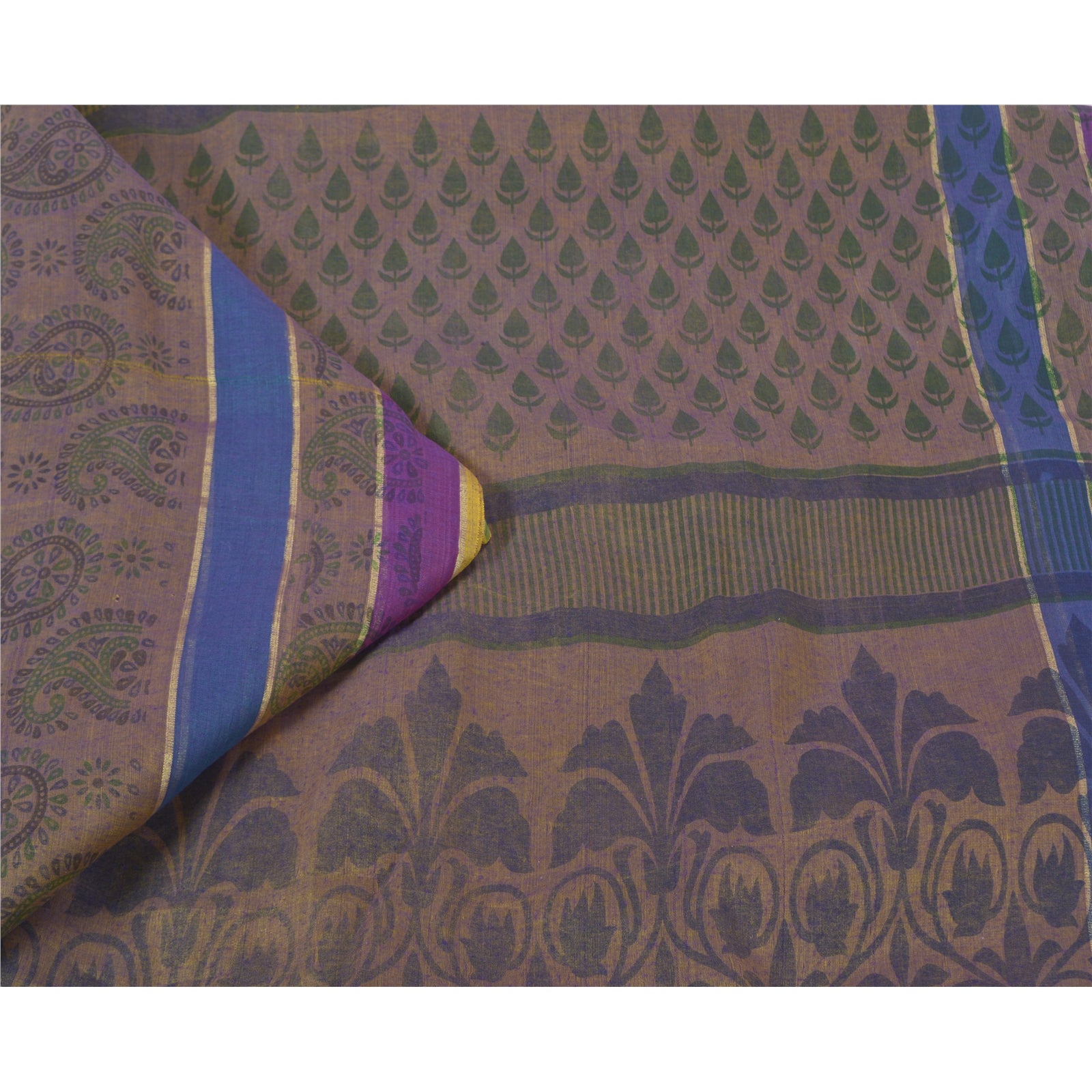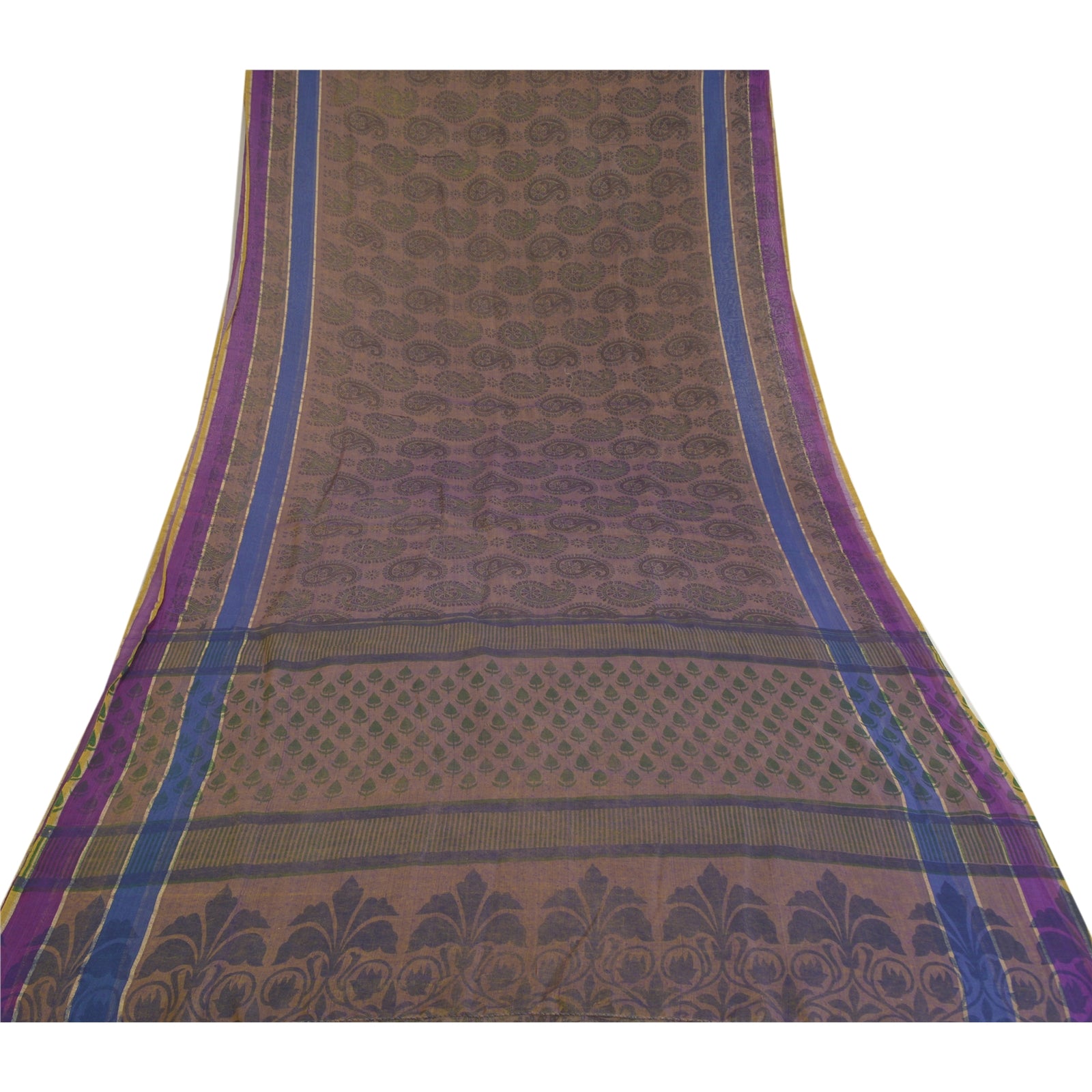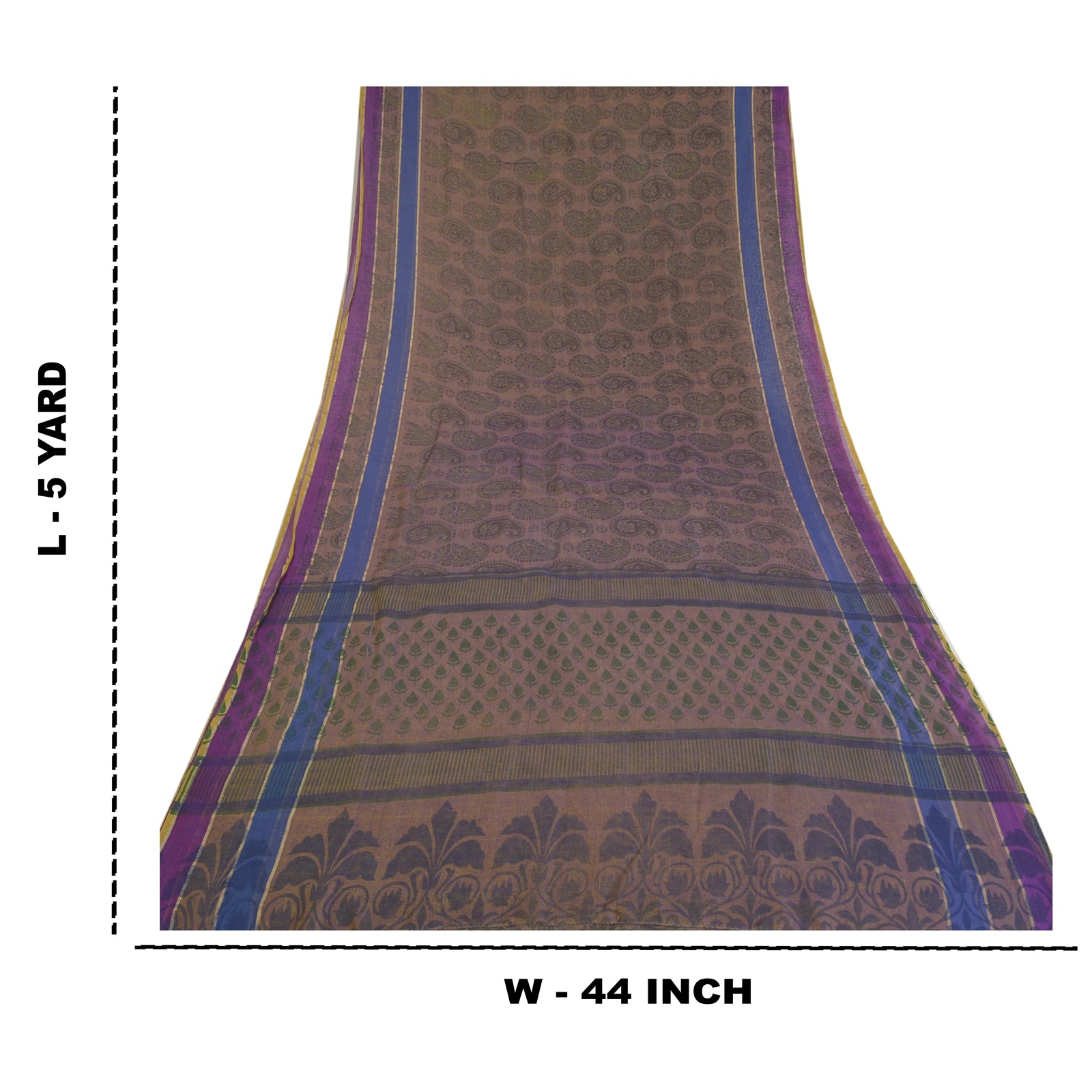 Beautiful shade of purple & brown colored cotton printed sari. Pallu & Border has printed floral & paisley pattern. The center of the saree has similar printed paisley pattern. This saree can be used for various crafting ideas too. Use it for dress designing, as a throw, as window dressing, upholstery, table linen and much more. Let your creative juices flow.