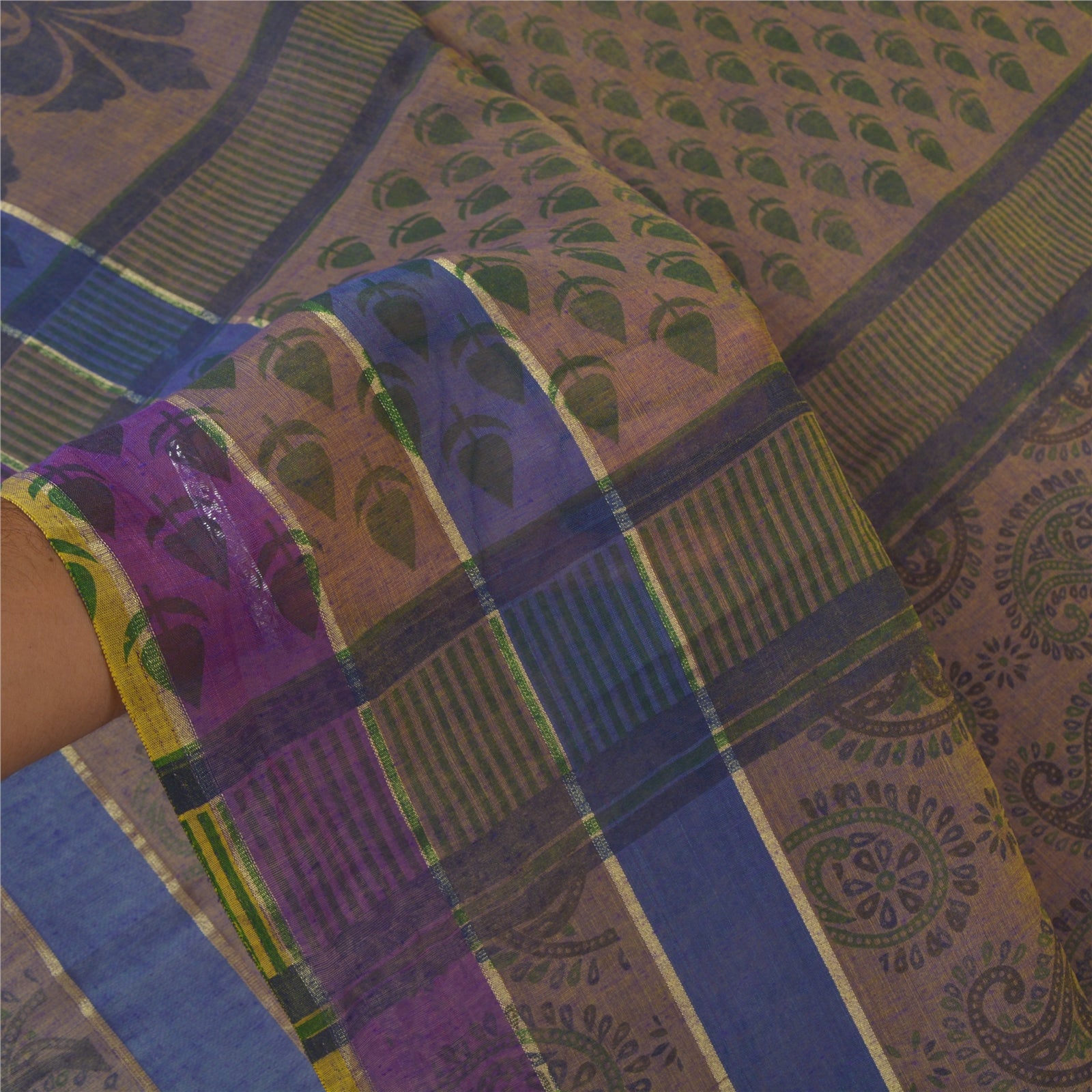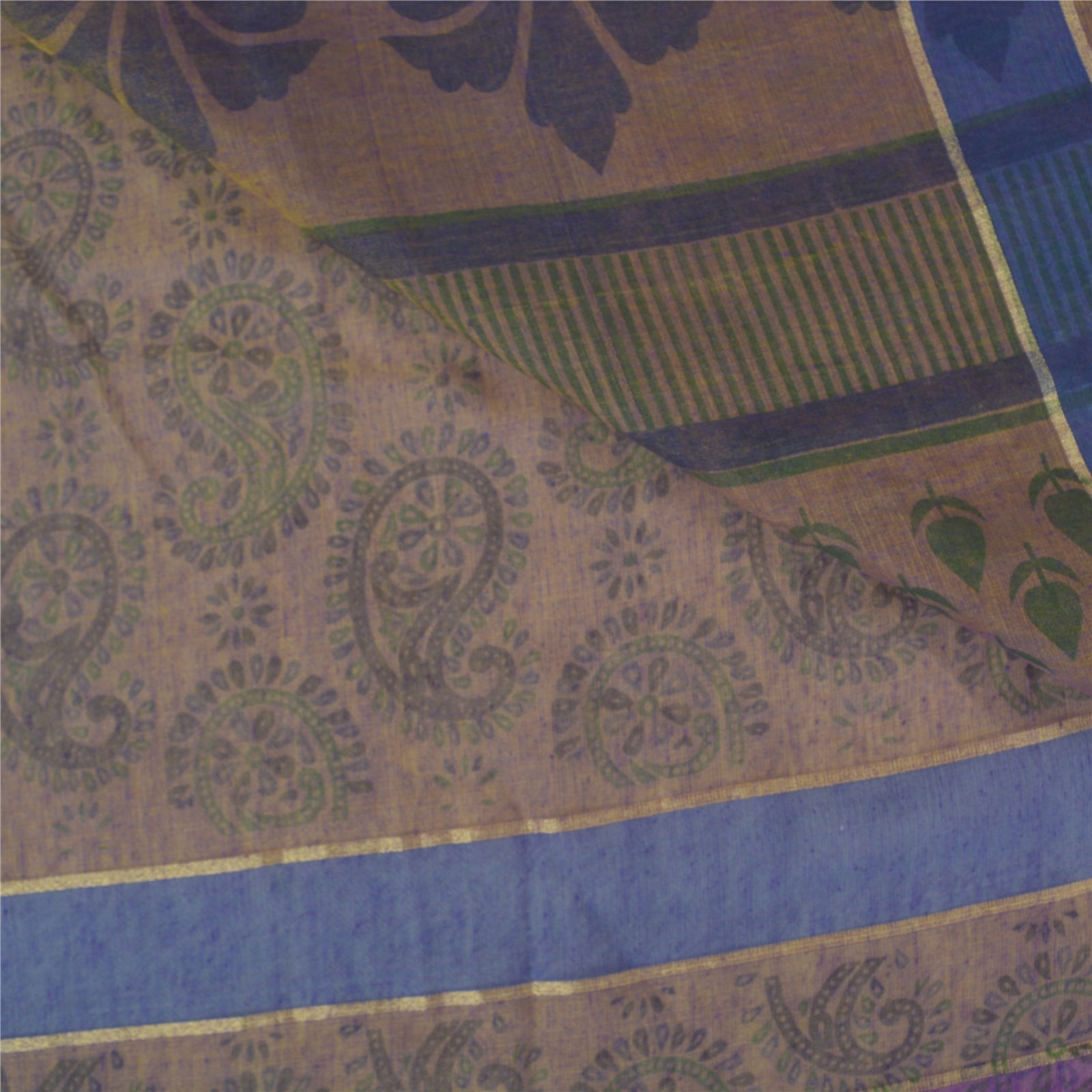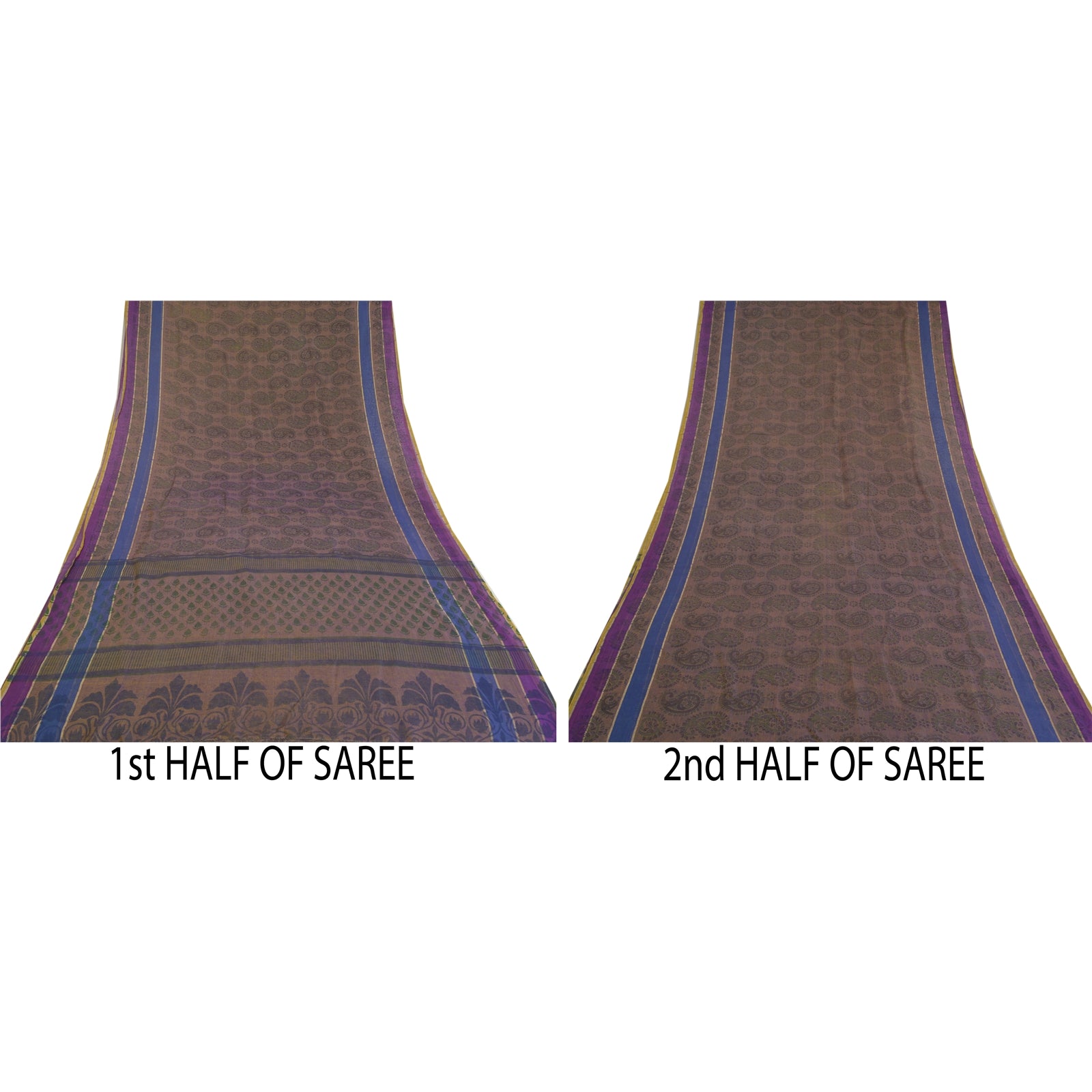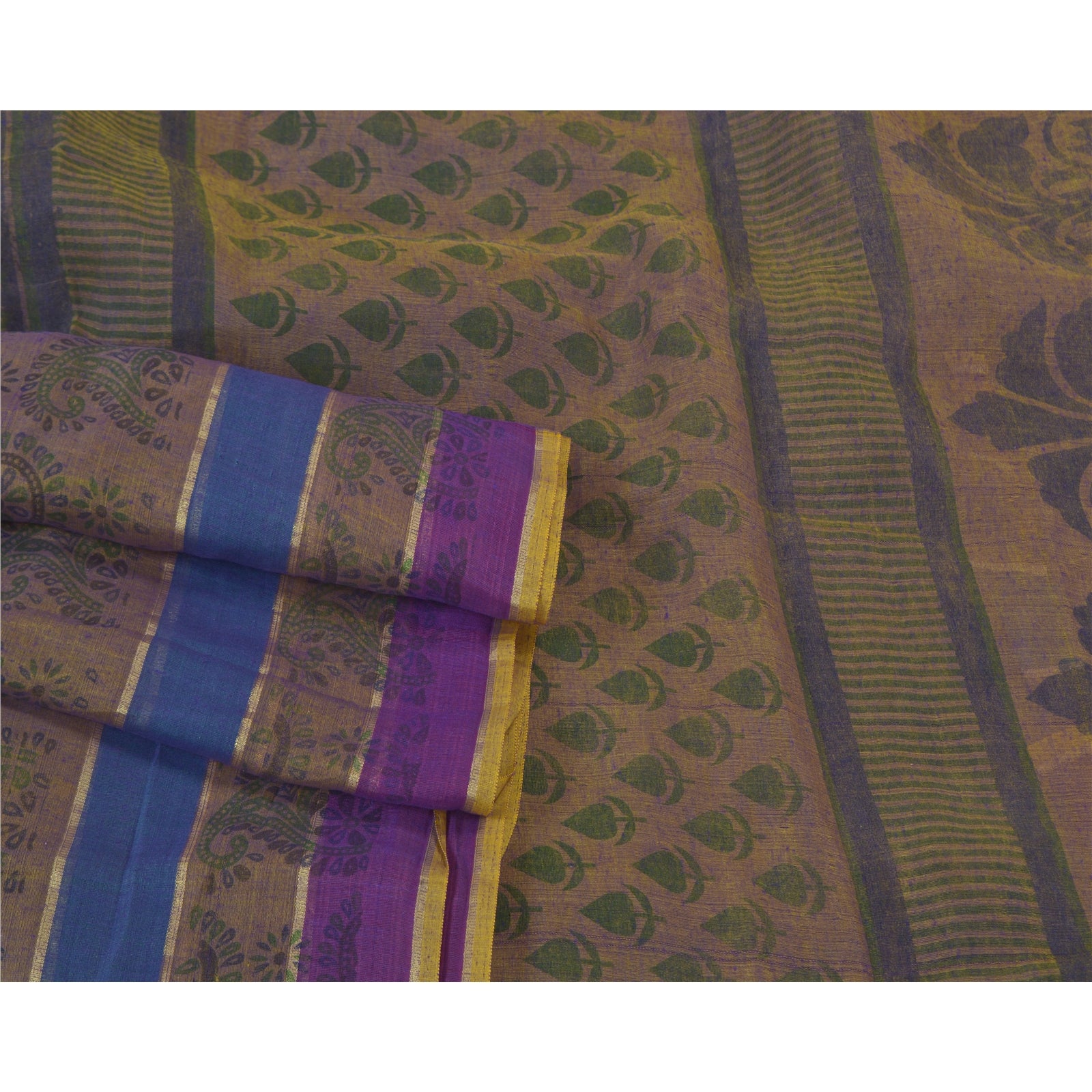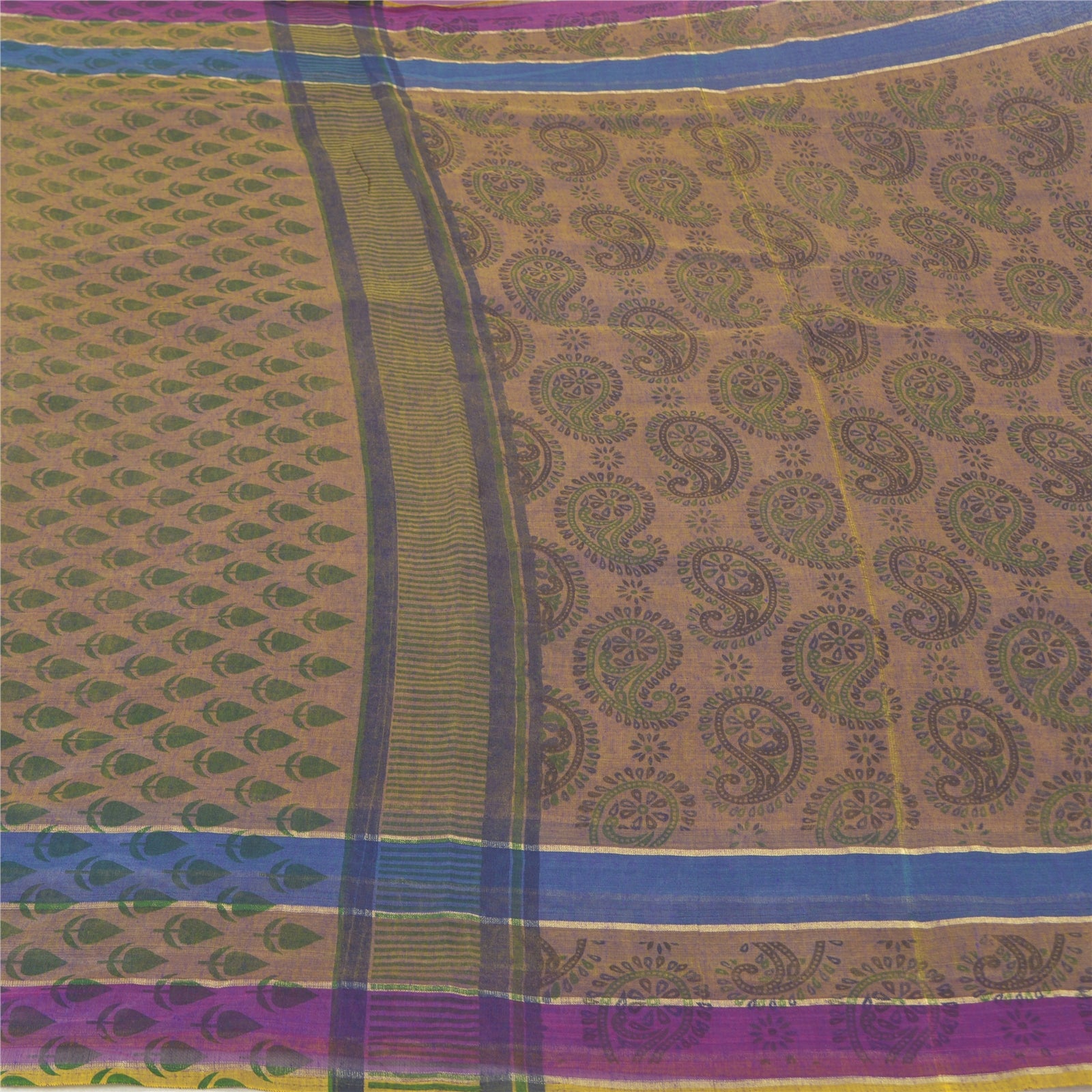 Beautiful shade of purple & brown colored cotton printed sari. Pallu & Border has printed floral & paisley pattern. The center of the saree has similar printed paisley pattern. This saree can be used for various crafting ideas too. Use it for dress designing, as a throw, as window dressing, upholstery, table linen and much more. Let your creative juices flow.