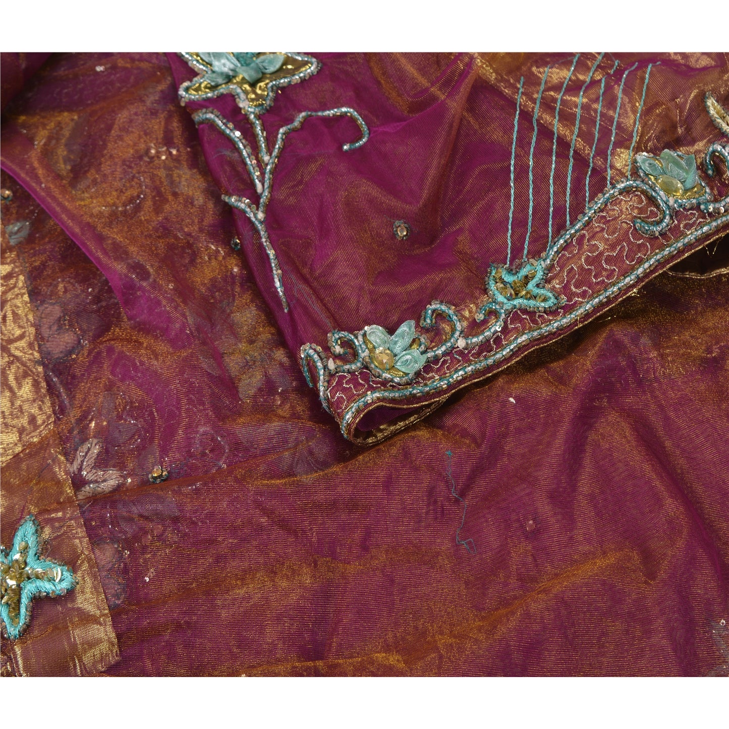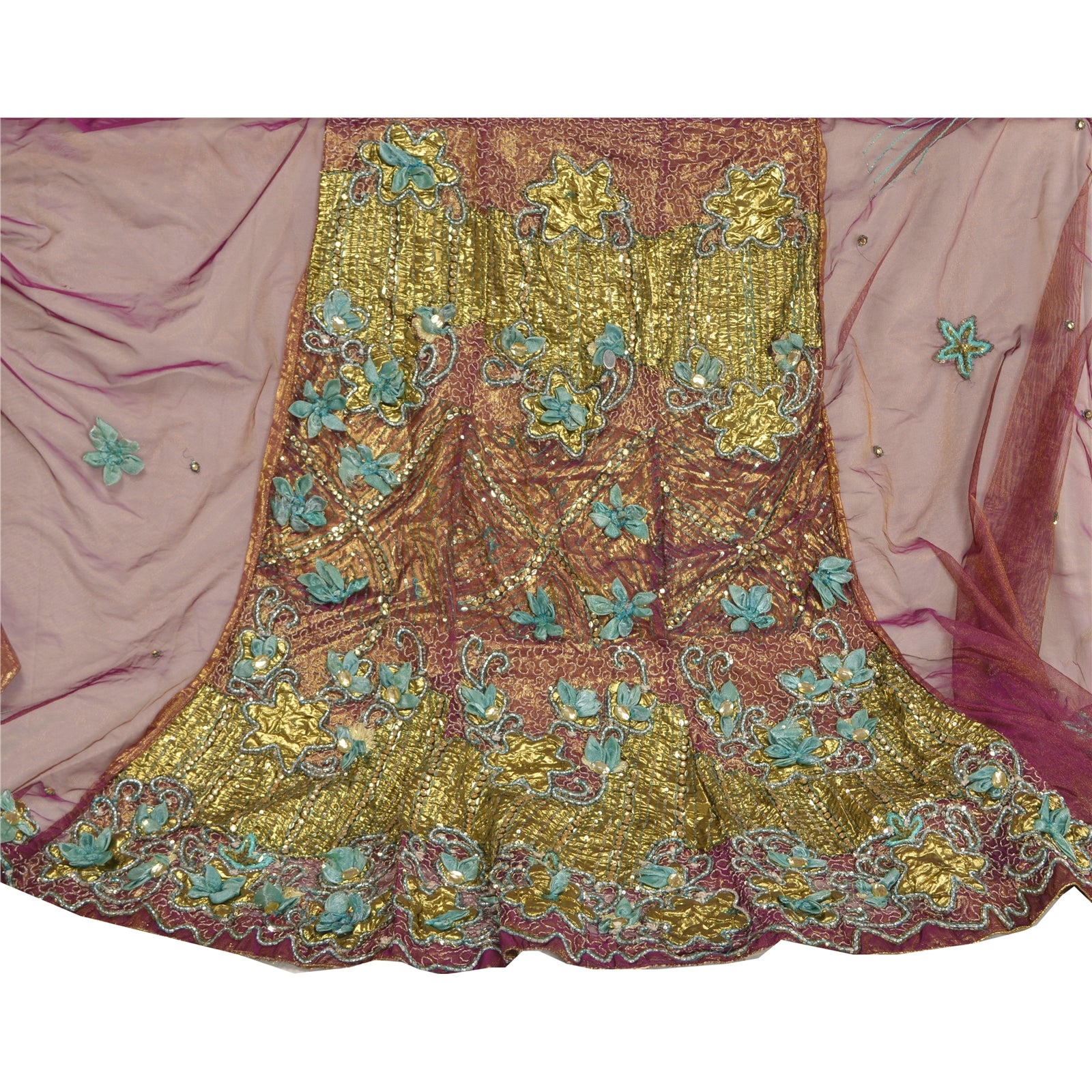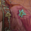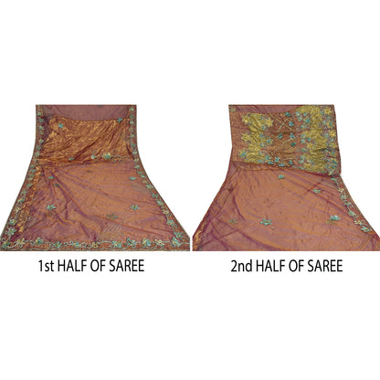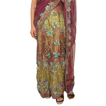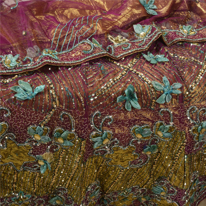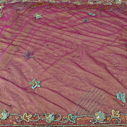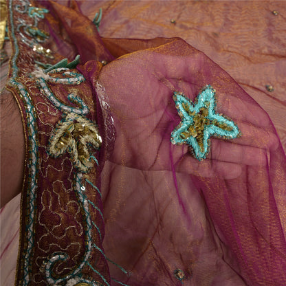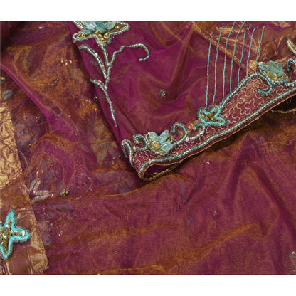 Sanskriti Vintage Purple Sarees Hand Beaded Net Sustainable Fabric 5 Yd Lehenga Party Sari