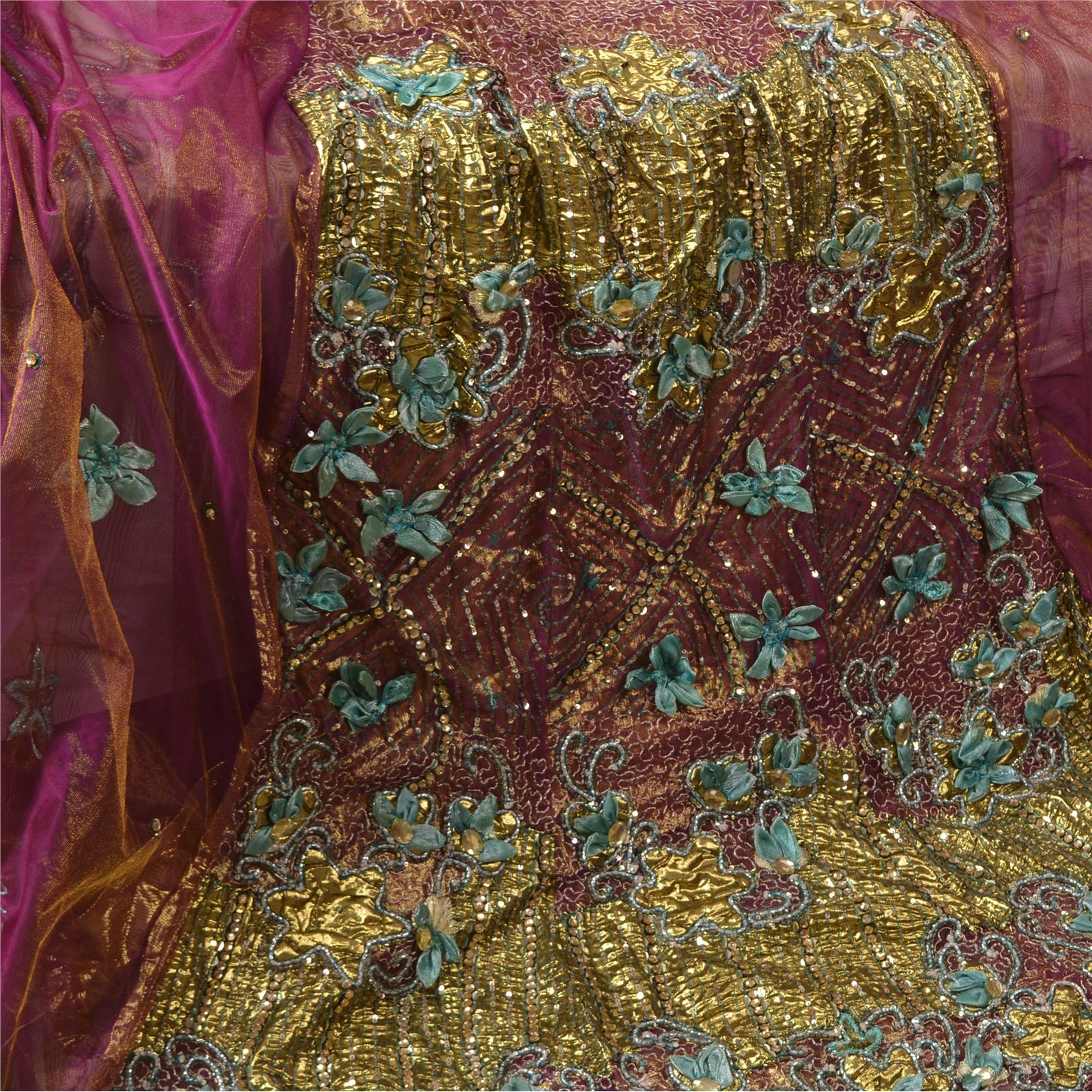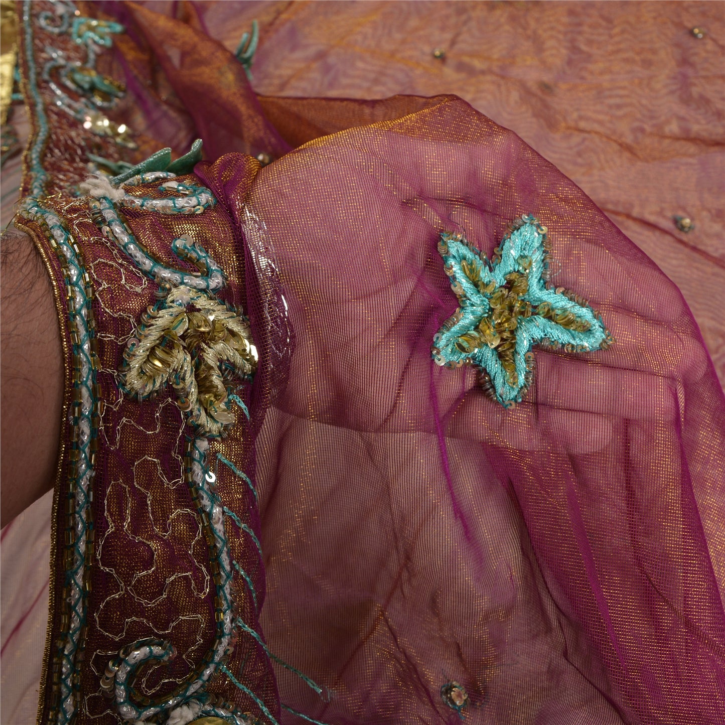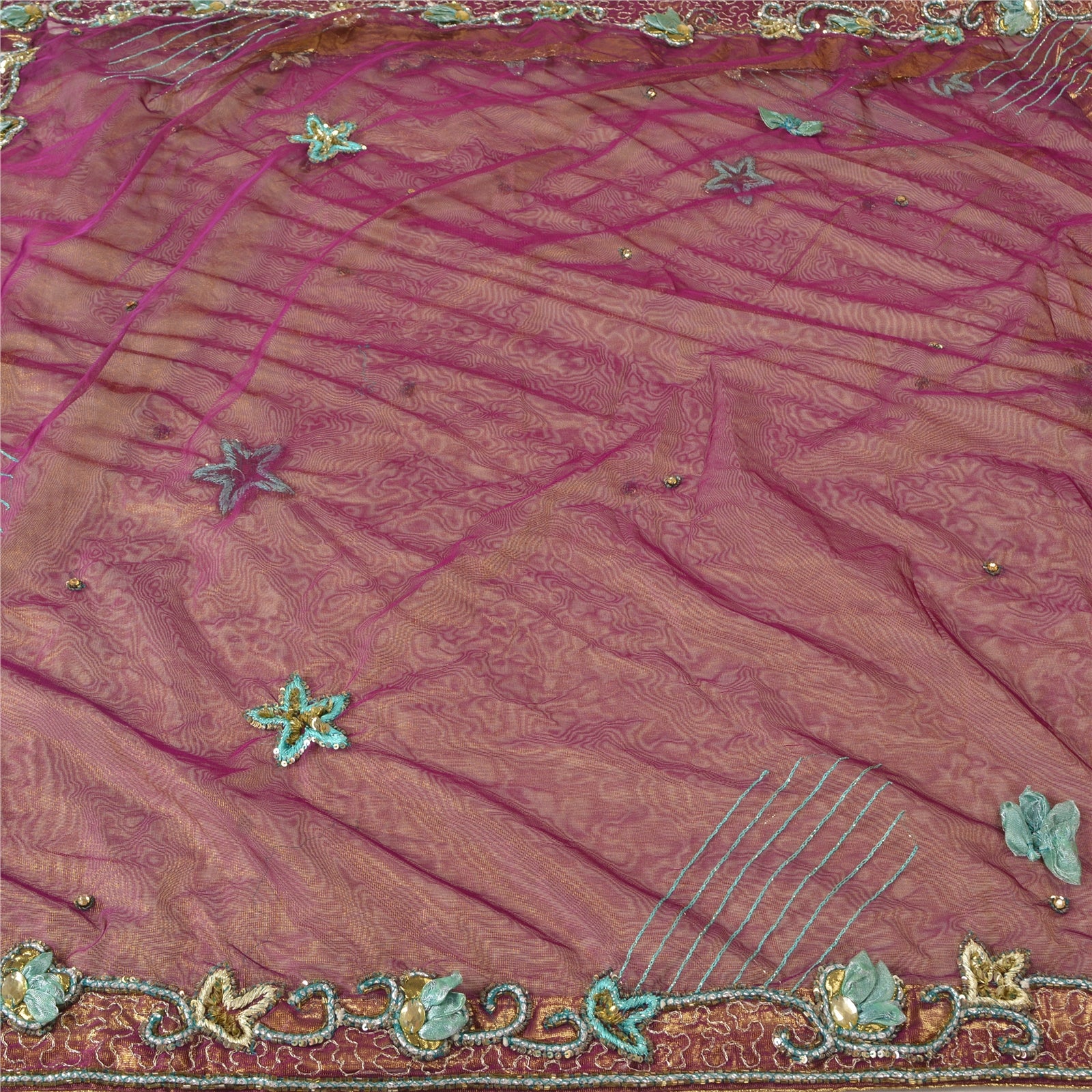 Sanskriti Vintage Purple Sarees Hand Beaded Net Sustainable Fabric 5 Yd Lehenga Party Sari