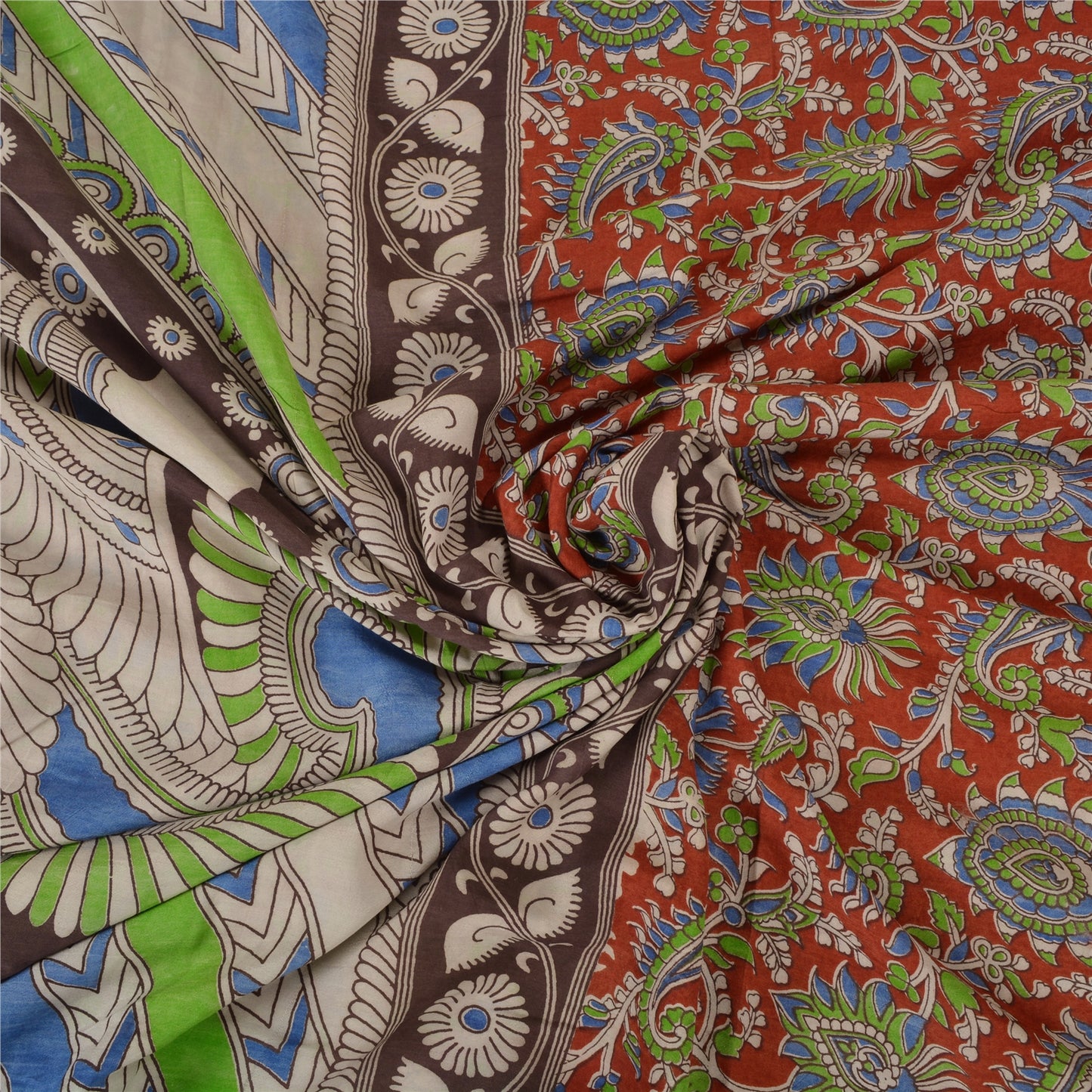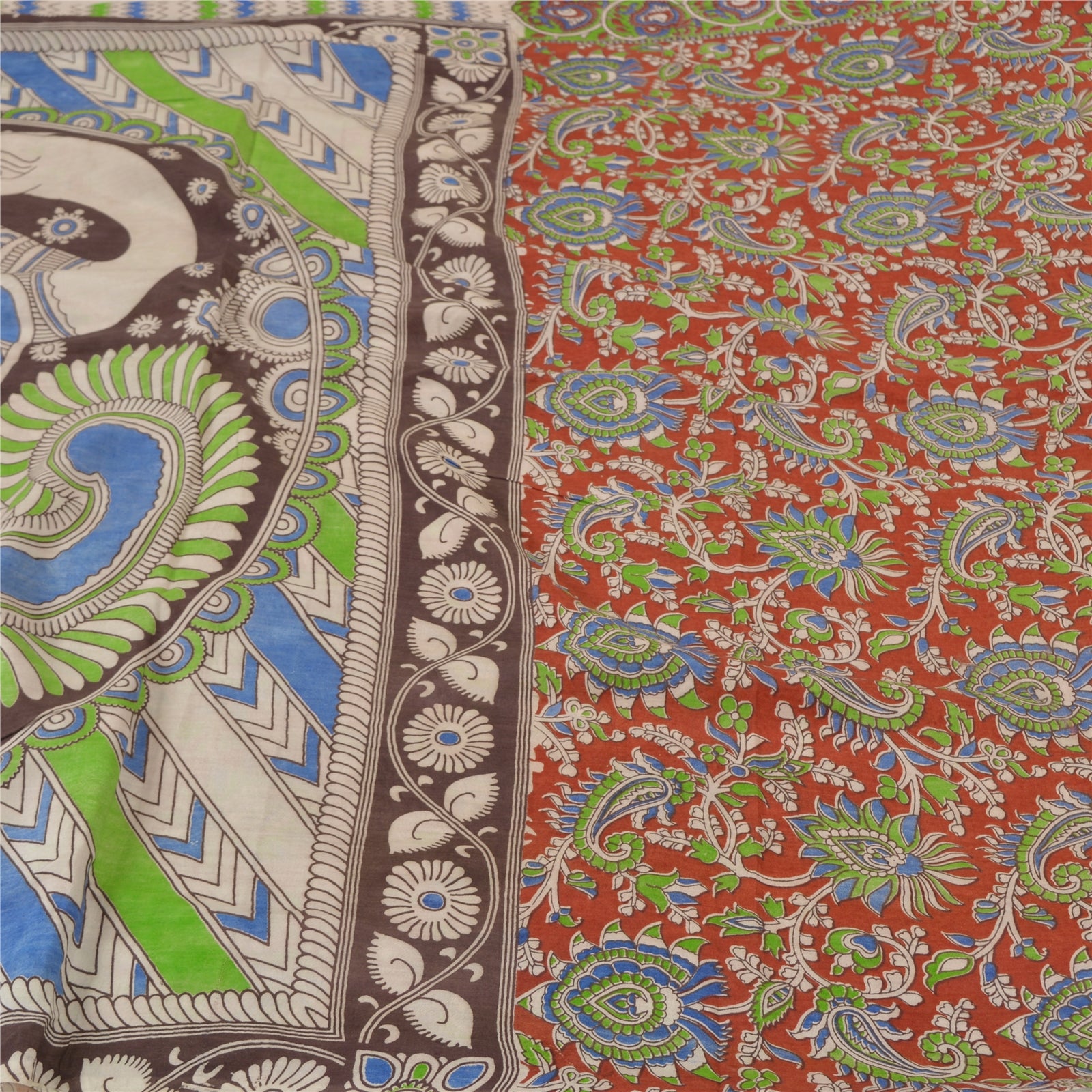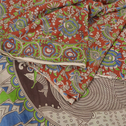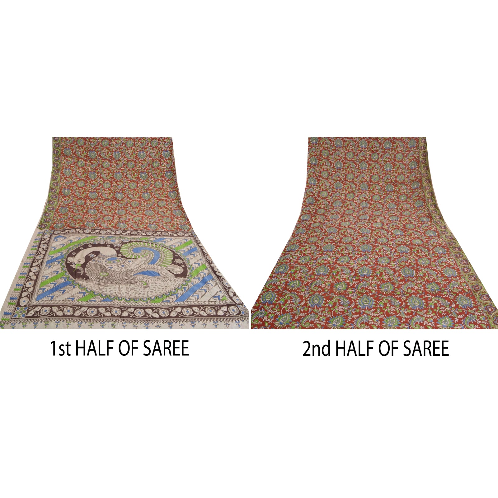 Sanskriti Vintage Red Indian Sarees Pure Cotton Kalamkari Peacock Sari Sustainable Fabric