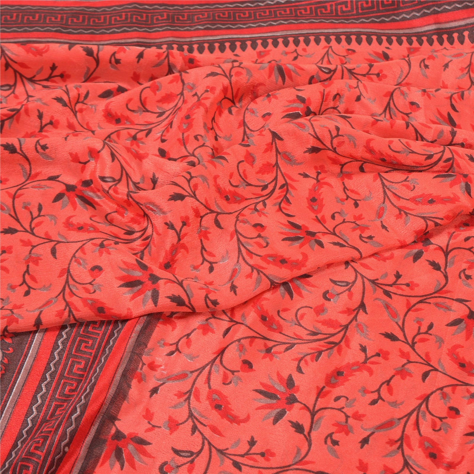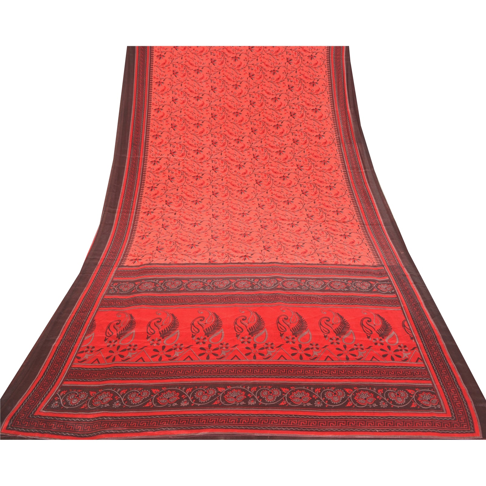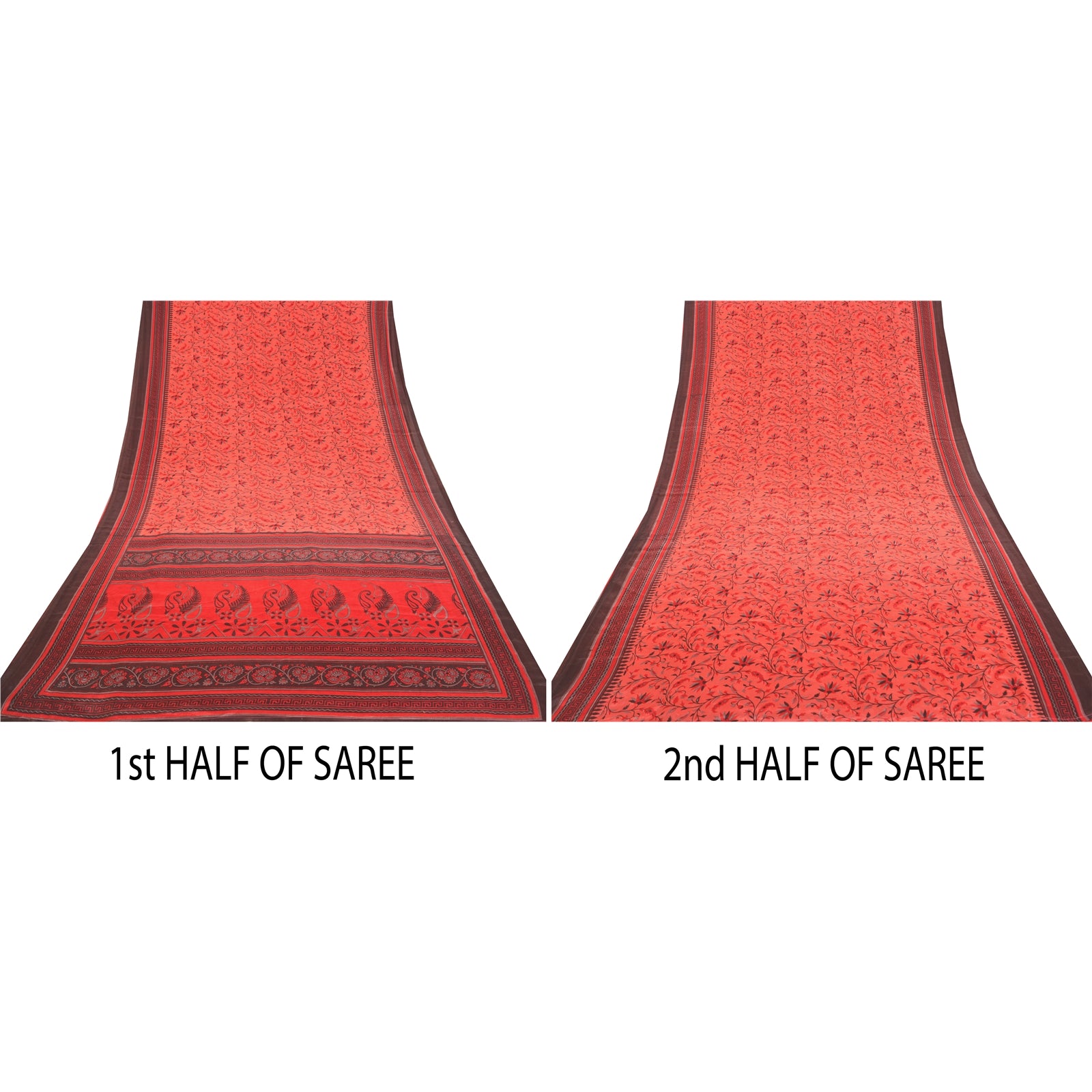 Beautiful peach and red colored printed moss crepe saree. Pallu & Border has printed floral & geometric design. Floral design in center part of sari. What is special about this saree? Nice floral design with extremely smooth moss crepe base fabric is really enhancing the beauty of the saree. This unique vintage saree can be used for various crafting ideas even if you don't want to use it as a sari. Design a dress, use it as a throw, as window dressing, upholstery, sarongs, table linen and much more. Let your creative juices flow and use this decorated fabric in multiple fashion. Please note - Buyers from Australia are required to pay postage. Registered air mail to Australia is temporarily suspended due to the pandemic. Once it goes back to normal we'll revert to free shipping. For now, we are using Aramex and DHL to ship orders. These services are expensive but faster compared to regular mail. Thank you for your support. If you are buying in bulk we will refund whatever excess is left. Contact us after that purchase. For USA buyers - Single item ships via registered air mail, buy 1 more to get FedEx.
