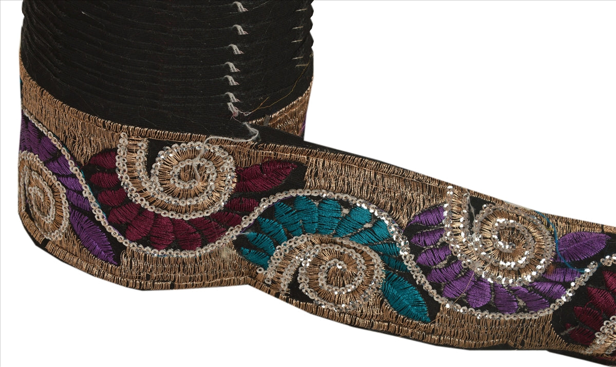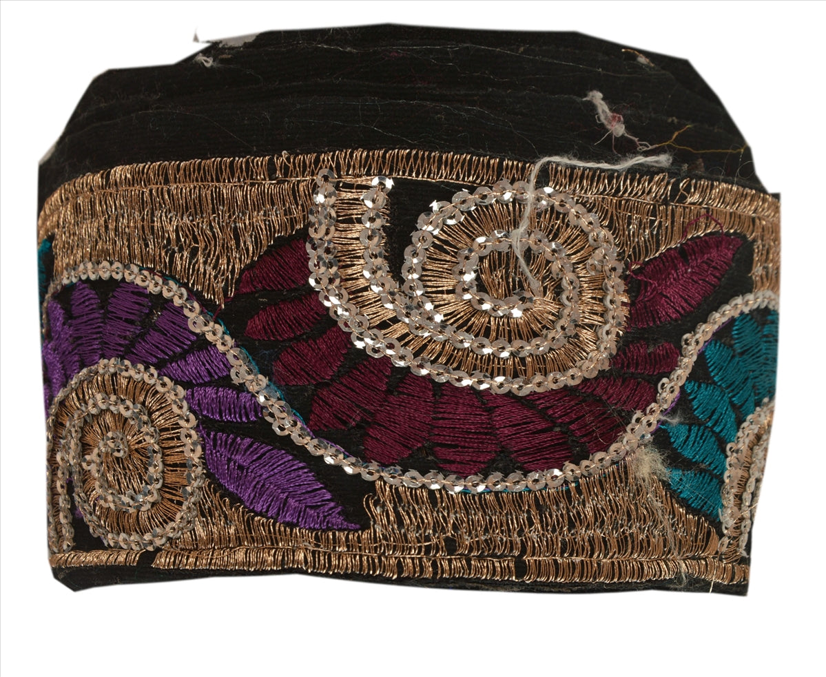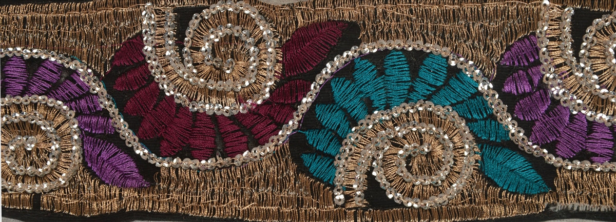 Beautiful art silk embroidered sari border. Further embellished by gold/green/purple thread work . Also you can see silver sequins work along with floral design on black base fabric 1 Quantity = 1 Yard B-10514.