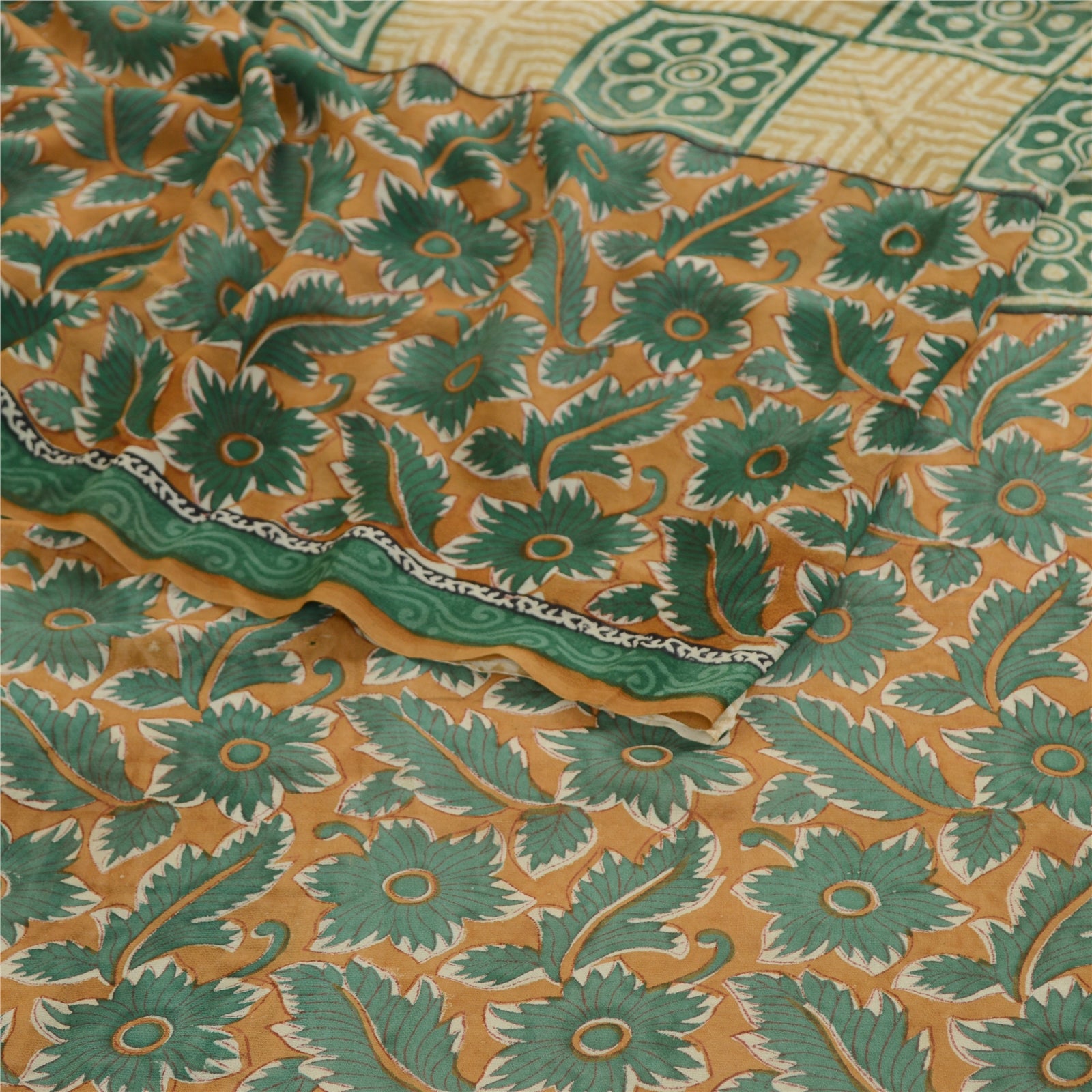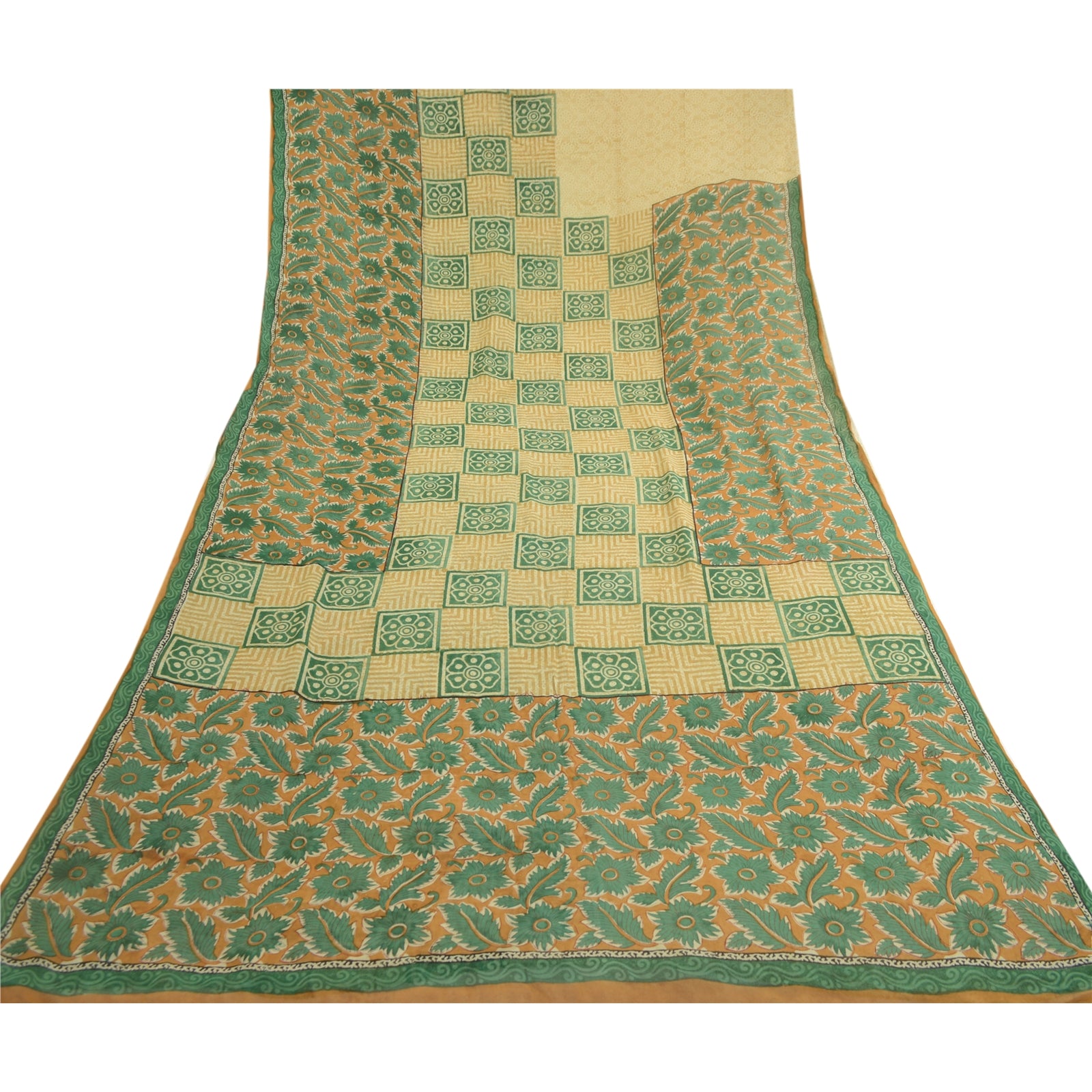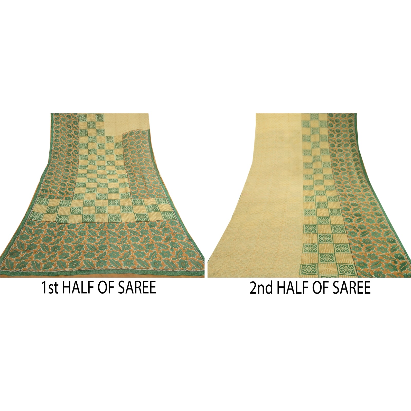 Beautiful green & cream colored pure georgette silk printed saree. Pallu & Border has printed floral design. Floral design in center part of saree. What is special about this saree? Brilliant design on soft Sustainable Fabric is really enhancing the beauty of the saree.This unique vintage saree can be used for various crafting ideas even if you don't want to use it as a sari. Design a dress, use it as a as window dressing, upholstery, sarongs, throw, dress making and table linen much more. Let your creative juices flow and use this decorated Sustainable Fabric in multiple fashion.