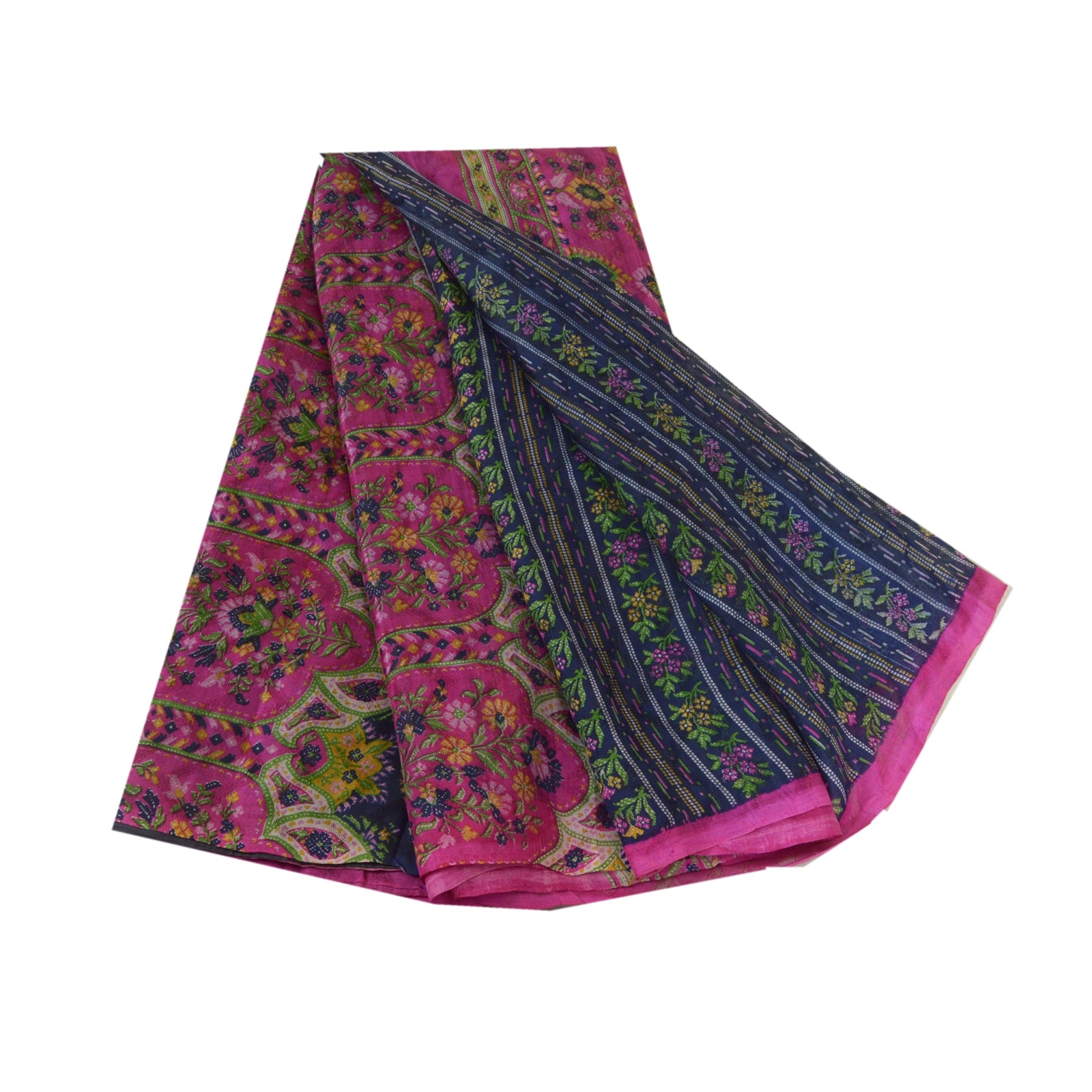 Sanskriti Vintage Sarees Blue/Pink Pure Silk Printed Sari Soft 5yd Craft Sustainable Fabric