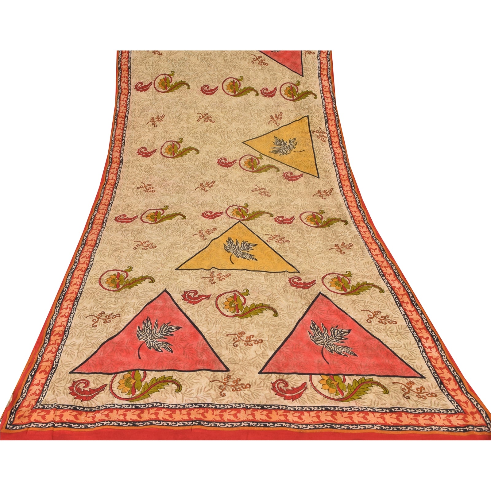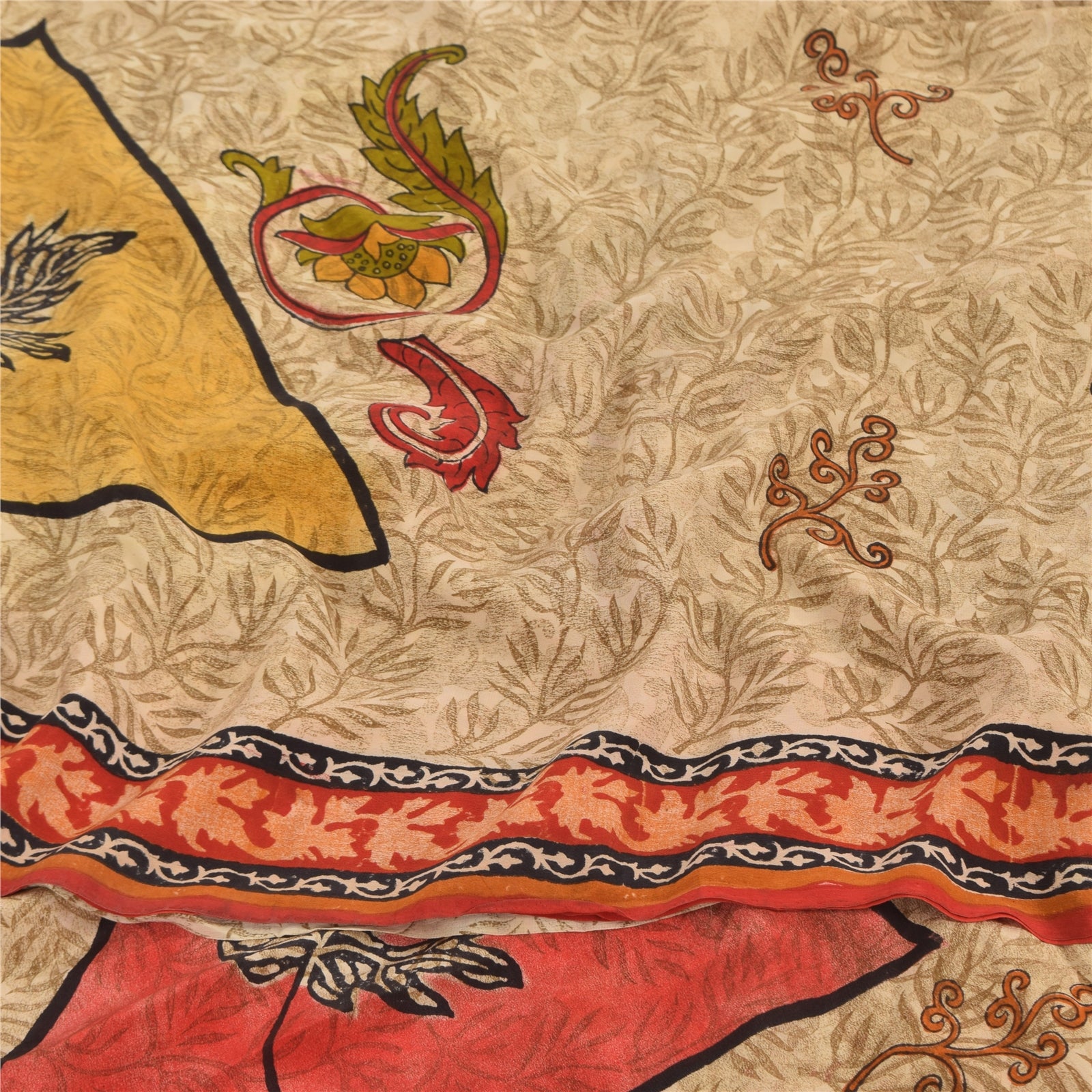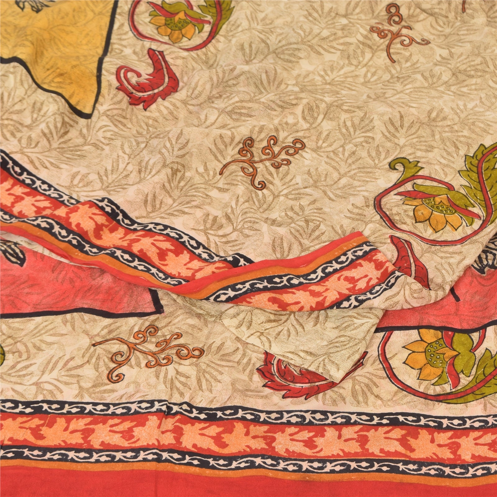 Sanskriti Vintage Sarees Cream 100%Pure Crepe Silk Printed Sari 5yd Craft Sustainable Fabric