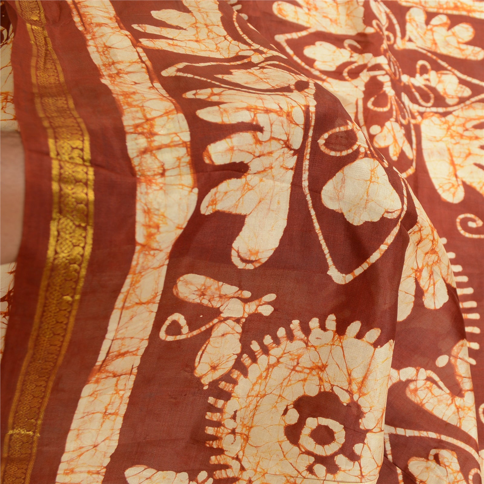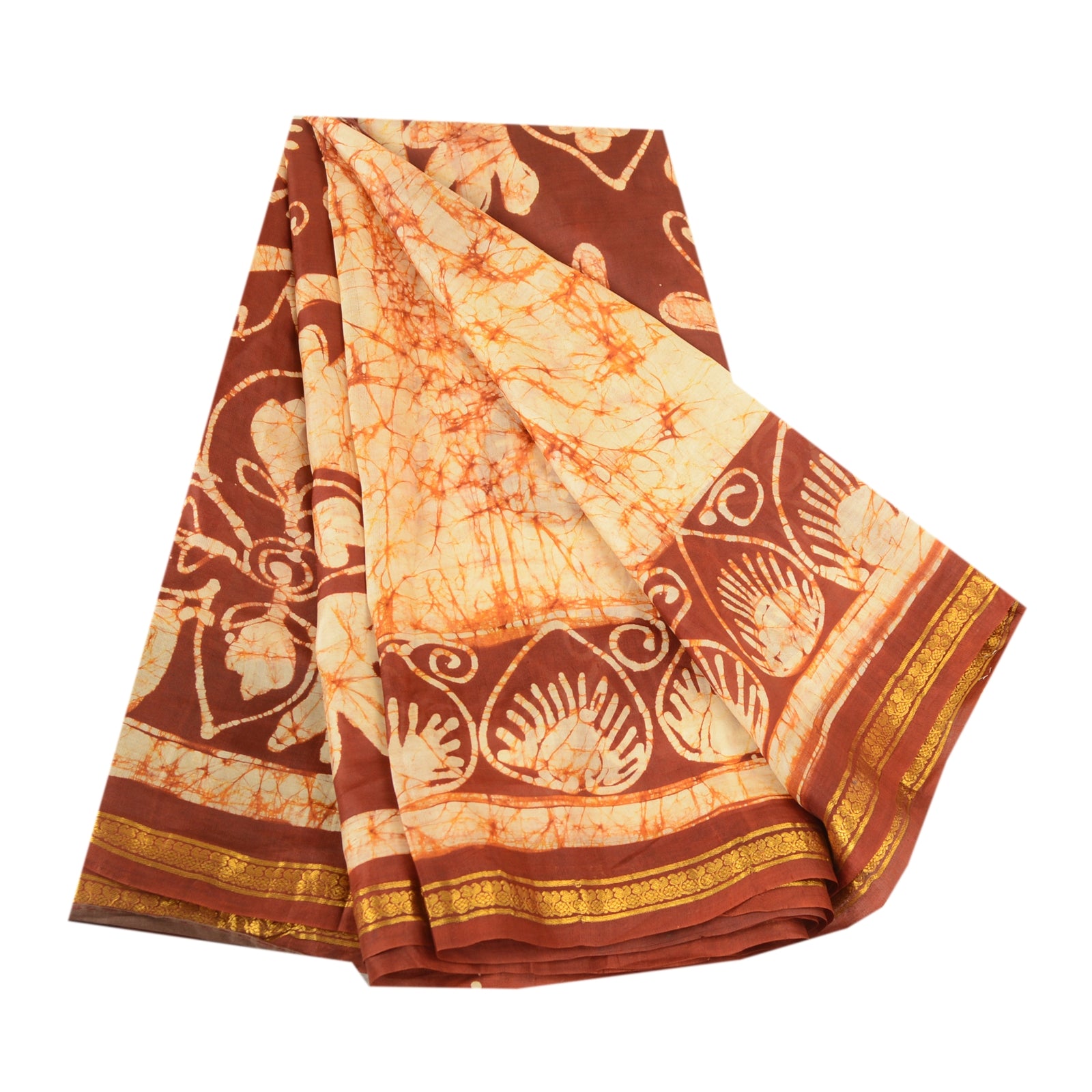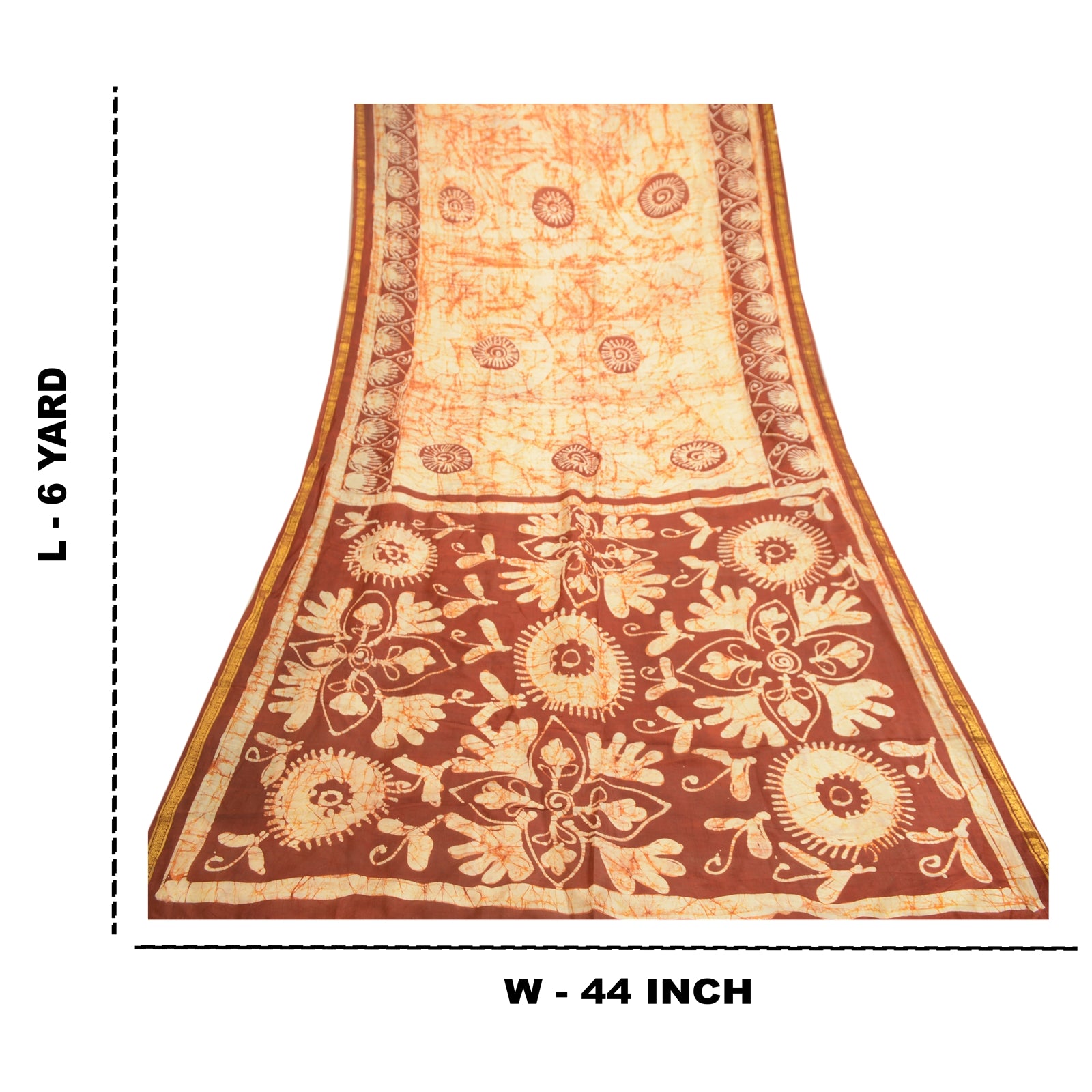Sanskriti Vintage Sarees Cream 100% Pure Silk Batik Printed Sari Craft Sustainable Fabric