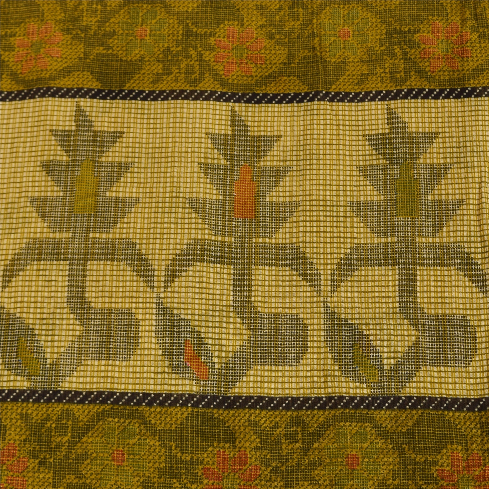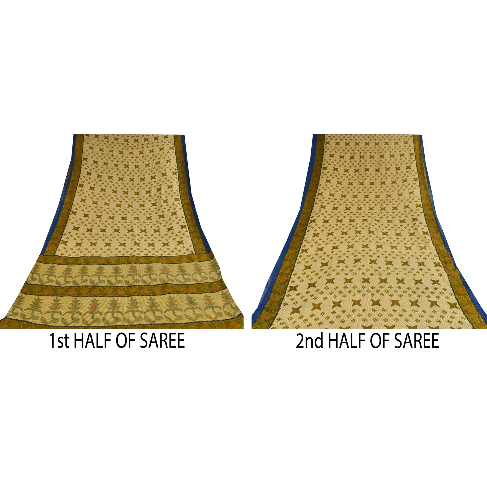 Sanskriti Vintage Sarees Cream/Green Pure Cotton Printed Sari 5+yd Craft Sustainable Fabric