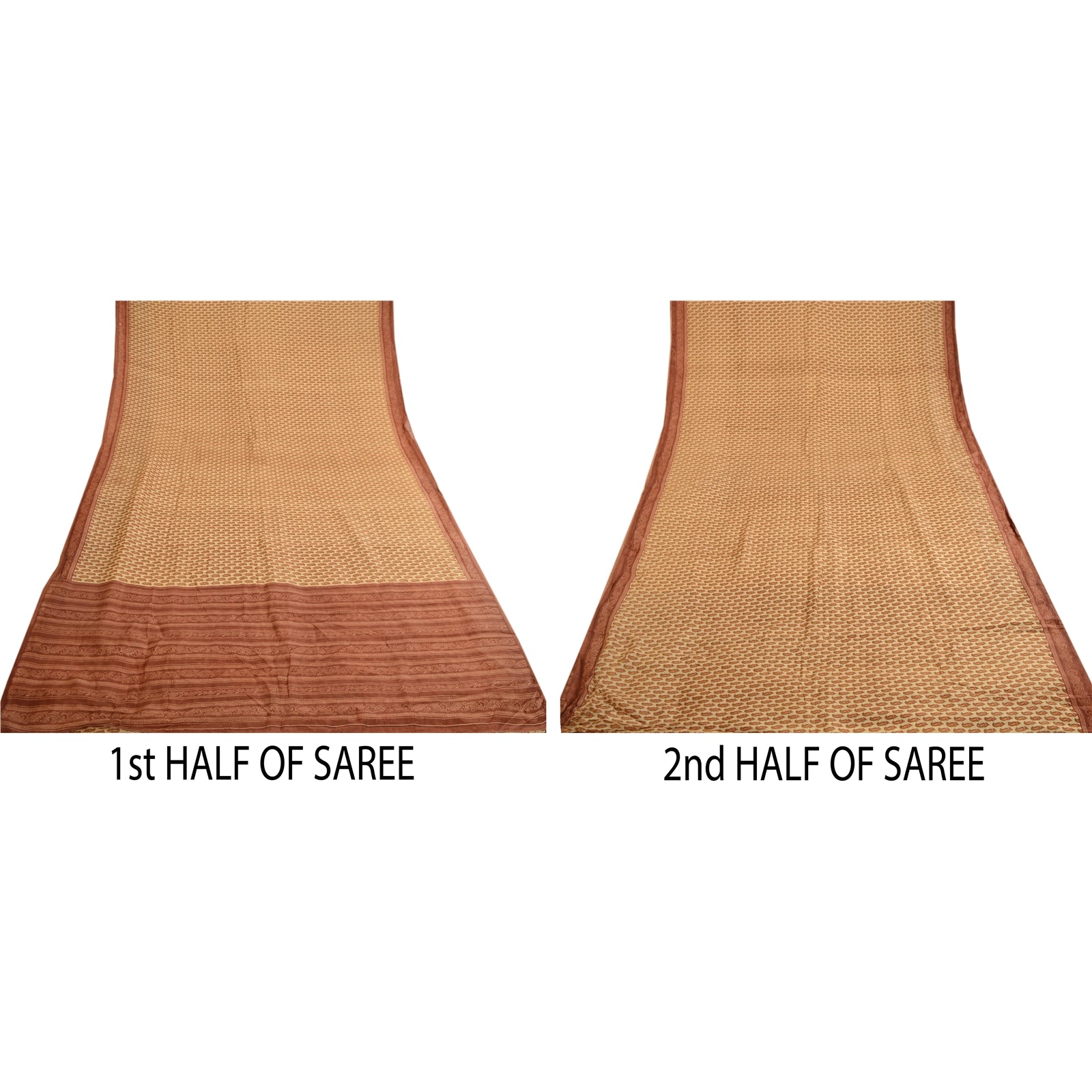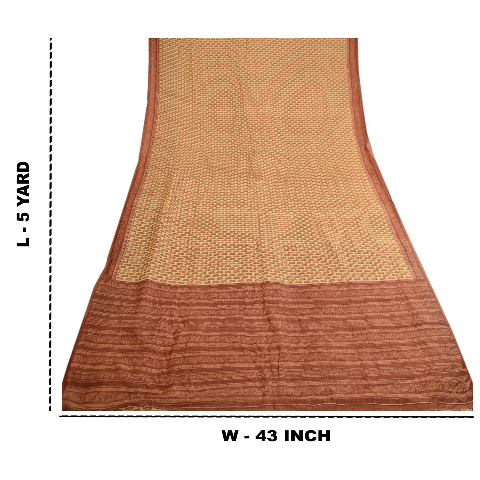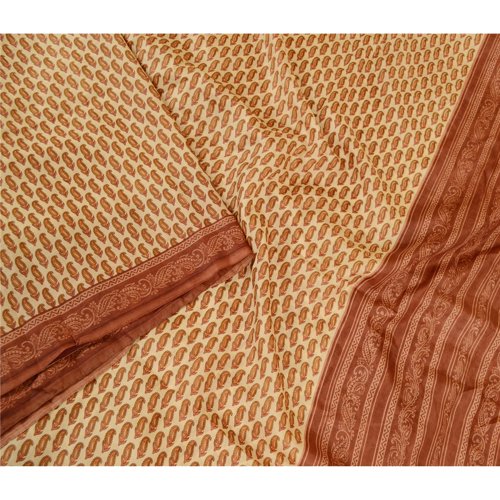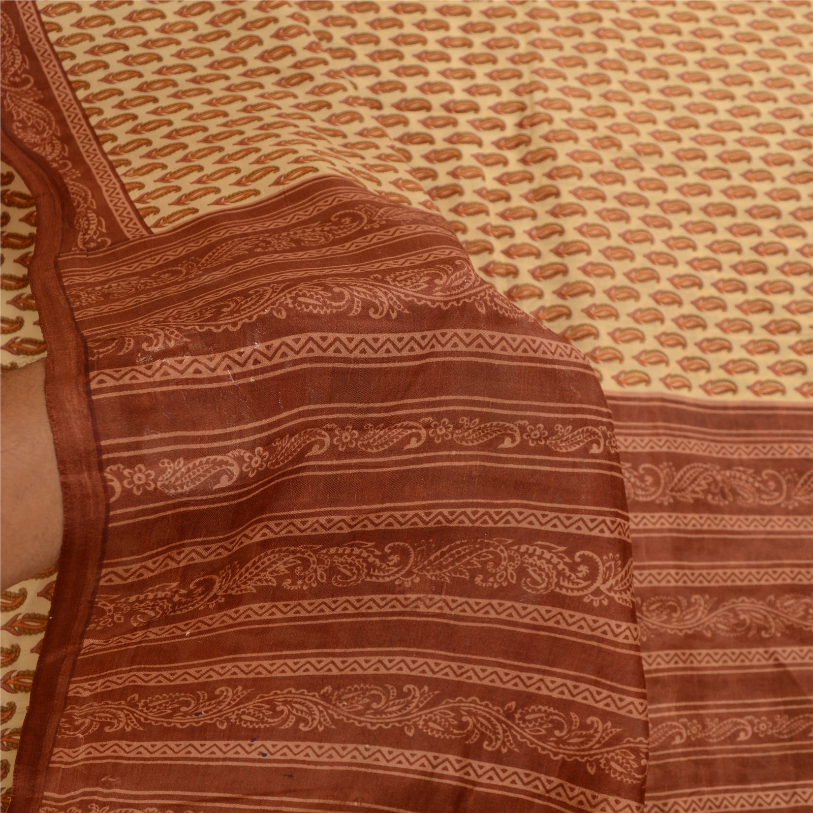 Beautiful cream & brown colored pure silk printed saree. Pallu & Border has printed floral design. Similar design in center part of saree. What is special about this saree? Fabulous design is really enhancing the beauty of the saree.This unique vintage saree can be used for various crafting ideas even if you don't want to use it as a sari. Design a dress, use it as window,dressing, upholstery, sarongs, throw, dress making and table linen much more. Let your creative juices flow and use this decorated Sustainable Fabric in multiple fashion.