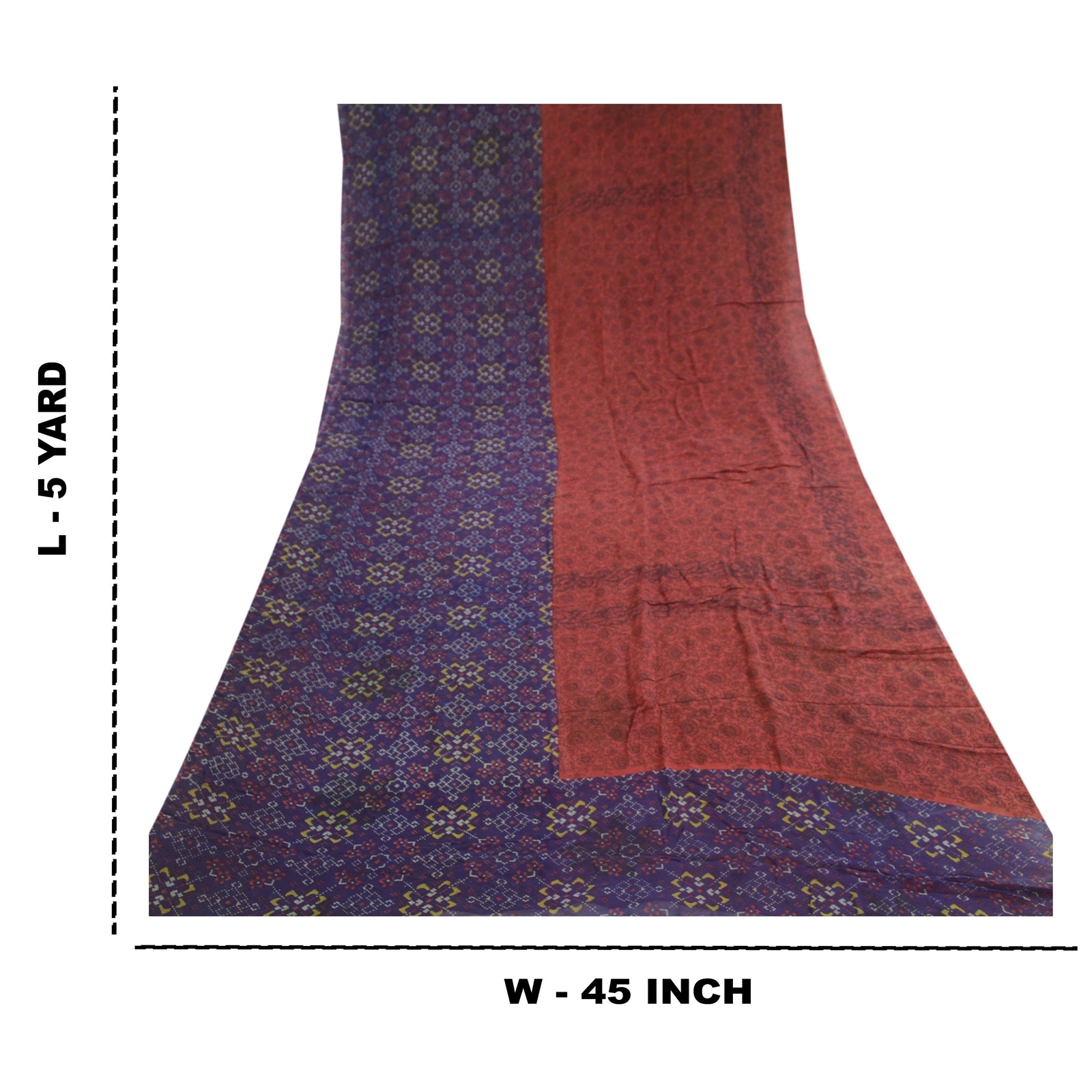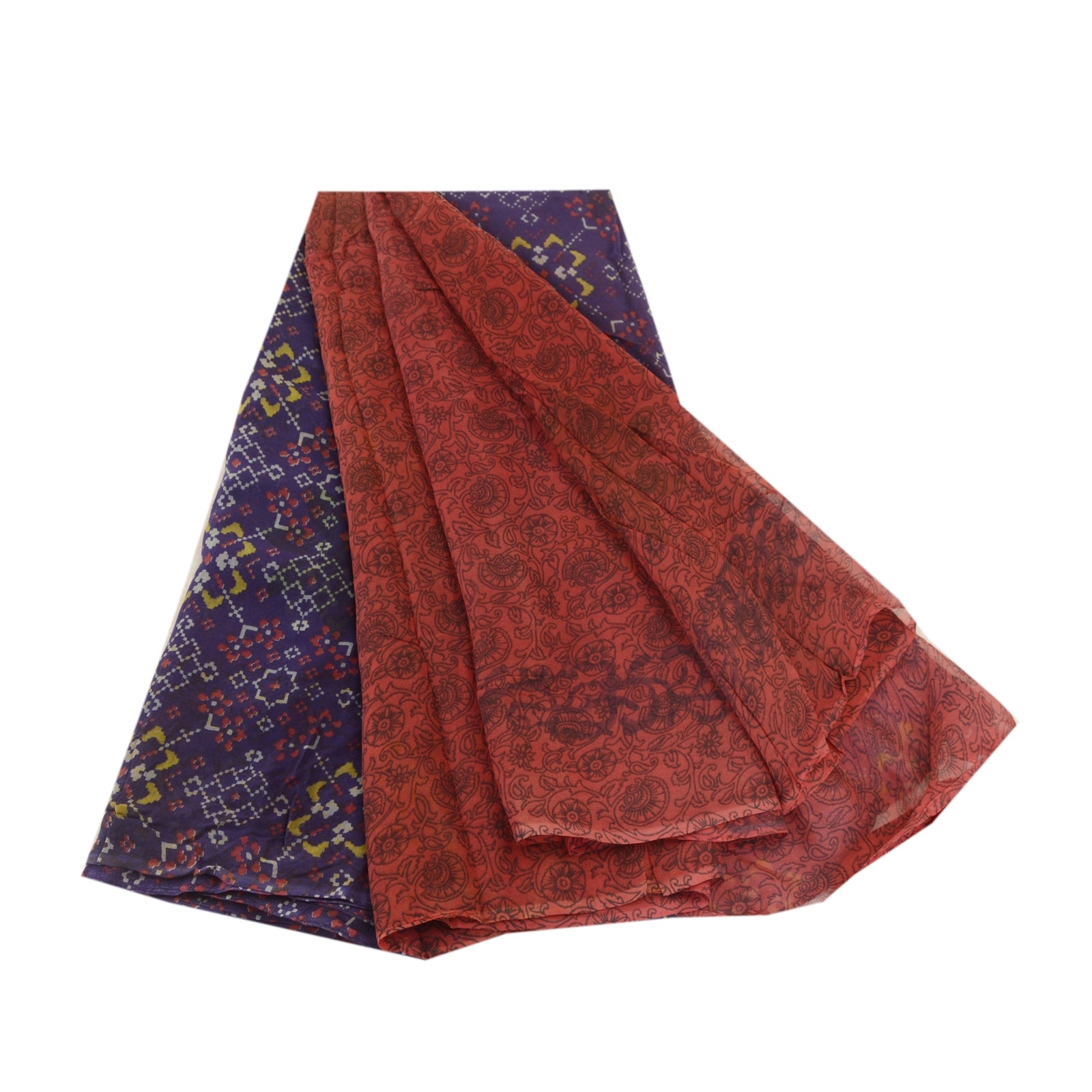 Beautiful dark red & blue colored pure georgette silk printed saree. Pallu & Border has printed floral & geometric design. Floral design in center part of saree. What is special about this saree? Brilliant design on soft Sustainable Fabric is really enhancing the beauty of the saree.This unique vintage saree can be used for various crafting ideas even if you don't want to use it as a sari. Design a dress, use it as a as window dressing, upholstery, sarongs, throw, dress making and table linen much more. Let your creative juices flow and use this decorated Sustainable Fabric in multiple fashion.