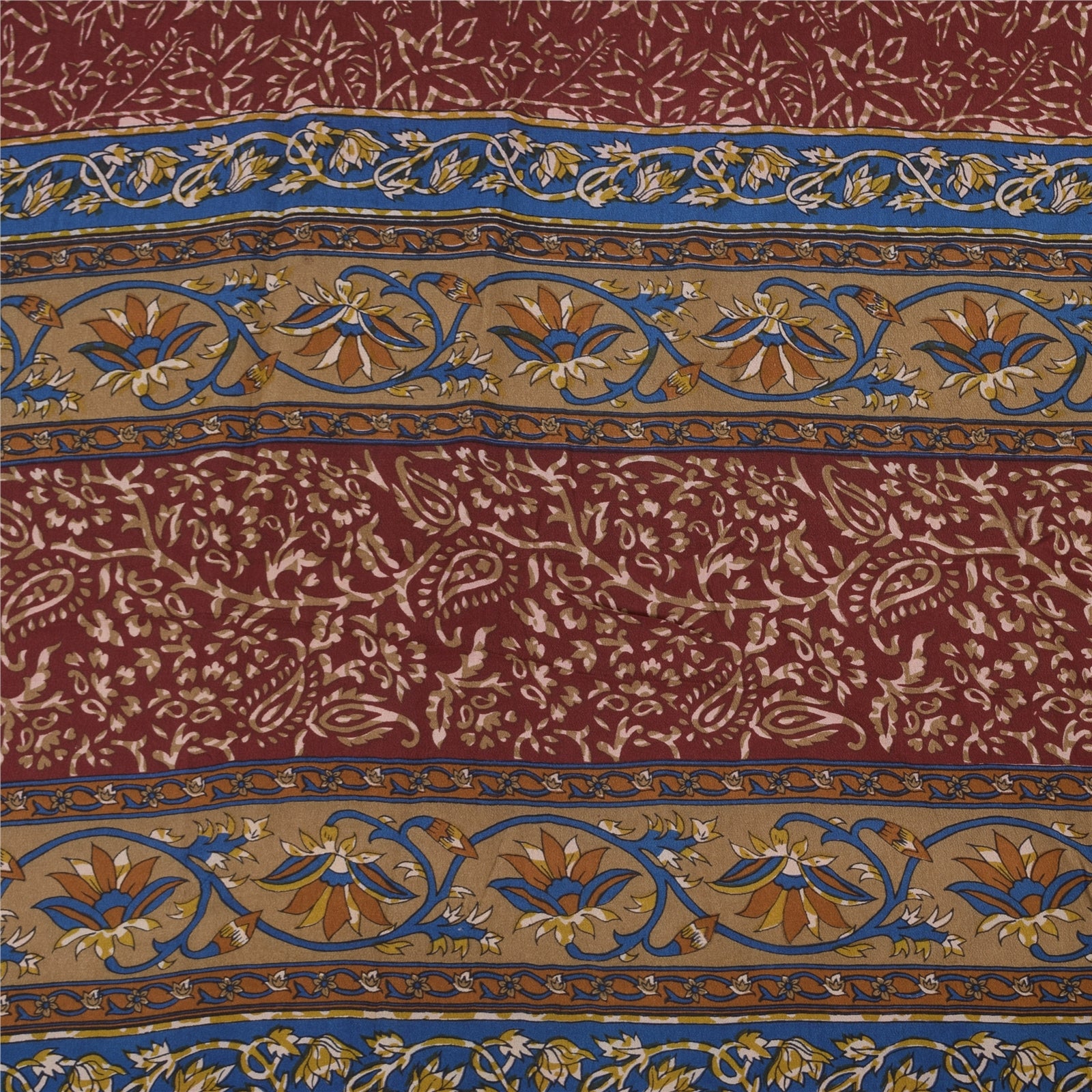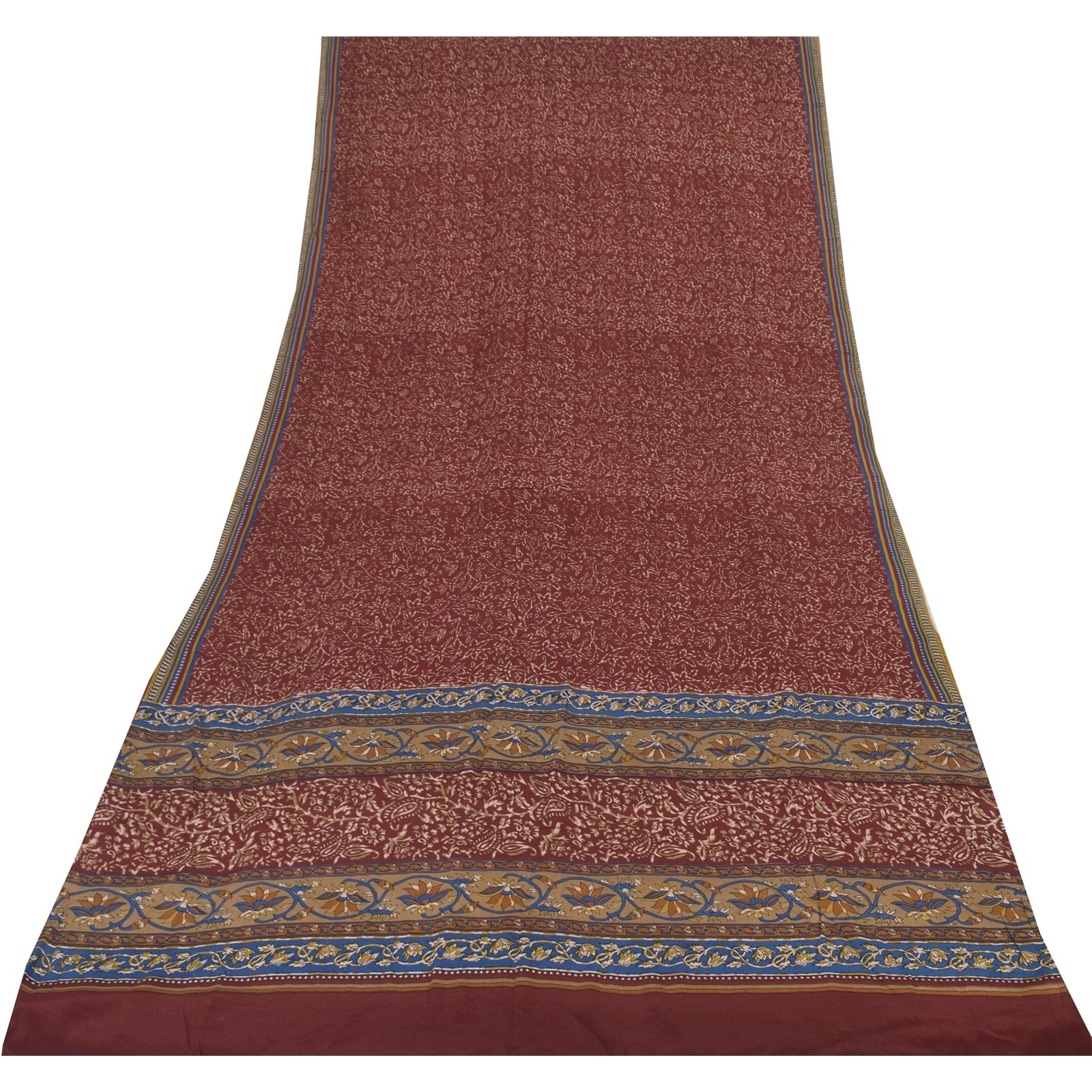 Sanskriti Vintage Sarees Dark Red Pure Crepe Silk Printed Sari 5+yd Craft Fabric