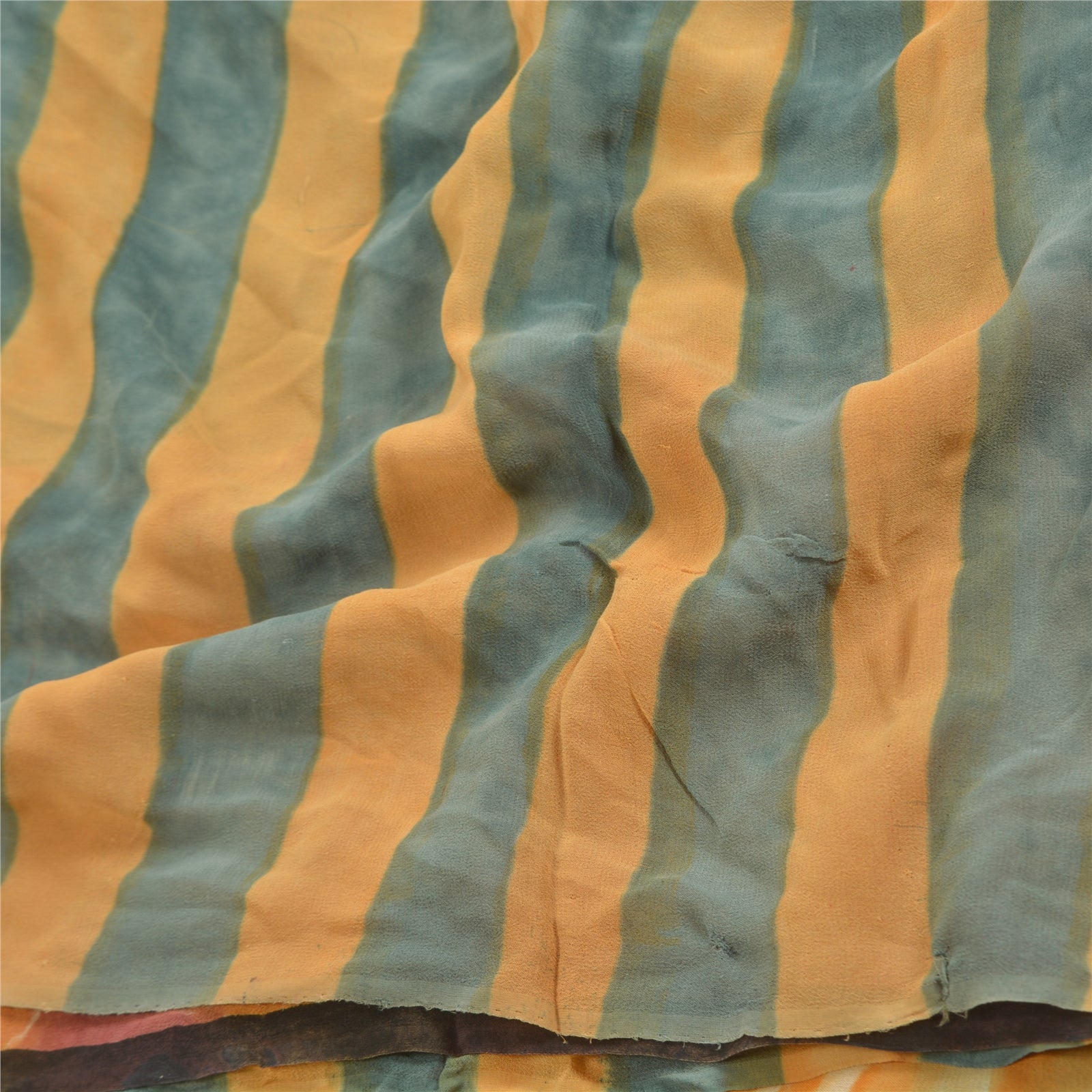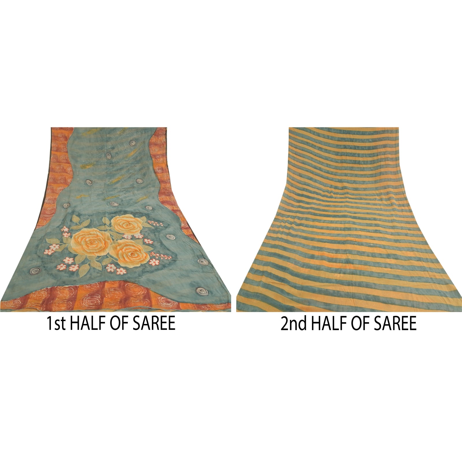 Beautiful gray & orange colored pure georgette silk printed saree. Pallu & Border has printed floral design. Strip lines design in center part of saree. What is special about this saree? Brilliant design on soft Sustainable Fabric is really enhancing the beauty of the saree.This unique vintage saree can be used for various crafting ideas even if you don't want to use it as a sari. Design a dress, use it as a as window dressing, upholstery, sarongs, throw, dress making and table linen much more. Let your creative juices flow and use this decorated Sustainable Fabric in multiple fashion.