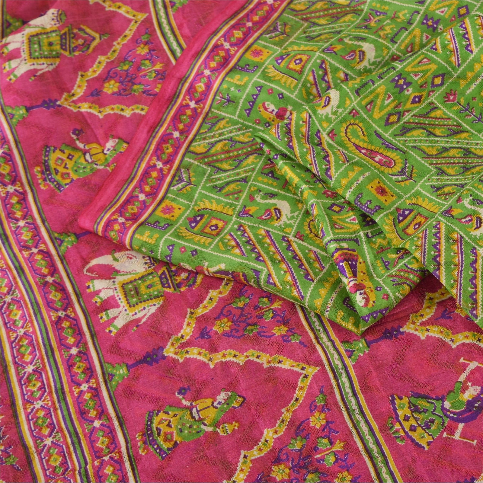 Sanskriti Vintage Sarees Green Human Animal Printed Pure Silk Sari 5yd Sustainable Fabric