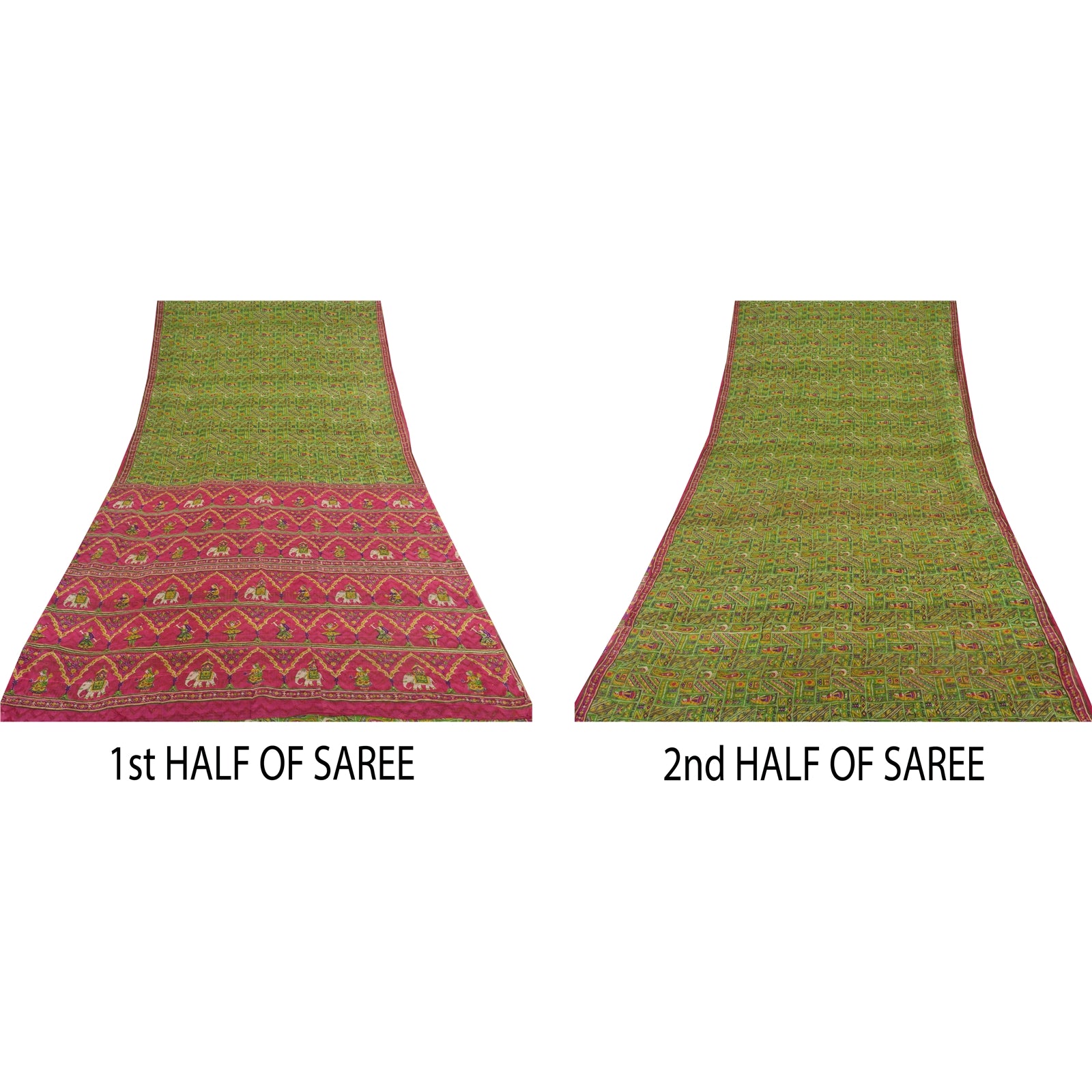 THE ITEM COLOR OR SHADE MAY BE DARKER OR LIGHTER THAN THE PICTURE.' • Beautiful green colored printed pure silk saree . • Pallu & Border has printed floral, elephant cart, dancing human design. • Similar design in center part of sari . This unique vintage saree can be used for various crafting ideas even if you don't want to use it as a sari. Design a dress, use it as a as window dressing, upholstery, sarongs, throw, dress making and table linen much more. Let your creative juices flow and use this decorated Sustainable Fabric in multiple fashion. International buyers please note: Import duties, taxes, and charges are not included in the item price or postage cost. These charges are the buyer's responsibility. Please check with your country's customs office to determine what these additional costs will be prior to bidding or buying.Buyer will pay custom duty/tax. It is calculated and charged differently by every country. As a seller I do not have any control over it. VAT or sales tax is calculated by the platform at the time of checkout. Customs charge is payable at the time of delivery.