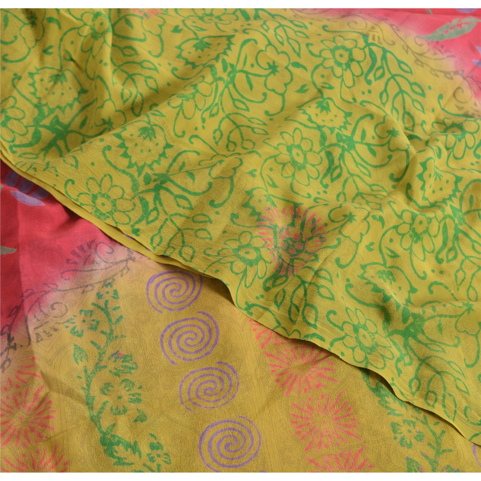 Sanskriti Vintage Sarees Green/Pink Pure Crepe Silk Printed Sari Craft Sustainable Fabric