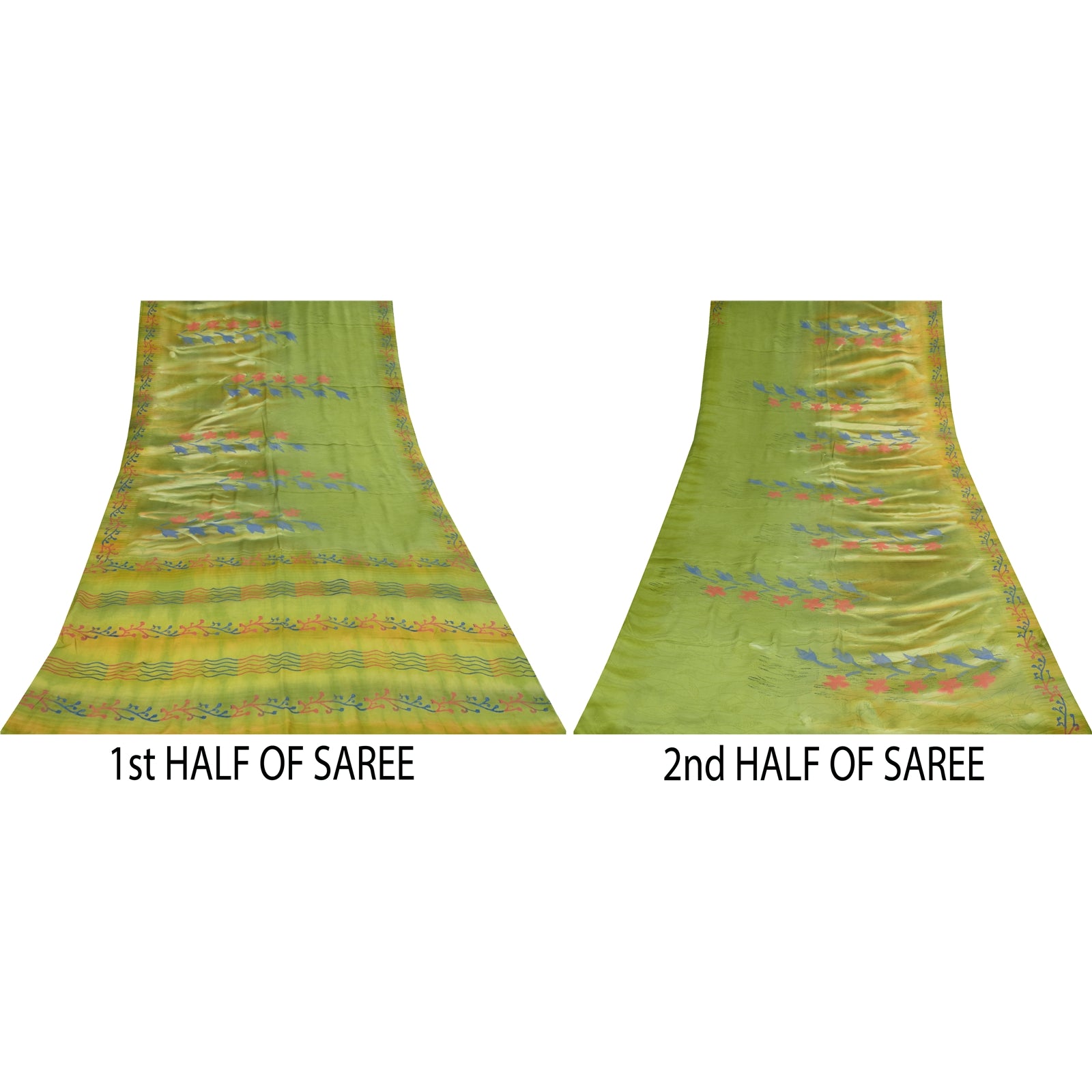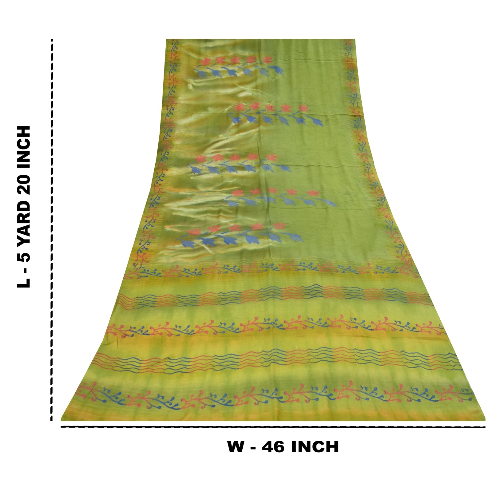 Sanskriti Vintage Sarees Green Pure Crepe Silk Printed Sari 5+yd Craft Fabric