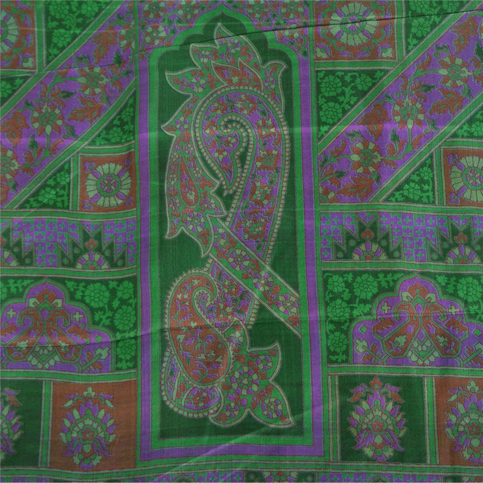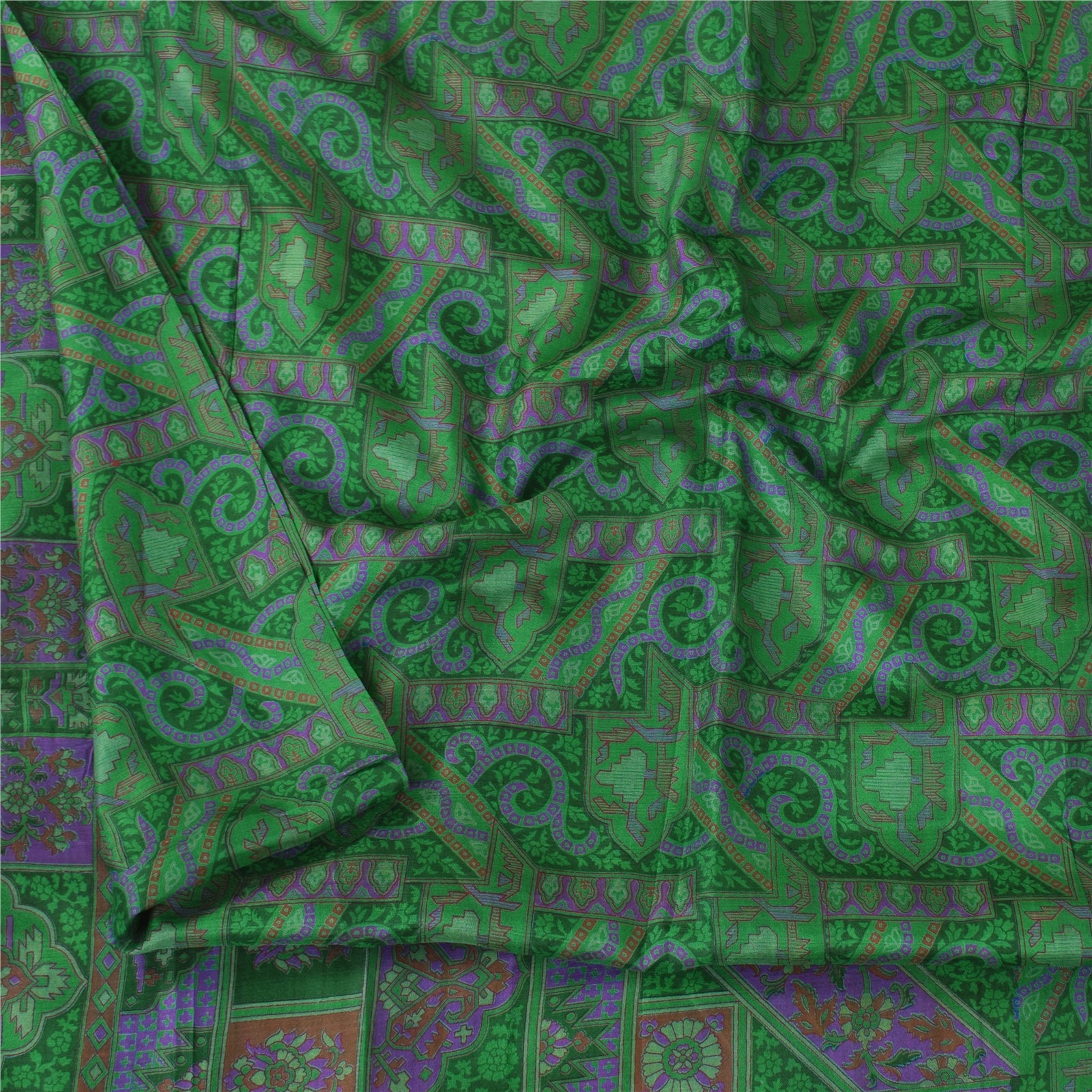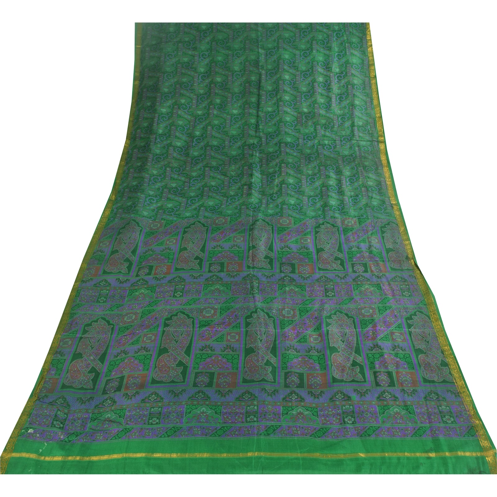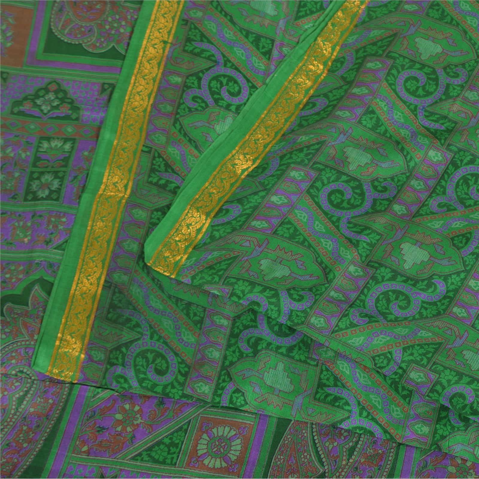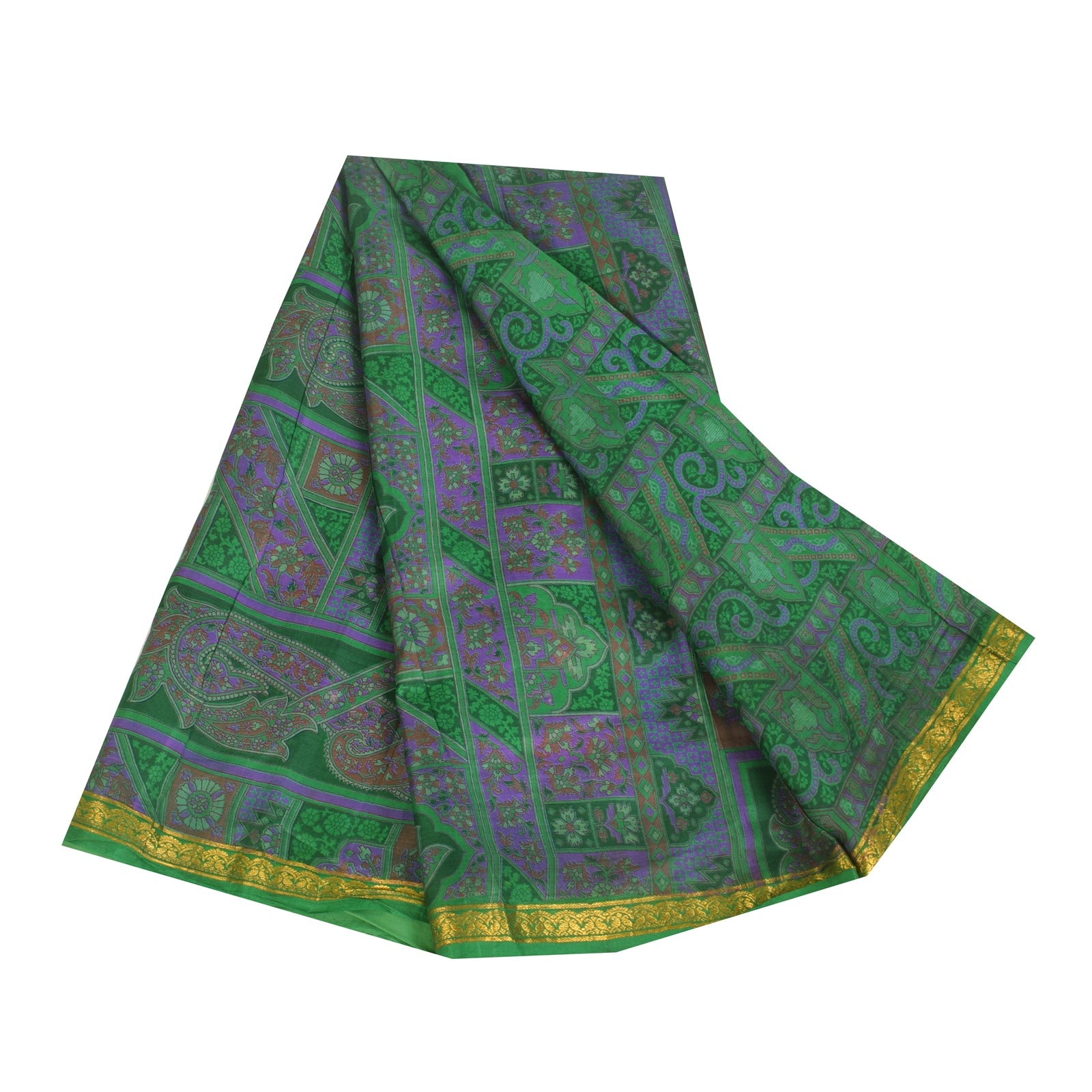 Sanskriti Vintage Sarees Green Zari Border Pure Silk Printed Sari 6+yd Fabric