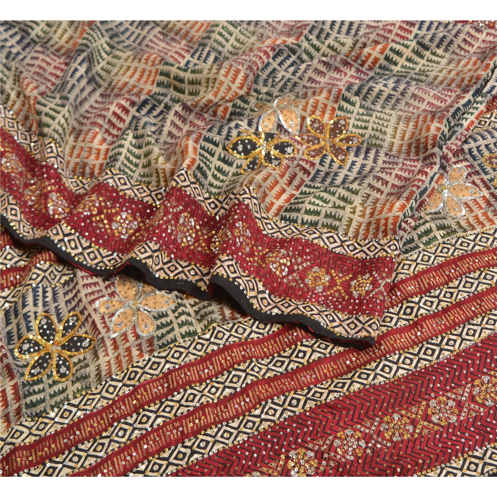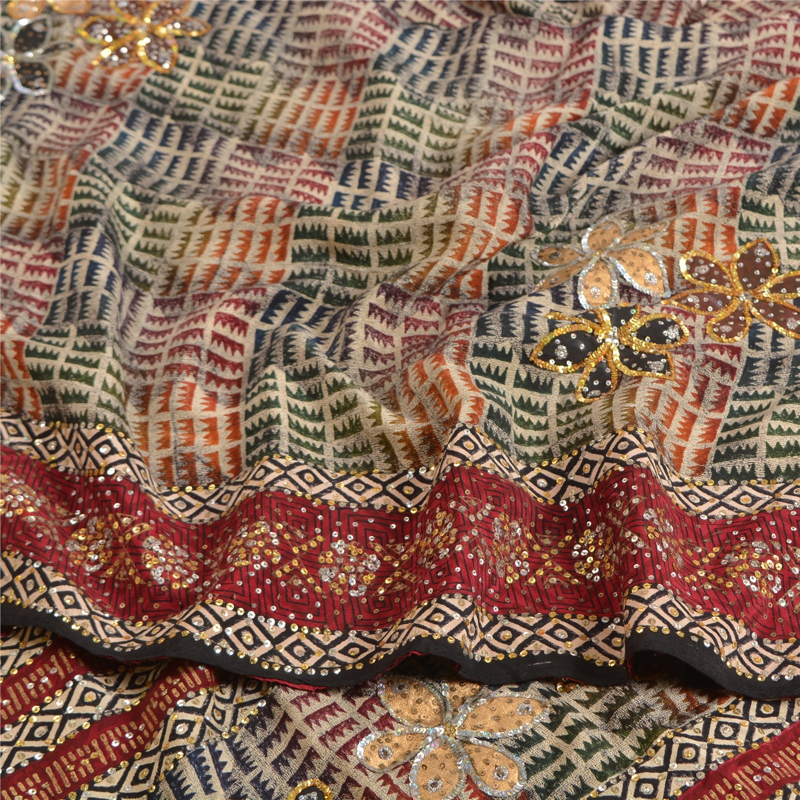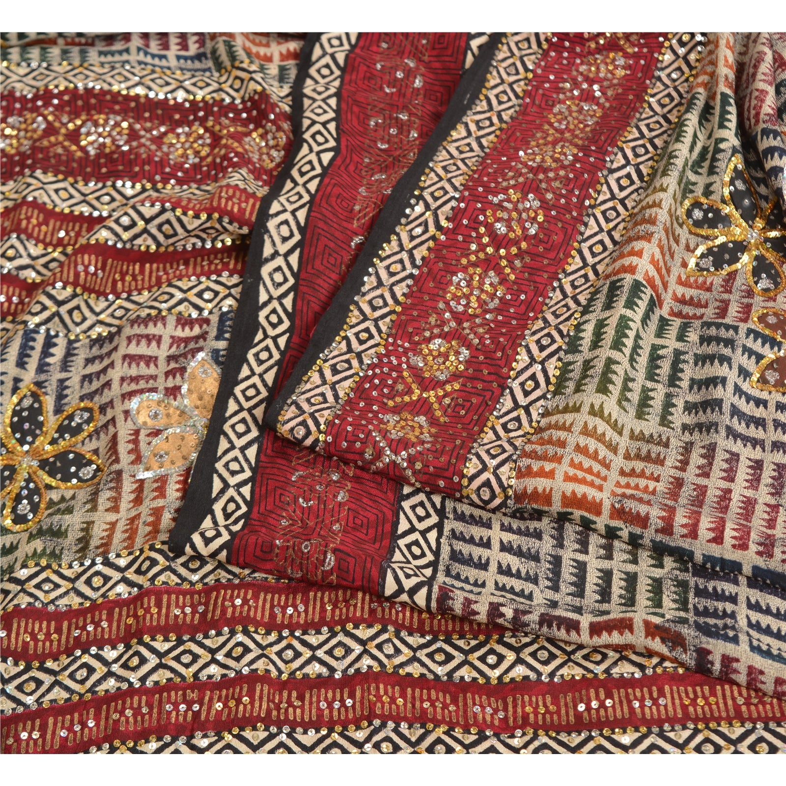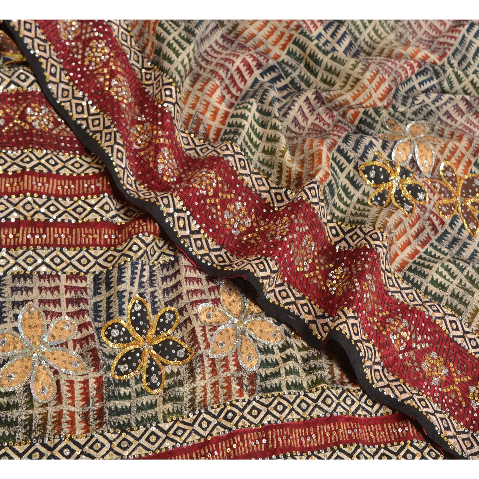 Sanskriti Vintage Sarees Hand Beaded Printed Pure Crepe Silk Sari Craft Sustainable Fabric
