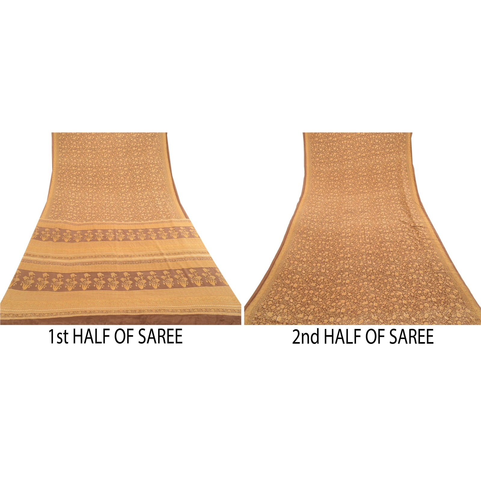 Sanskriti Vintage Sarees Indian Brown Moss Crepe Sari Printed Soft Craft Fabric
