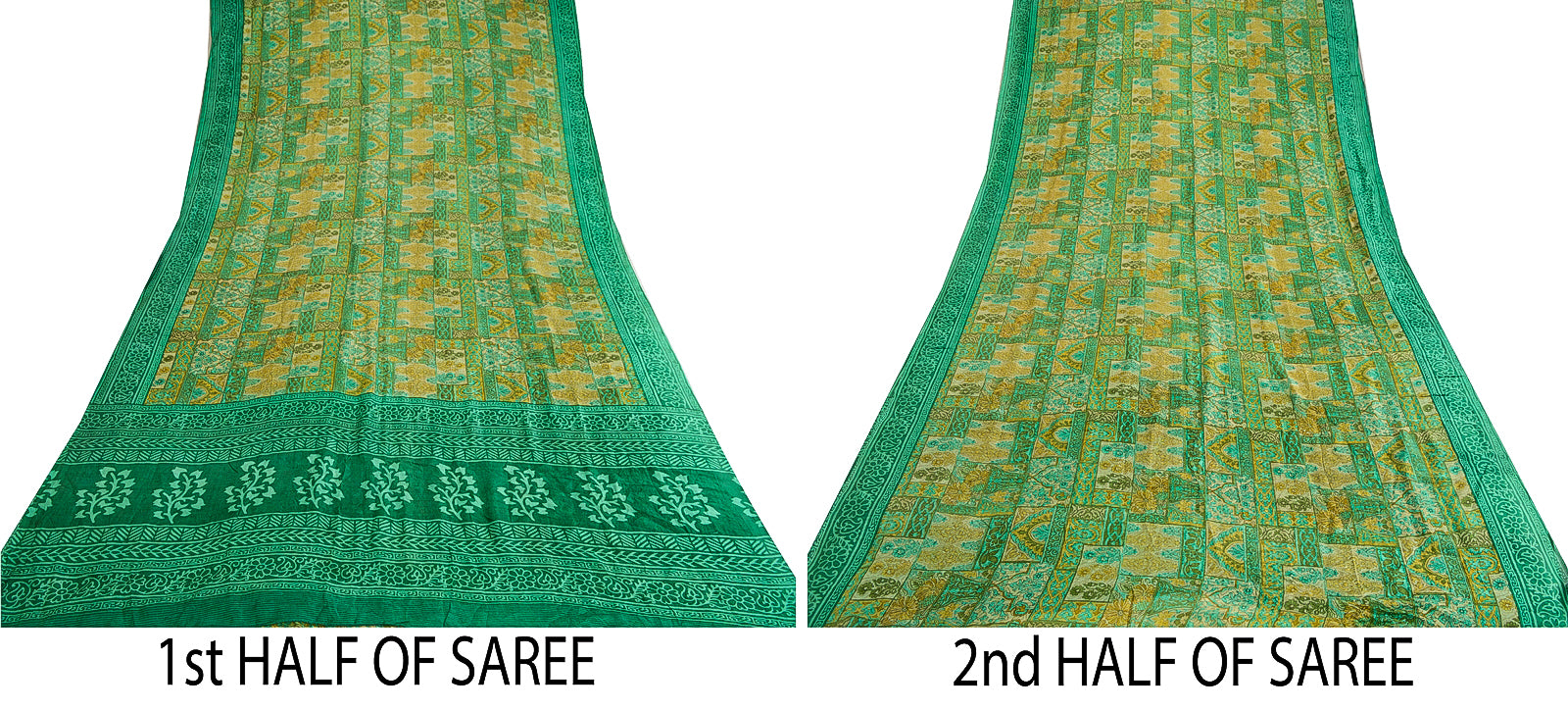 Sanskriti Vintage Sarees Indian Green Pure Silk Printed Sari 5yd Craft Sustainable Fabric