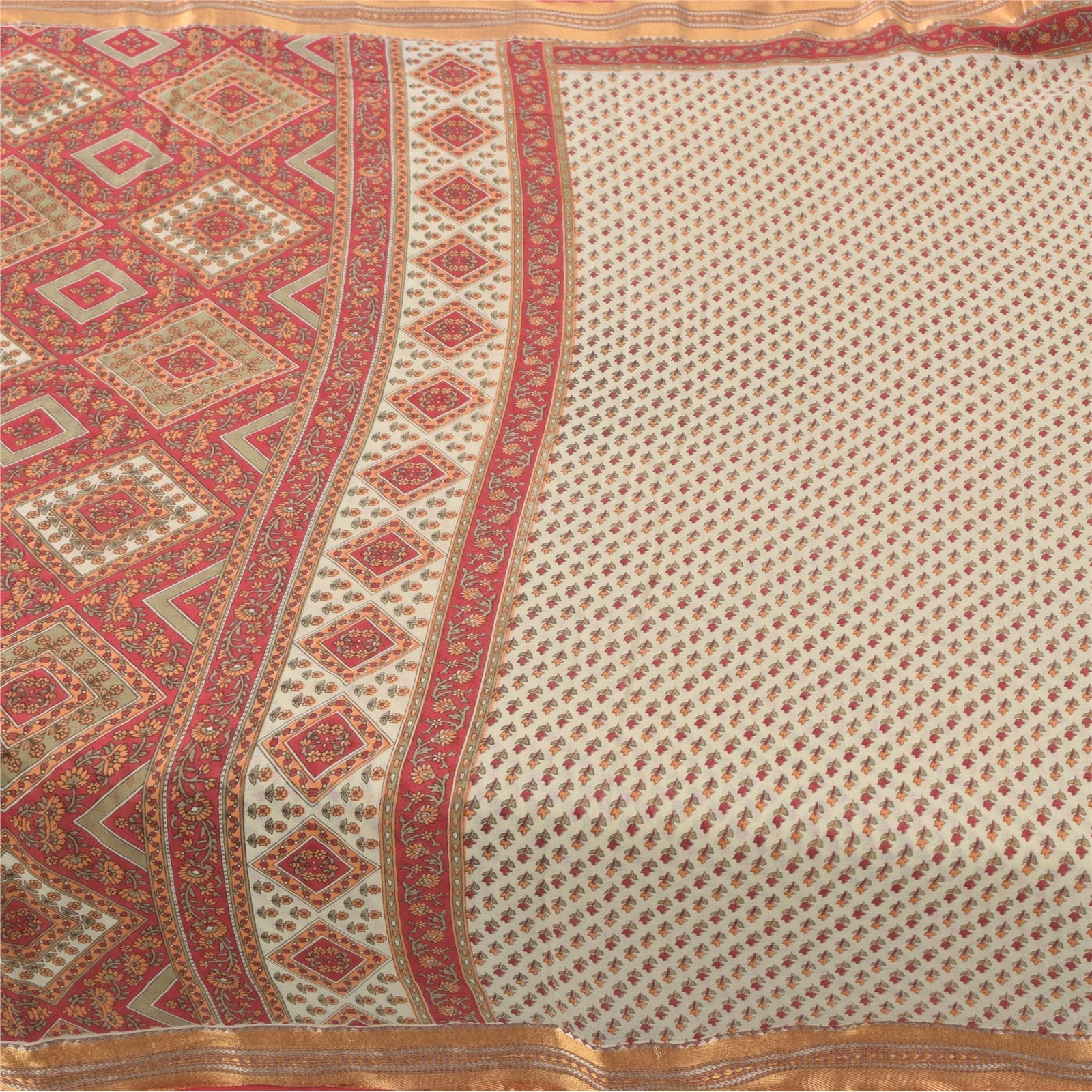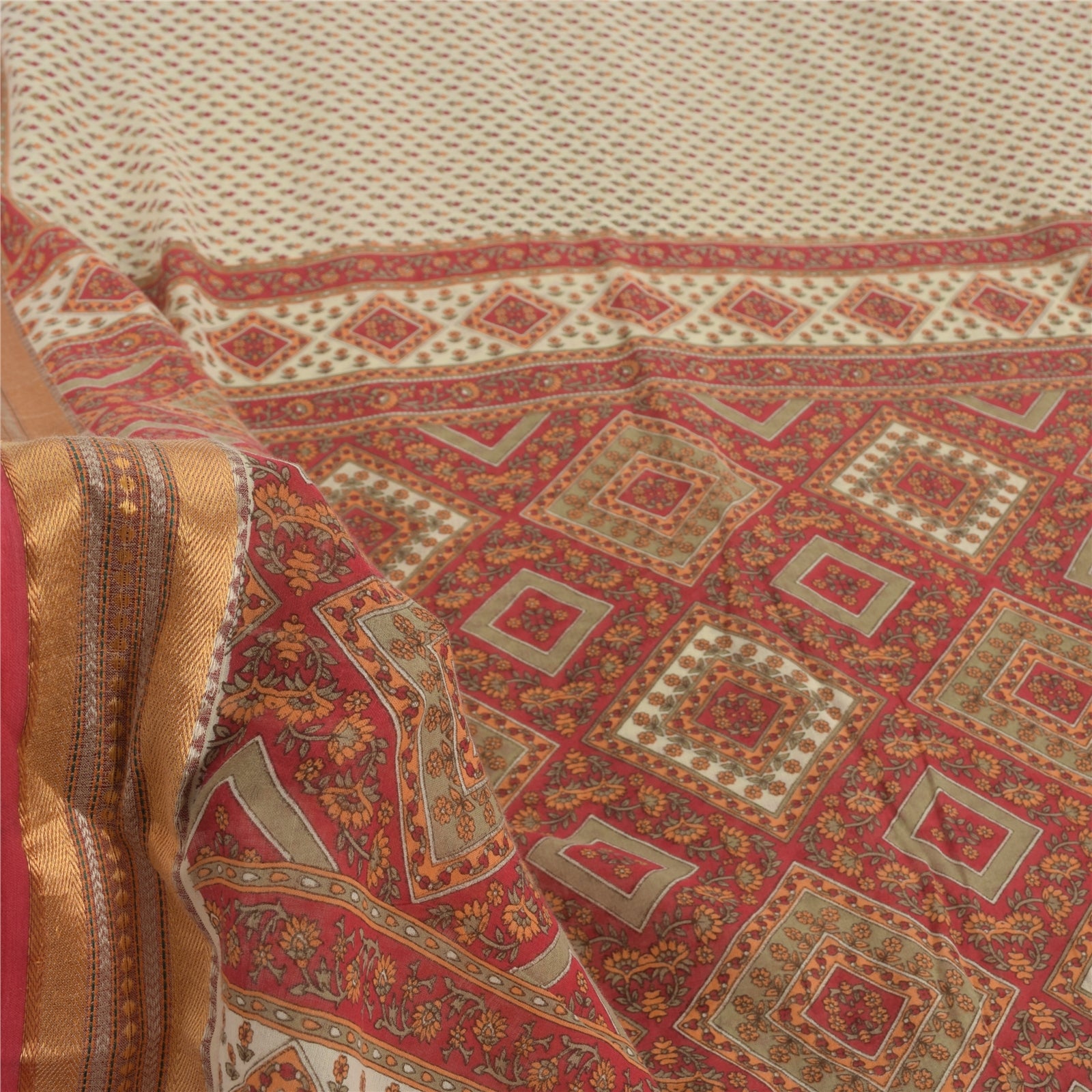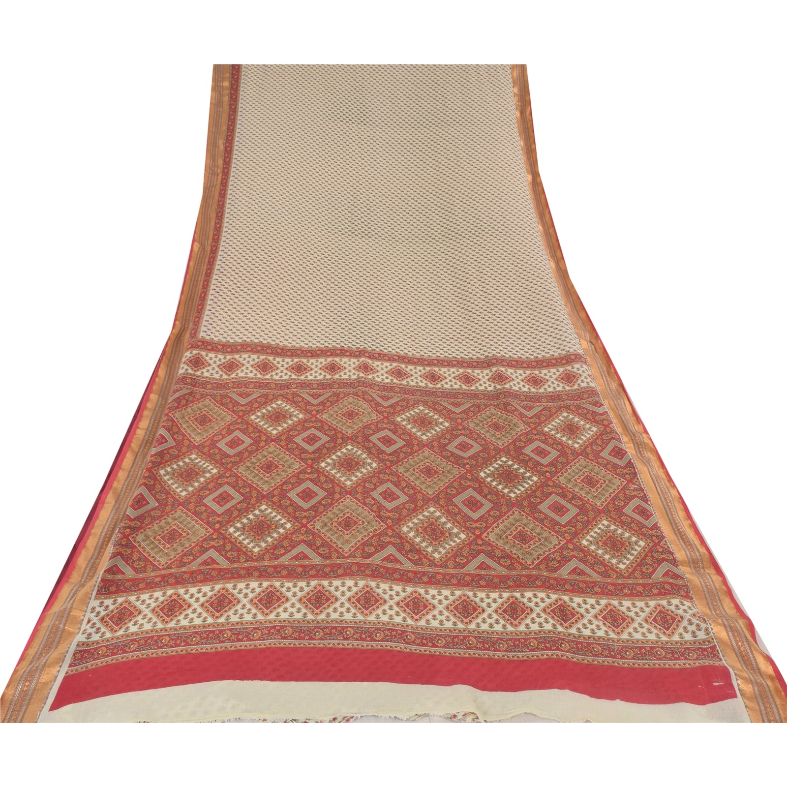 Sanskriti Vintage Sarees Indian Ivory/Red Pure Cotton Printed Sari Craft Fabric