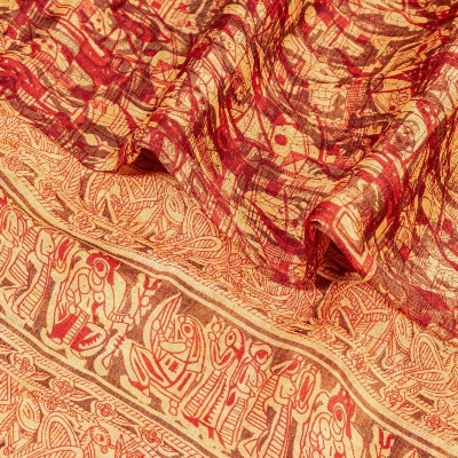Beautiful multi colored pure silk printed saree. Pallu & Border has printed human & elephat design. Abstract design in center part of saree. What is special about this saree? Fabulous design is really enhancing the beauty of the saree.This unique vintage saree can be used for various crafting ideas even if you don't want to use it as a sari. Design a dress, use it as window,dressing, upholstery, sarongs, throw, dress making and table linen much more. Let your creative juices flow and use this decorated Sustainable Fabric in multiple fashion.