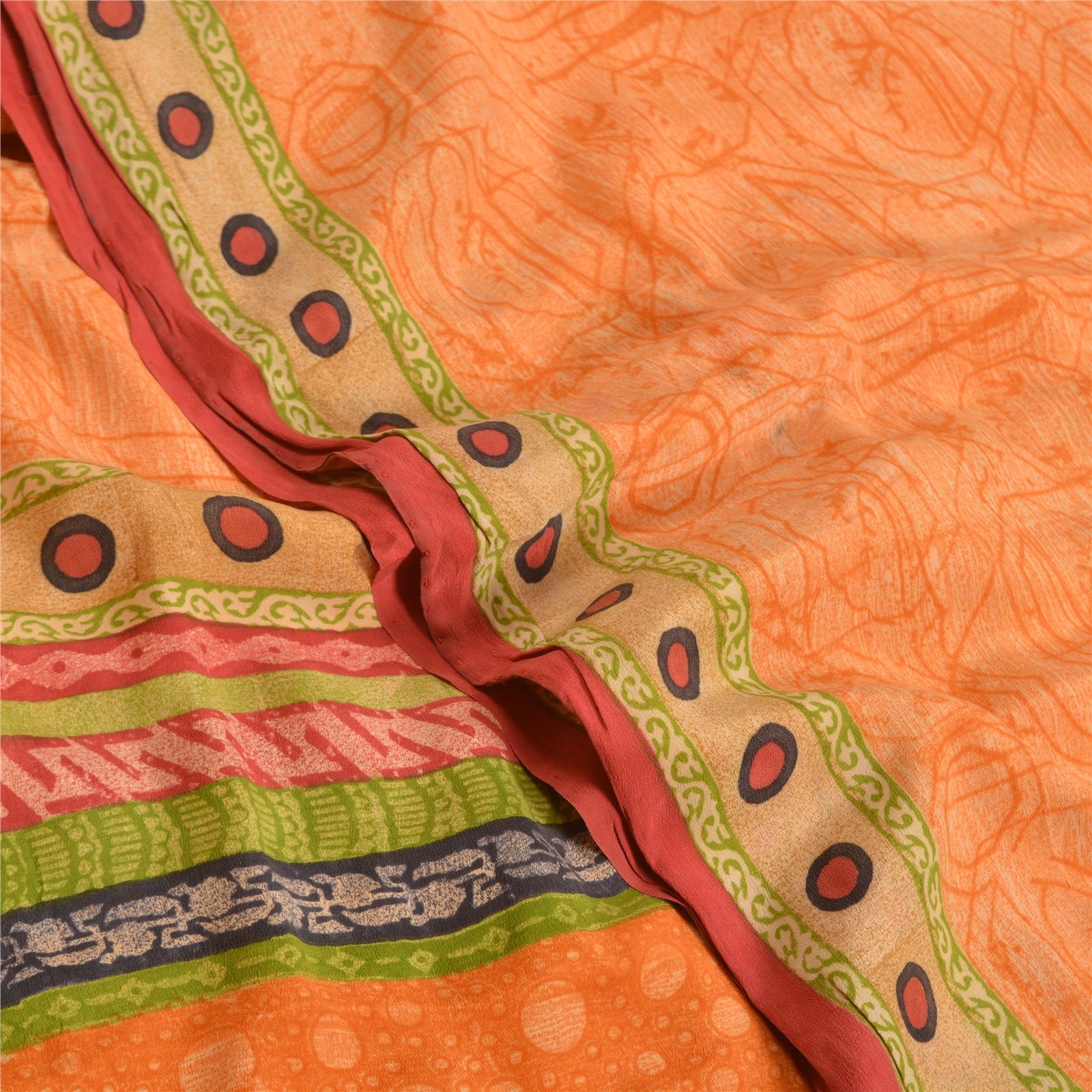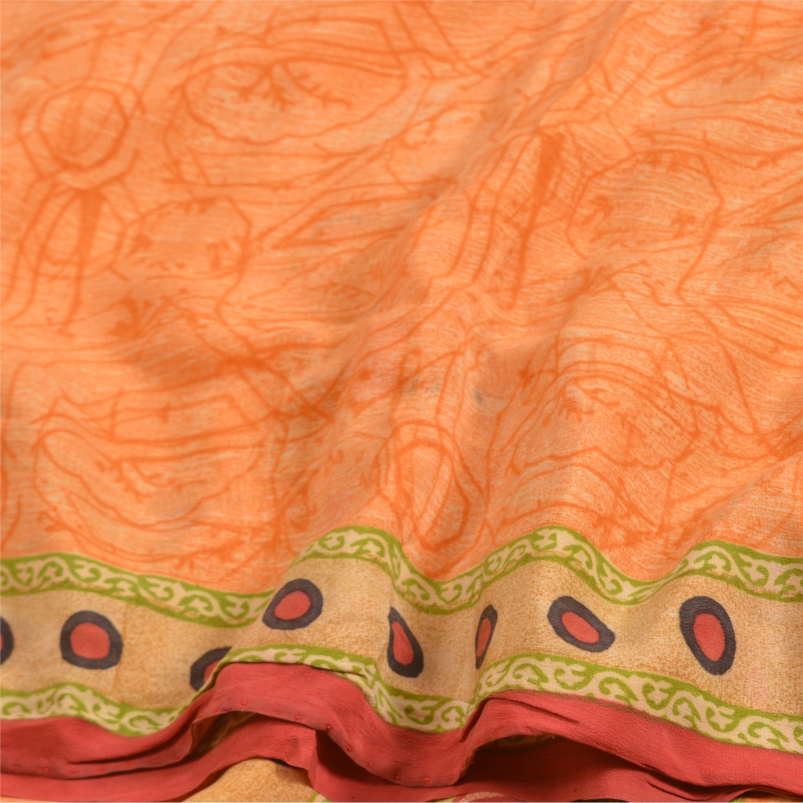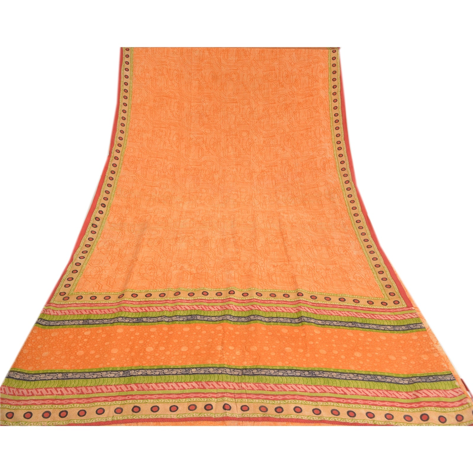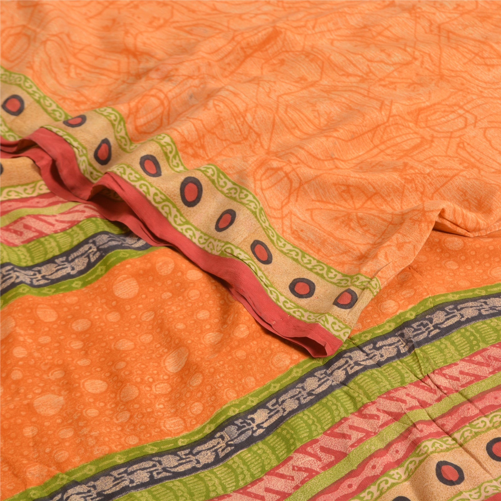 THE ITEM COLOR OR SHADE MAY BE DARKER OR LIGHTER THAN THE PICTURE.' Beautiful orange colored pure crepe silk printed saree. Pallu & Border has printed circle design. Abstract design in center part of saree. Saree has mild stain on it. What is special about this saree? Fabulous design is really enhancing the beauty of the saree. This unique vintage saree can be used for various crafting ideas even if you don't want to use it as a sari. Design a dress, use it as window,dressing, upholstery, sarongs, throw, dress making and table linen much more. Let your creative juices flow and use this decorated Sustainable Fabric in multiple fashion. International buyers please note: Import duties, taxes, and charges are not included in the item price or postage cost. These charges are the buyer's responsibility. Please check with your country's customs office to determine what these additional costs will be prior to bidding or buying.Buyer will pay custom duty/tax. It is calculated and charged differently by every country. As a seller I do not have any control over it.VAT or sales tax is calculated by the platform at the time of checkout. Customs charge is payable at the time of delivery.