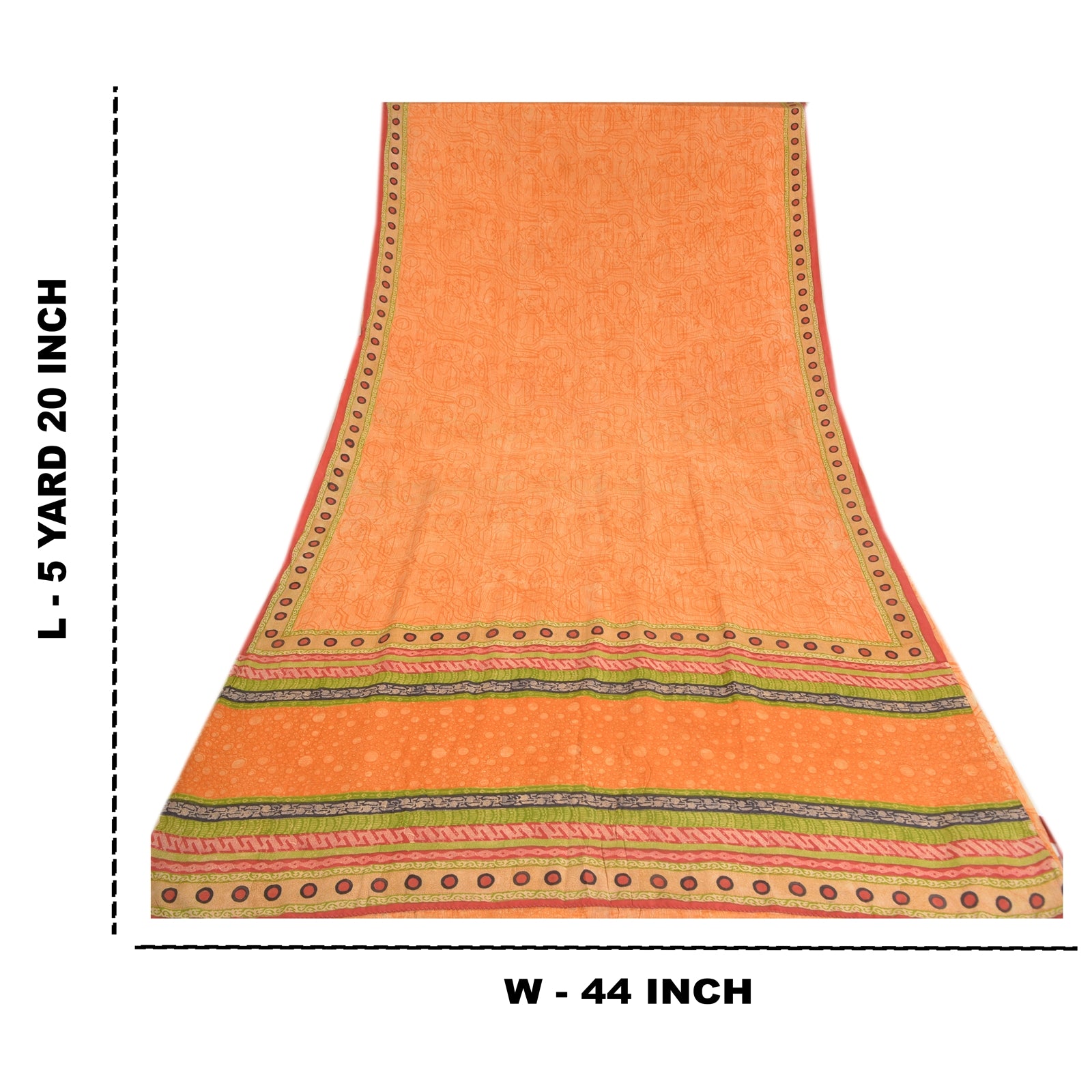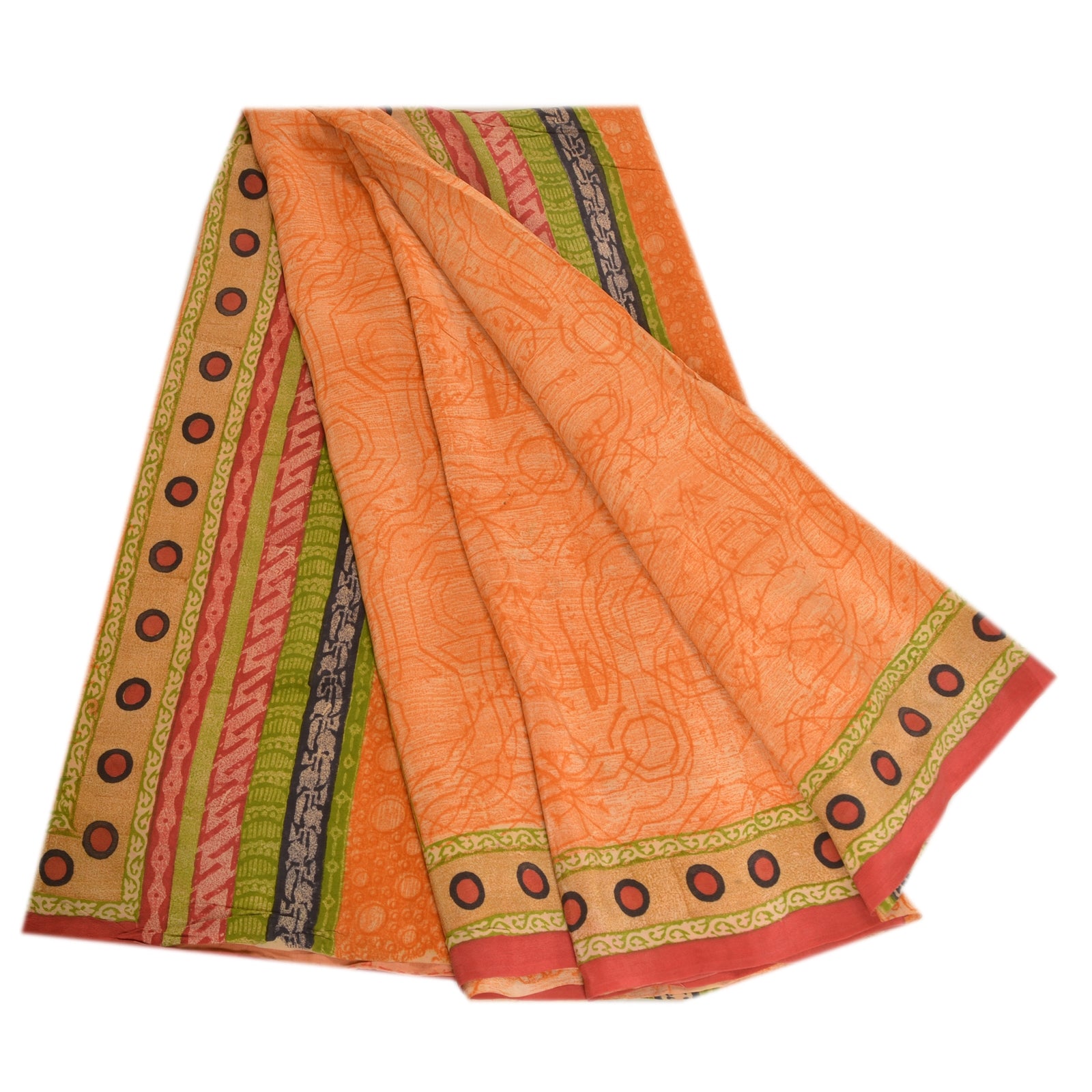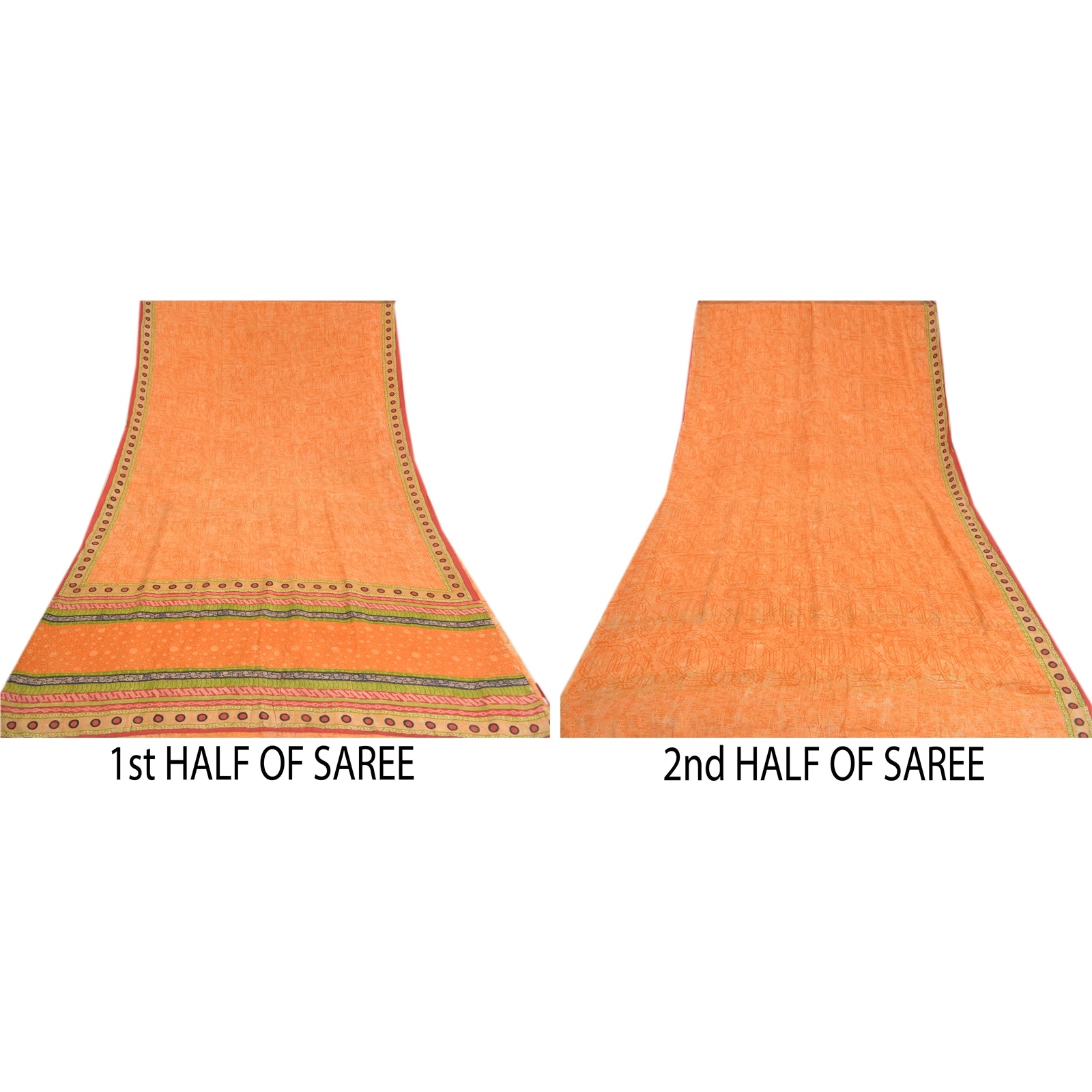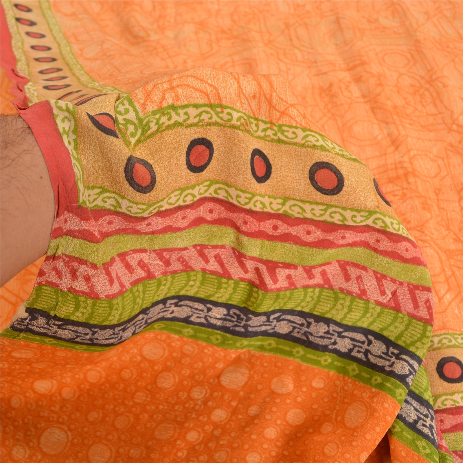 THE ITEM COLOR OR SHADE MAY BE DARKER OR LIGHTER THAN THE PICTURE.' Beautiful orange colored pure crepe silk printed saree. Pallu & Border has printed circle design. Abstract design in center part of saree. Saree has mild stain on it. What is special about this saree? Fabulous design is really enhancing the beauty of the saree. This unique vintage saree can be used for various crafting ideas even if you don't want to use it as a sari. Design a dress, use it as window,dressing, upholstery, sarongs, throw, dress making and table linen much more. Let your creative juices flow and use this decorated Sustainable Fabric in multiple fashion. International buyers please note: Import duties, taxes, and charges are not included in the item price or postage cost. These charges are the buyer's responsibility. Please check with your country's customs office to determine what these additional costs will be prior to bidding or buying.Buyer will pay custom duty/tax. It is calculated and charged differently by every country. As a seller I do not have any control over it.VAT or sales tax is calculated by the platform at the time of checkout. Customs charge is payable at the time of delivery.