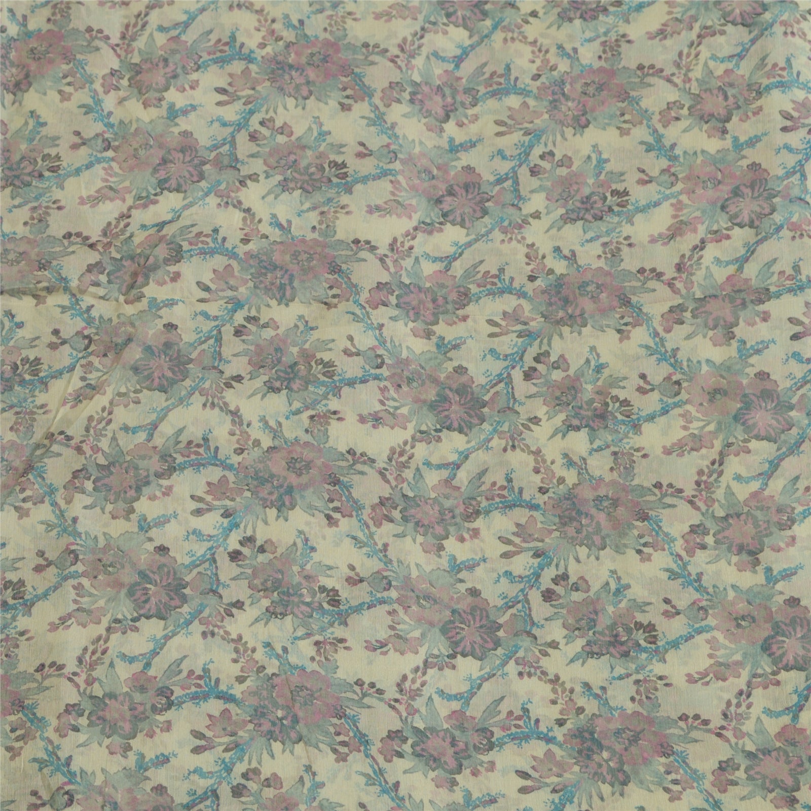 Sanskriti Vintage Sarees Ivory/Blue Pure Chiffon Silk Printed Sari Craft Sustainable Fabric