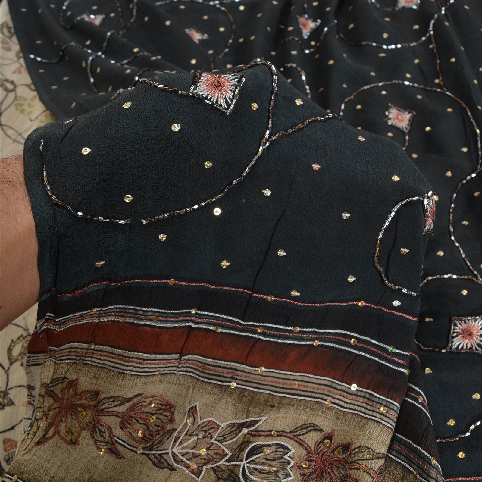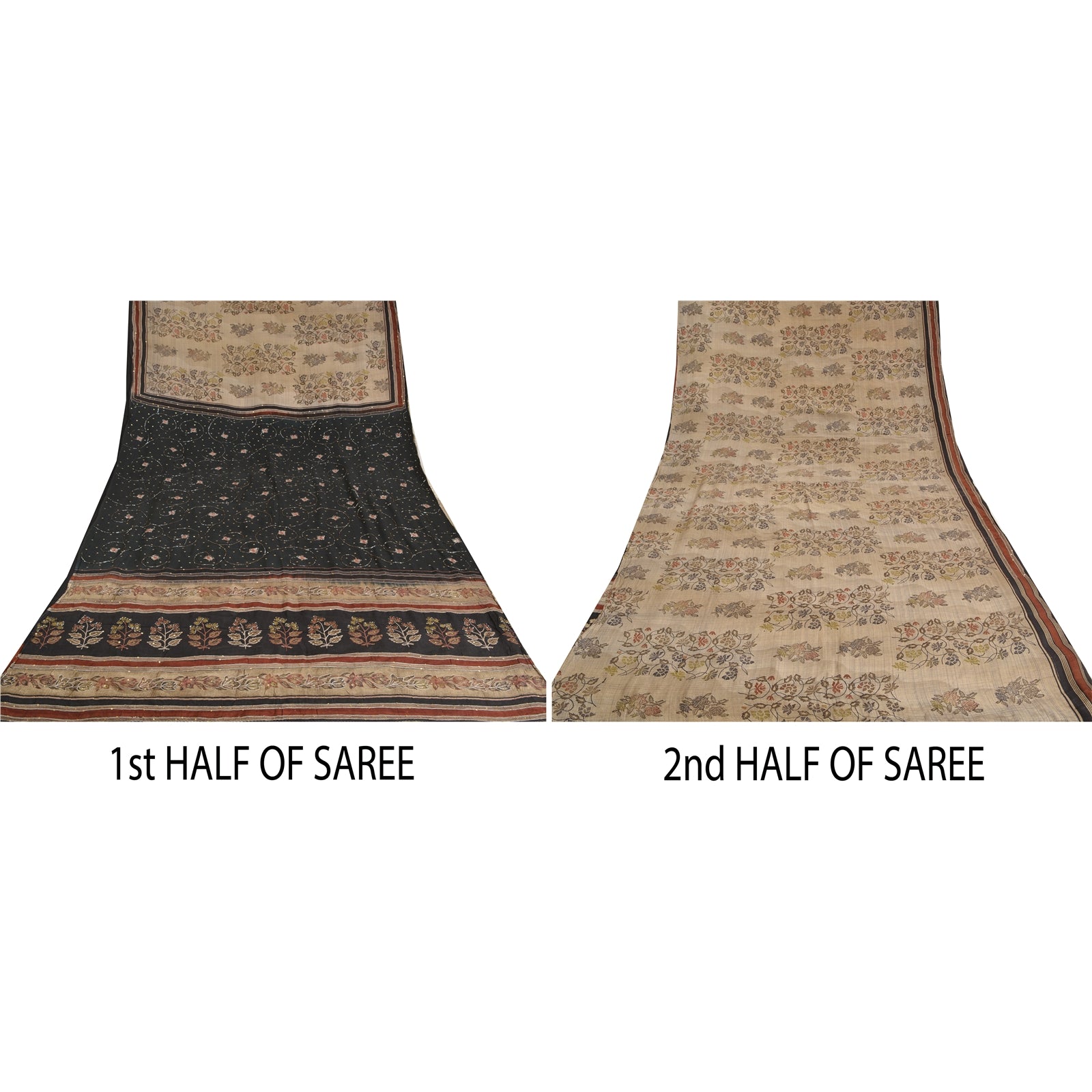 THE ITEM COLOR OR SHADE MAY BE DARKER OR LIGHTER THAN THE PICTURE.' Beautiful ivory & black colored pure crepe silk printed & hand embroidered saree. Pallu & Border has printed floral design with sequins & thread work. Similar work in center part of saree..What is special about this saree? Fabulous design is really enhancing the beauty of the saree. This unique vintage saree can be used for various crafting ideas even if you don't want to use it as a sari. Design a dress, use it as window,dressing, upholstery, sarongs, throw, dress making and table linen much more. Let your creative juices flow and use this decorated Sustainable Fabric in multiple fashion. International buyers please note: Import duties, taxes, and charges are not included in the item price or postage cost. These charges are the buyer's responsibility. Please check with your country's customs office to determine what these additional costs will be prior to bidding or buying.Buyer will pay custom duty/tax. It is calculated and charged differently by every country. As a seller I do not have any control over it.VAT or sales tax is calculated by the platform at the time of checkout. Customs charge is payable at the time of delivery.