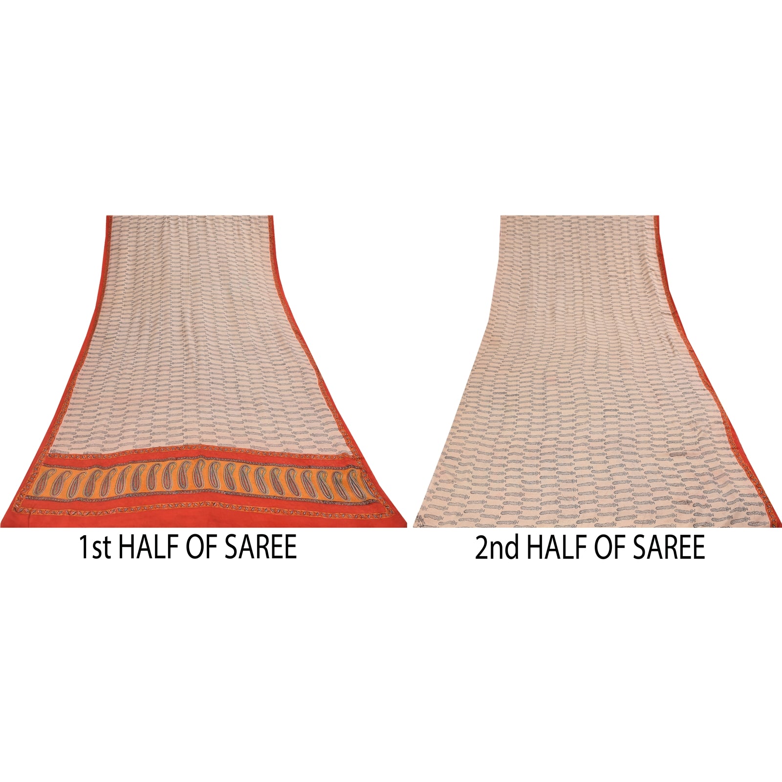 Sanskriti Vintage Sarees Ivory Pure Crepe Hand BlockPrint Sari 5+yd Craft Fabric