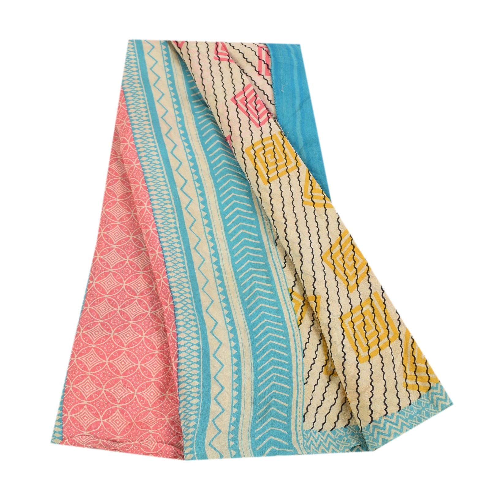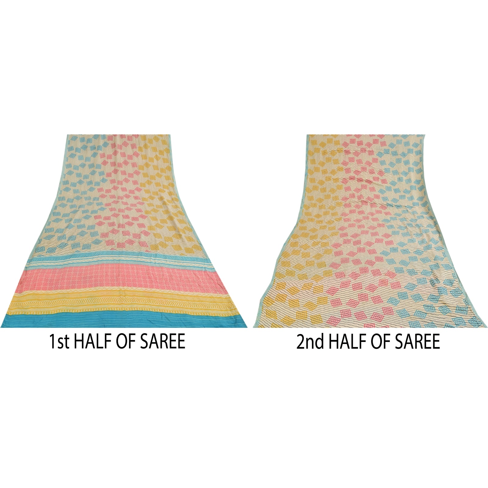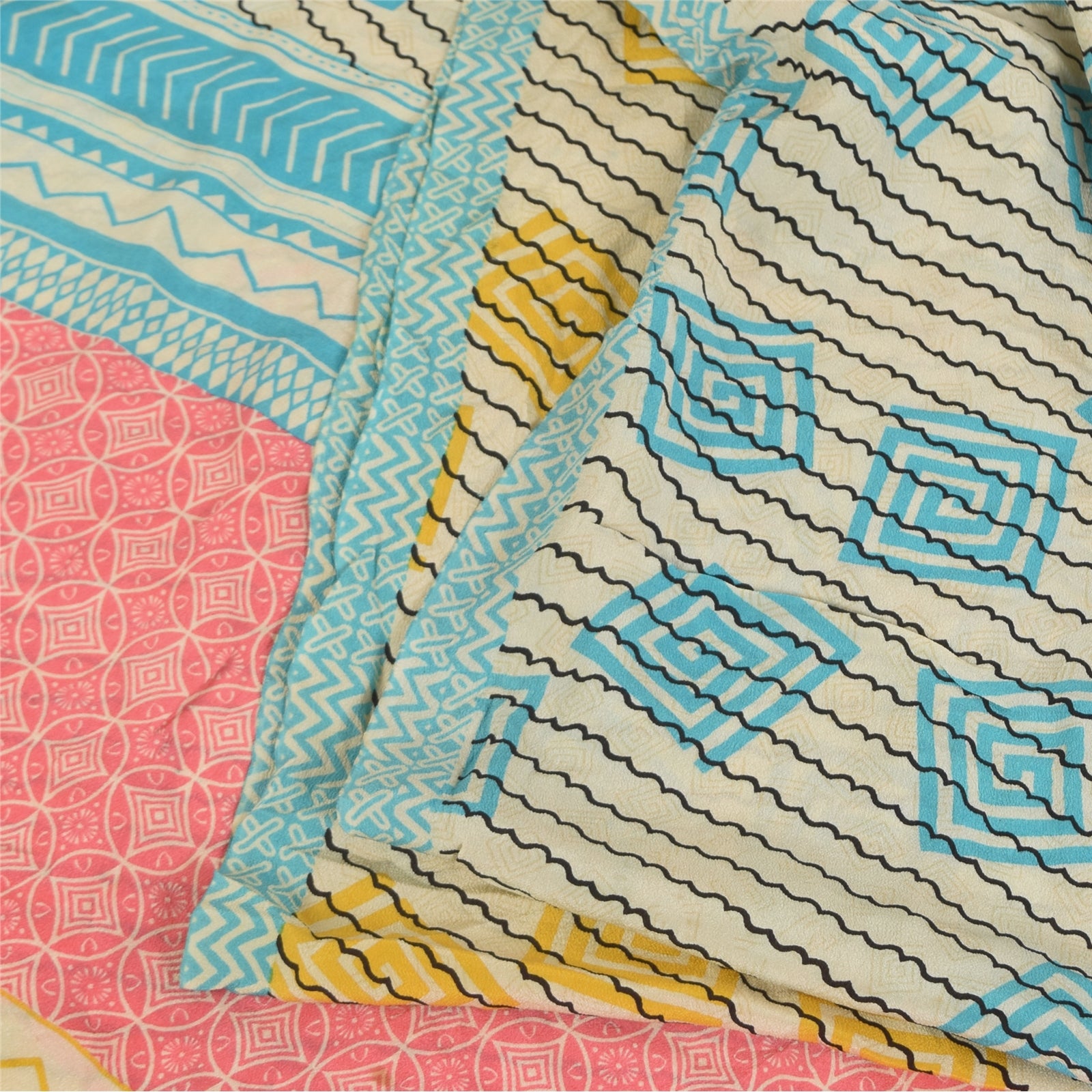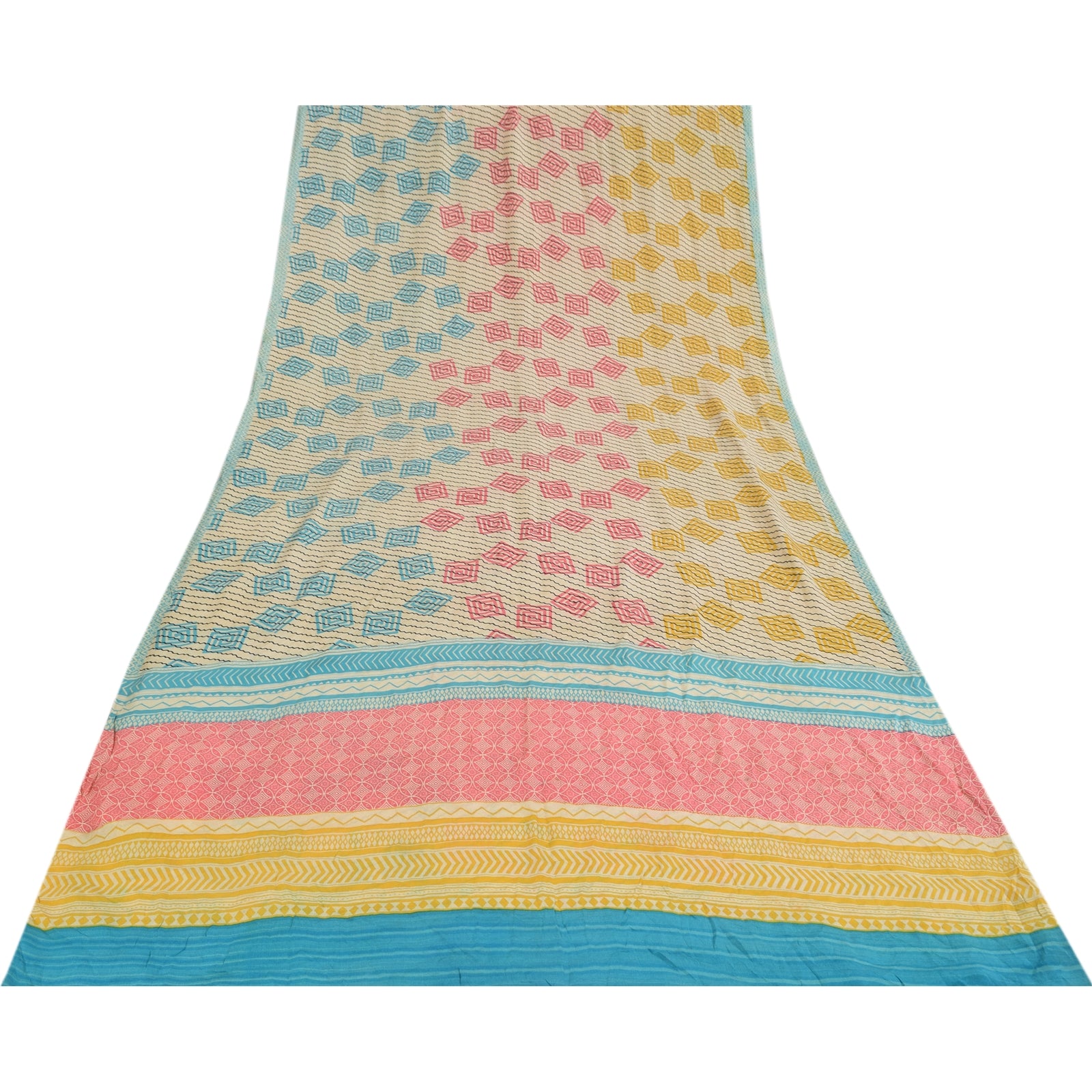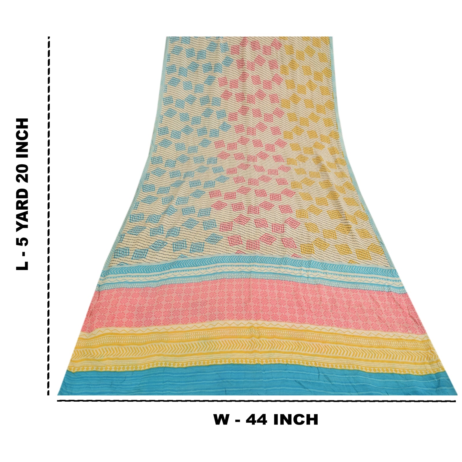 Sanskriti Vintage Sarees Ivory Pure Crepe Silk Printed Sari 5+yd Craft Fabric