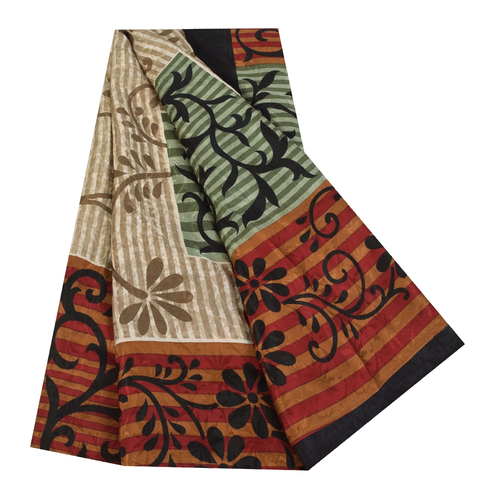 Sanskriti Vintage Sarees Ivory Pure Crepe Silk Printed Sari 5+yd Craft Sustainable Fabric