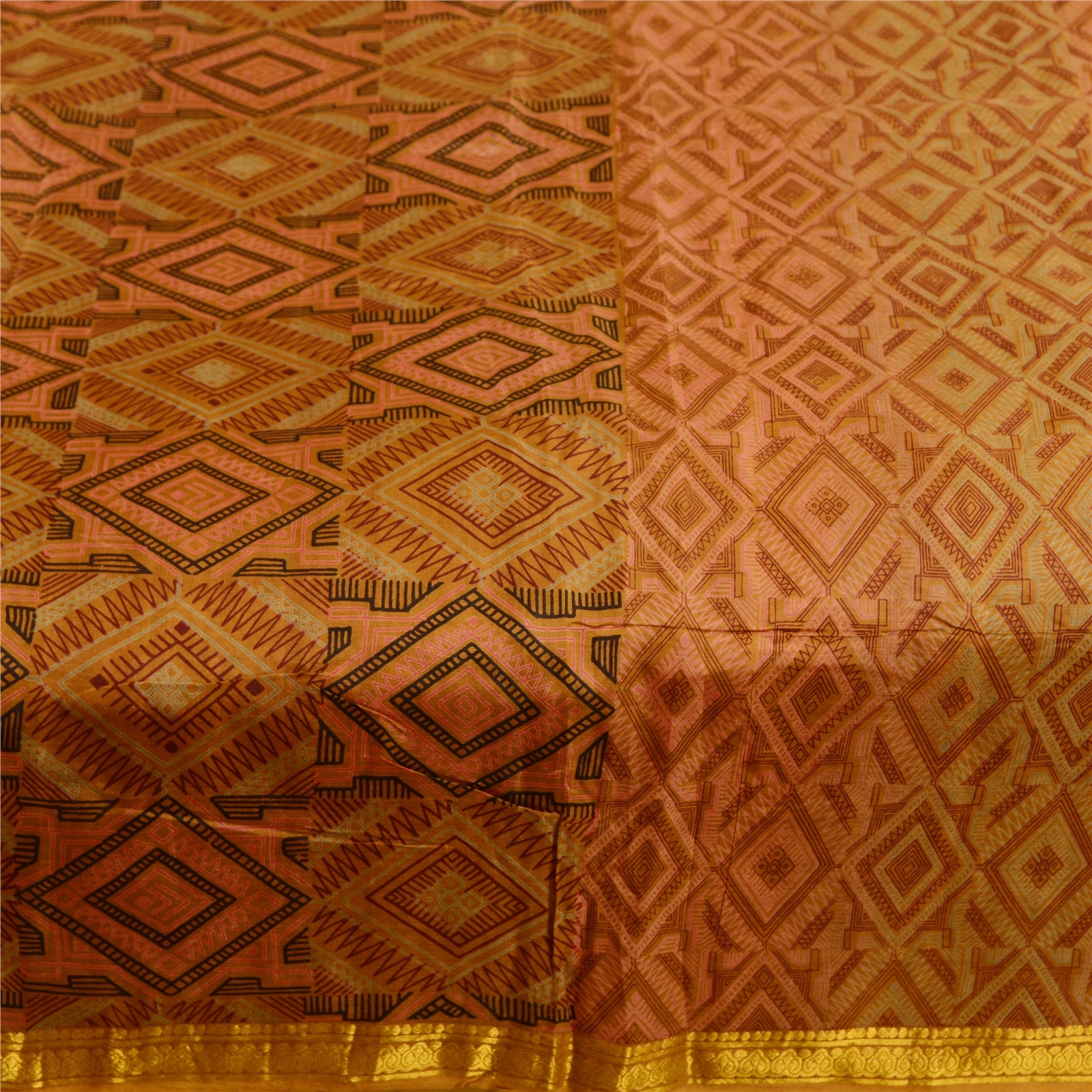 Beautiful multi colored pure silk printed saree. Pallu & Border has printed geometric design & golden zari woven work. Similar design in center part of saree. What is special about this saree? Fabulous design is really enhancing the beauty of the saree.This unique vintage saree can be used for various crafting ideas even if you don't want to use it as a sari. Design a dress, use it as window,dressing, upholstery, sarongs, throw, dress making and table linen much more. Let your creative juices flow and use this decorated Sustainable Fabric in multiple fashion.
