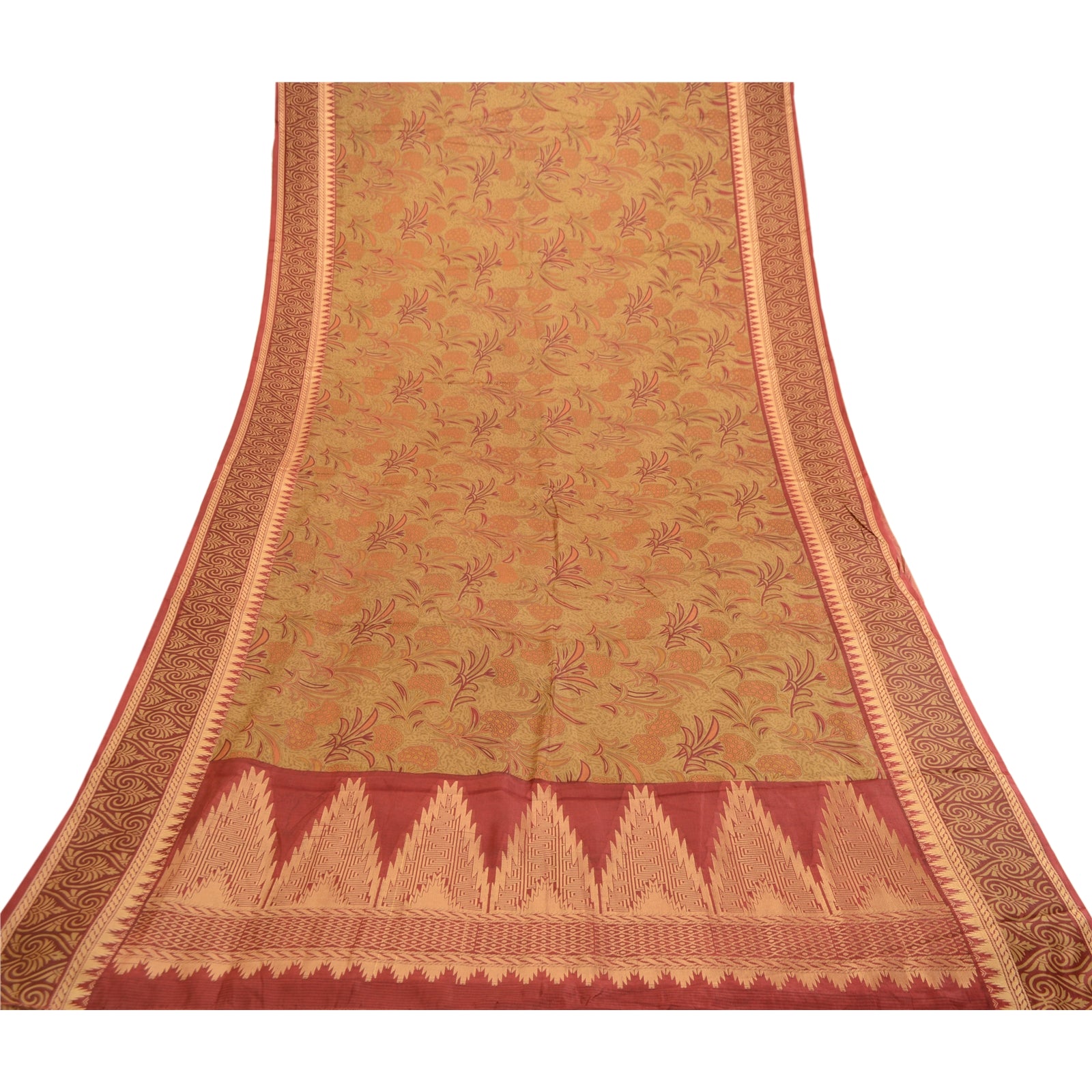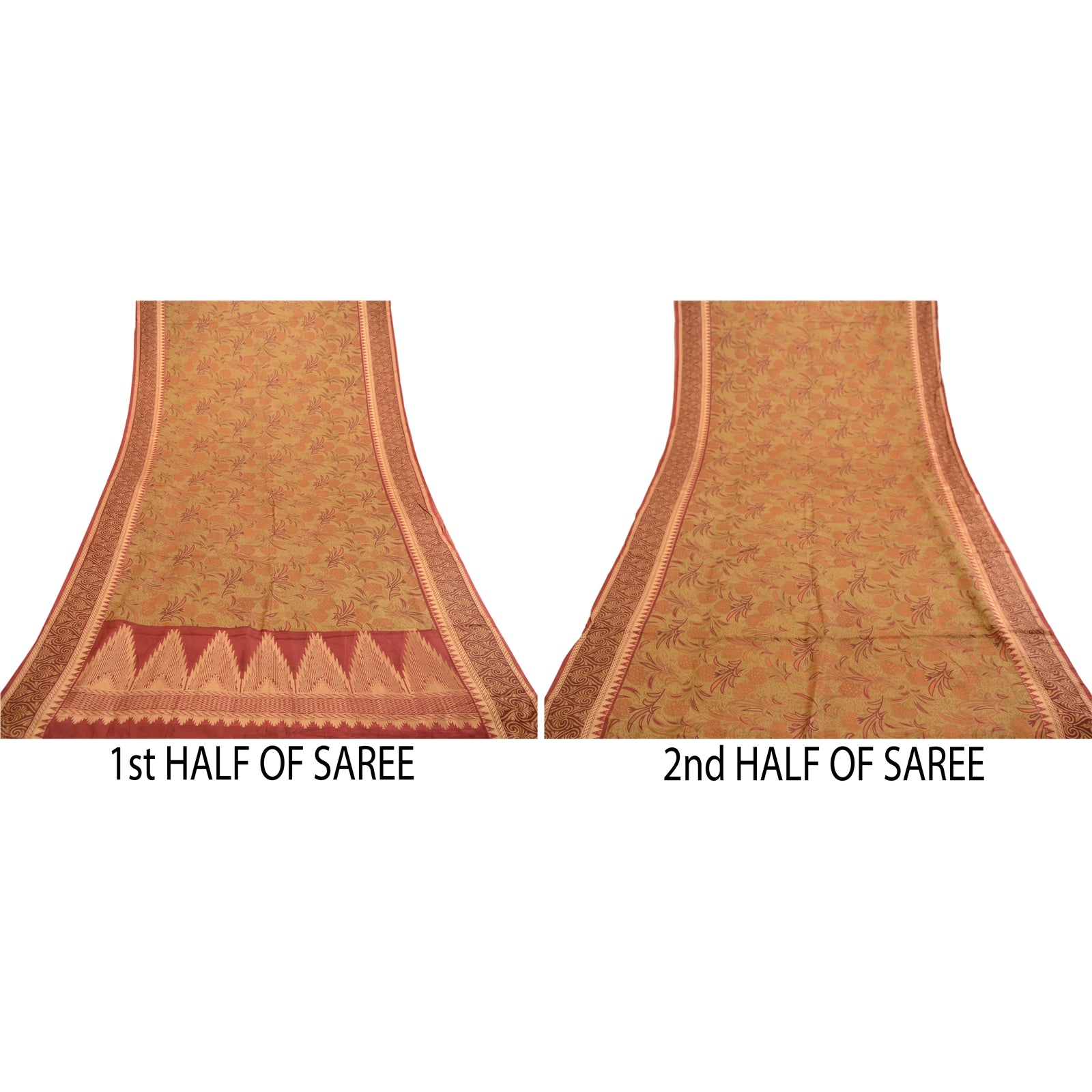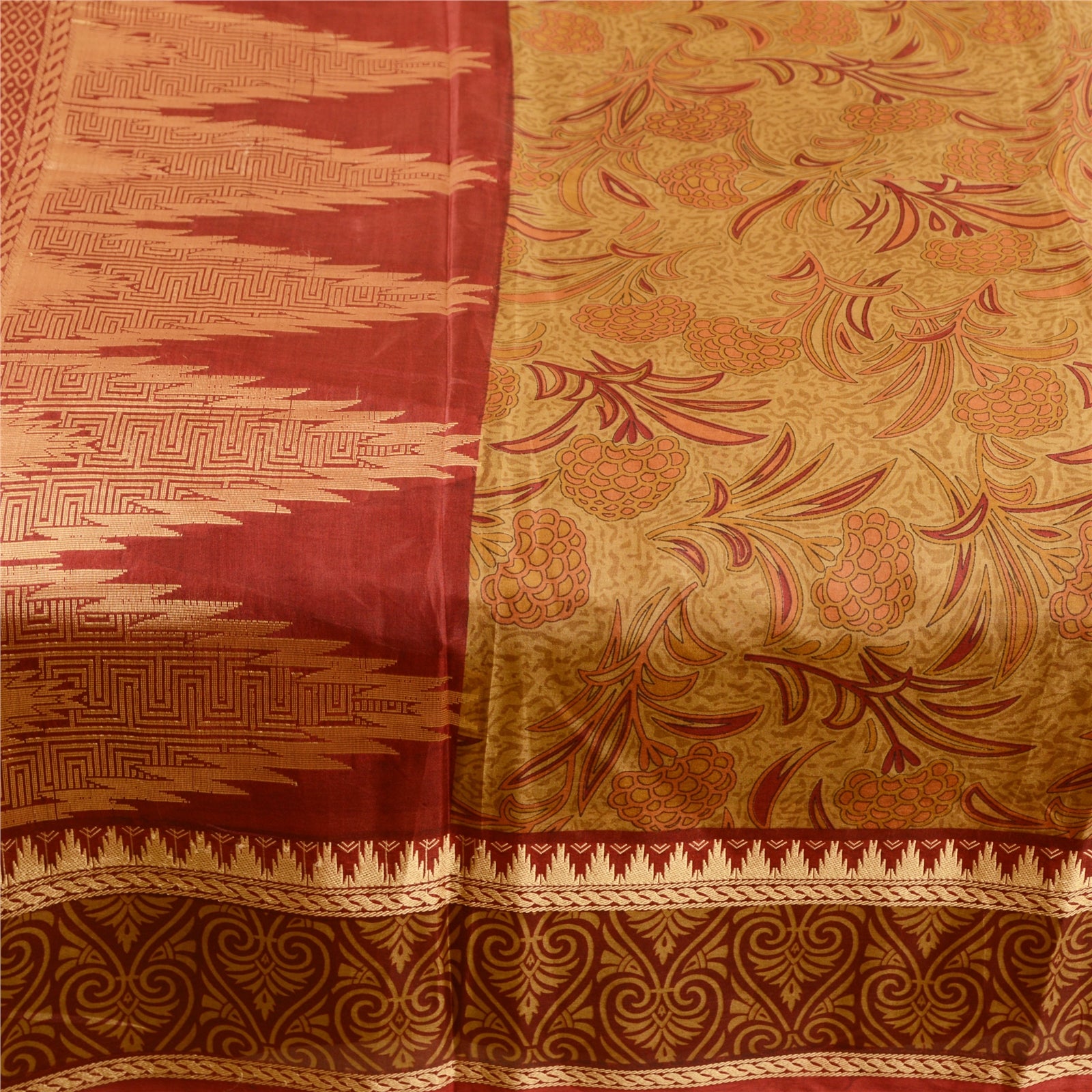 Beautiful mustard green & red colored pure silk printed saree. Pallu & Border has floral & geometric design with golden woven work. Printed floral design in center part of saree. What is special about this saree? Fabulous design is really enhancing the beauty of the saree.This unique vintage saree can be used for various crafting ideas even if you don't want to use it as a sari. Design a dress, use it as window,dressing, upholstery, sarongs, throw, dress making and table linen much more. Let your creative juices flow and use this decorated Sustainable Fabric in multiple fashion.